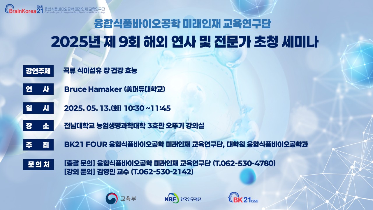 4단계 BK21 융합식품바이오공학 미래인재 교육연구단에서 「2025학년도 제9회 해외 연사 및 전문가 초청 세미나」를 개최합니다.