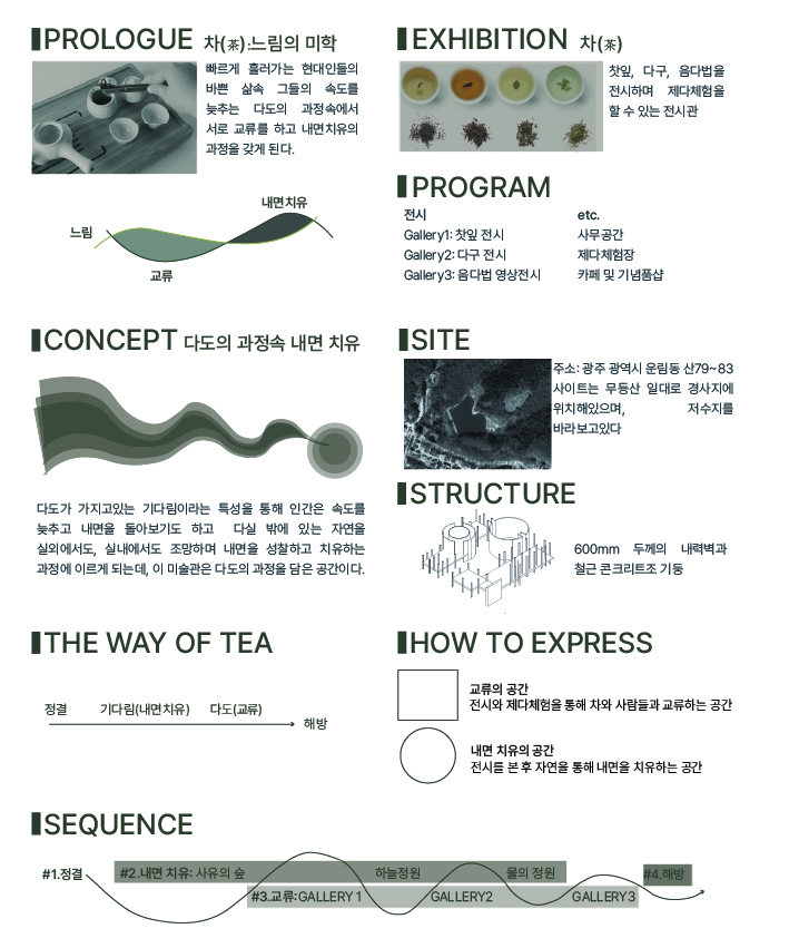 현대인은 빠르게 흘러가는 삶의 속도 속에서 자신을 잃어버린 채 부유한다. 본 프로젝트는 대화와 성찰을 통해 삶의 속도를 늦추는 ‘다도(茶道)’의 가치에 주목하여, 인간의 시간을 확장하는 건축적 장치로서 티뮤지엄 ‘연시’를 제안한다.