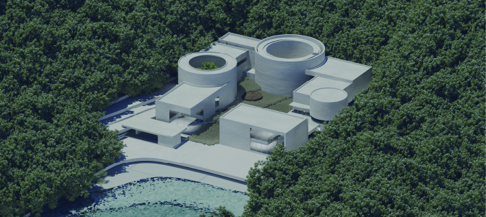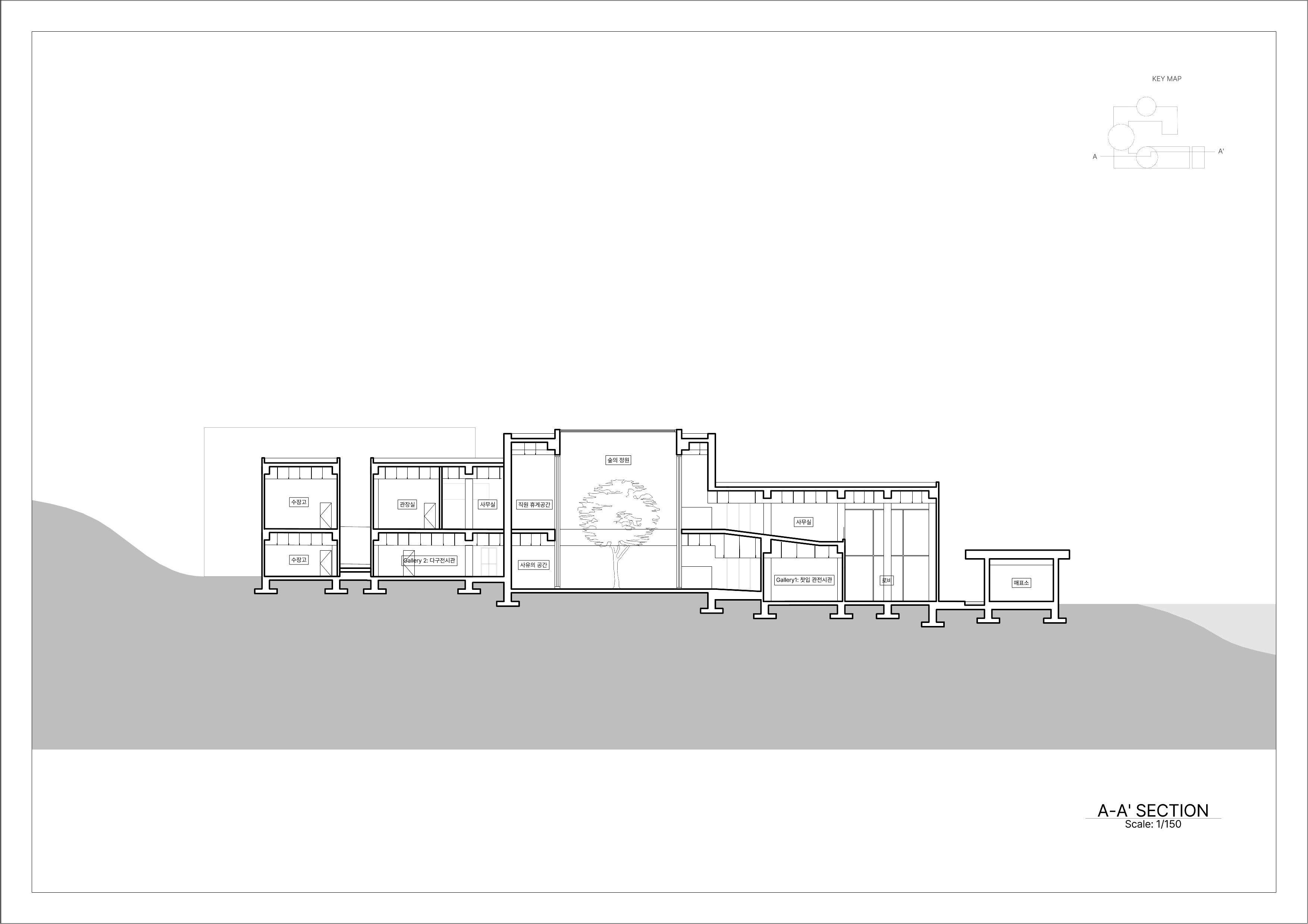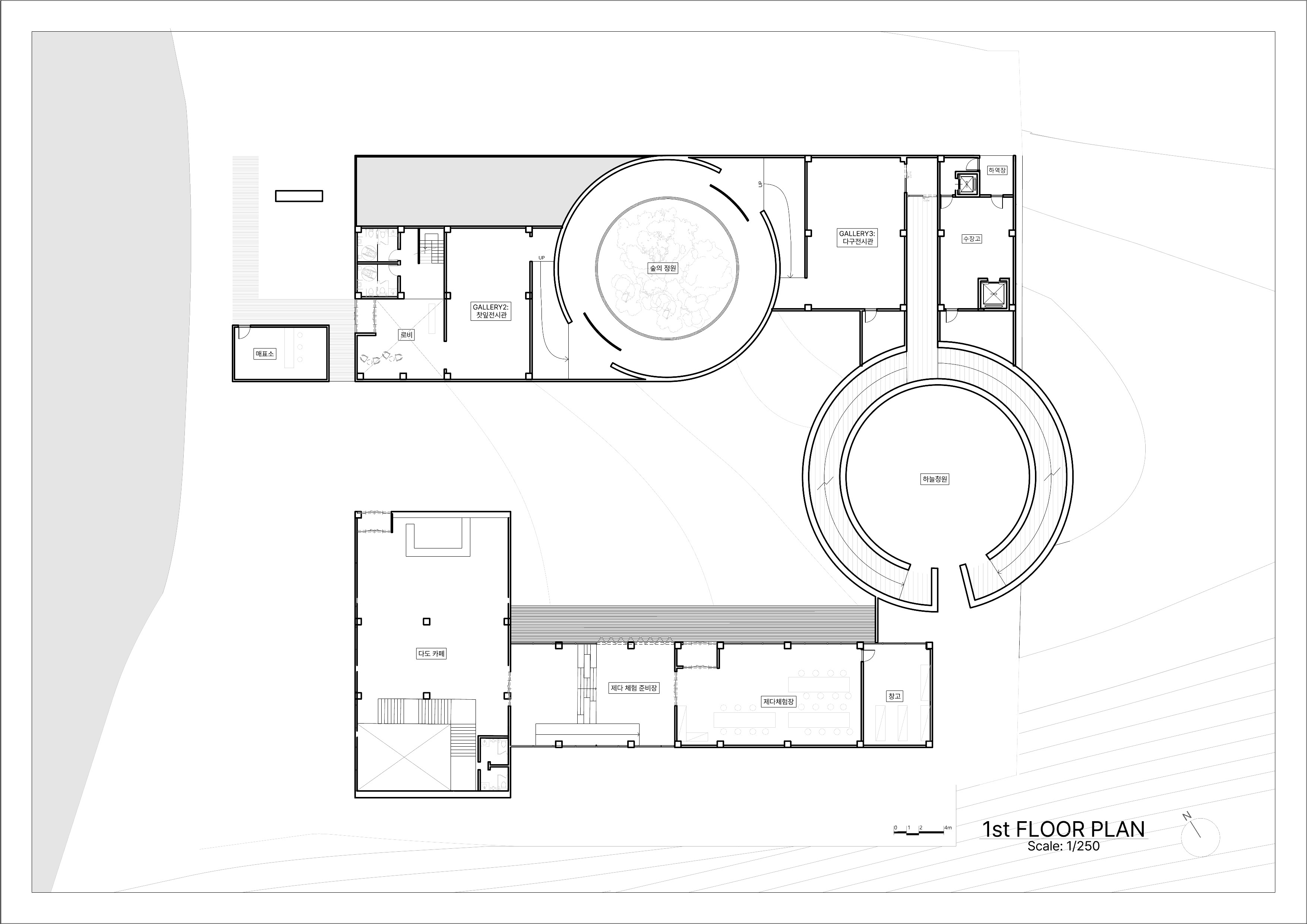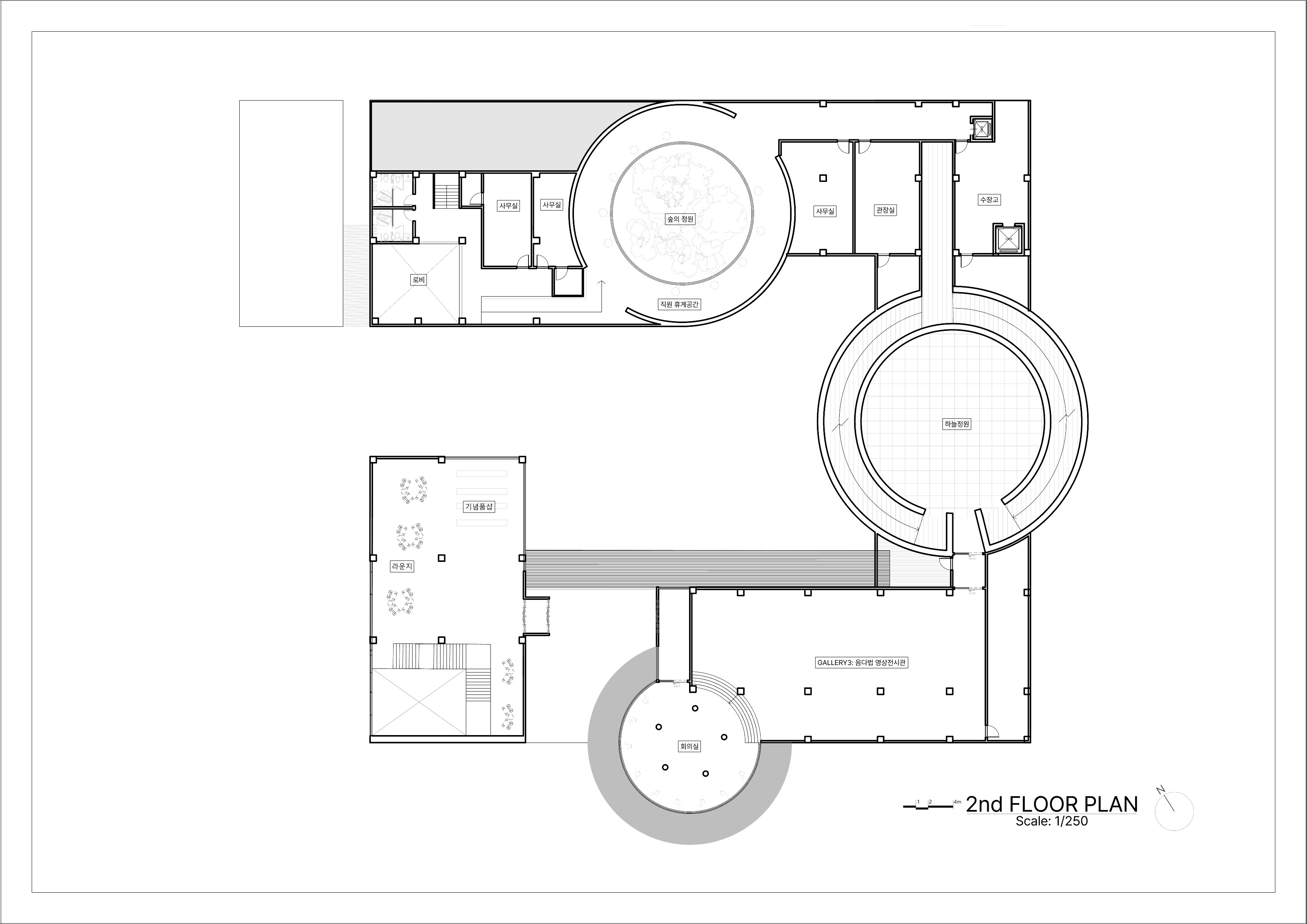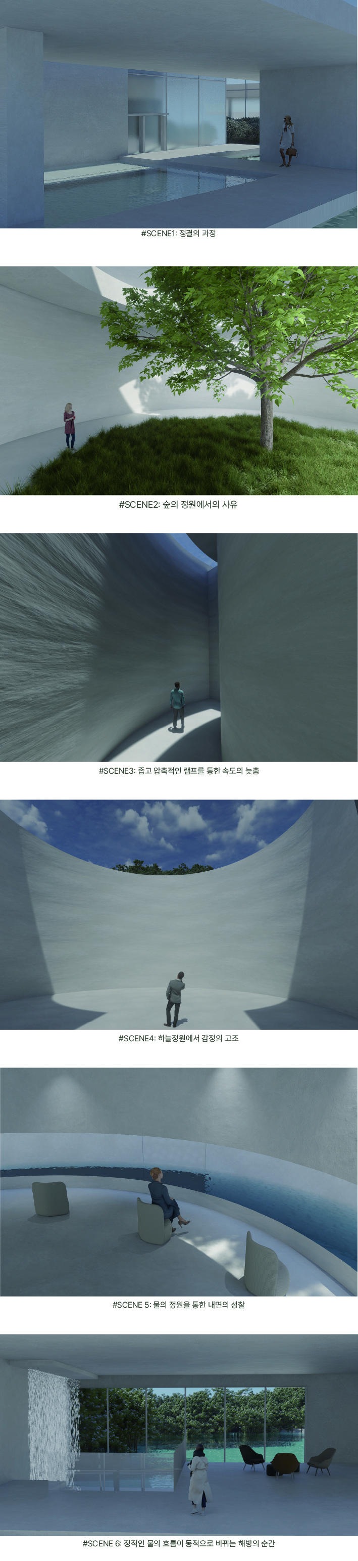 설계는 교류의 사각형 매스와 치유의 원통형 매스의 기하학적 대비를 기반으로 한다. 사각형 매스는 사회적 상호작용과 대화가 일어나는 ‘교류’의 장으로서 타인과 연결되는 공간감을 제공하며, 원통형 매스는 시선을 내부로 수렴시켜 외부와 단절된 채 자신에게 집중하는 ‘치유’의 공간을 의미한다. 관람객은 정결의 공간을 지나 기다림과 교류가 반복되는 동선을 통해 점진적인 심리적 해방에 이르게 된다.