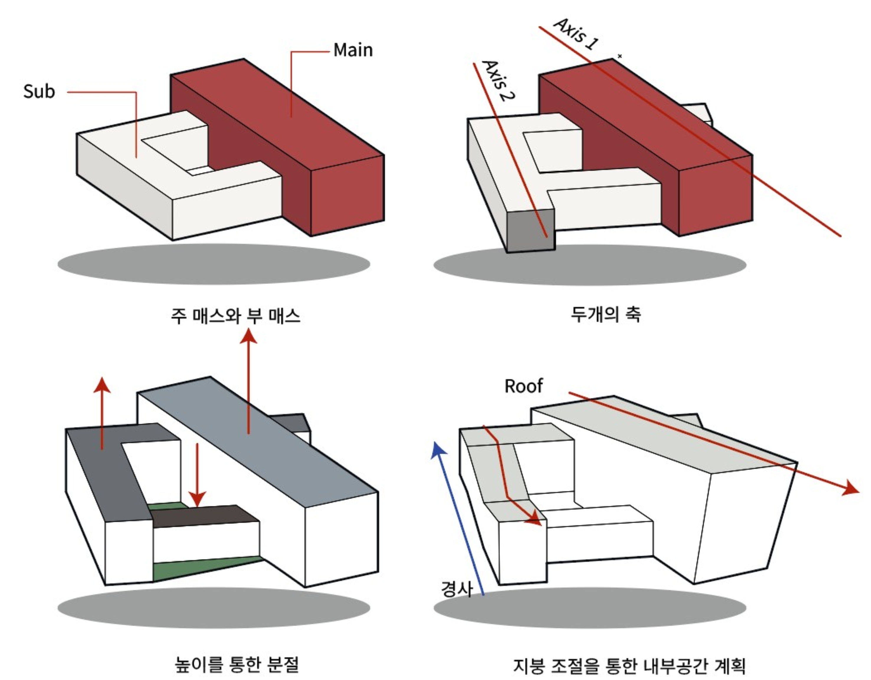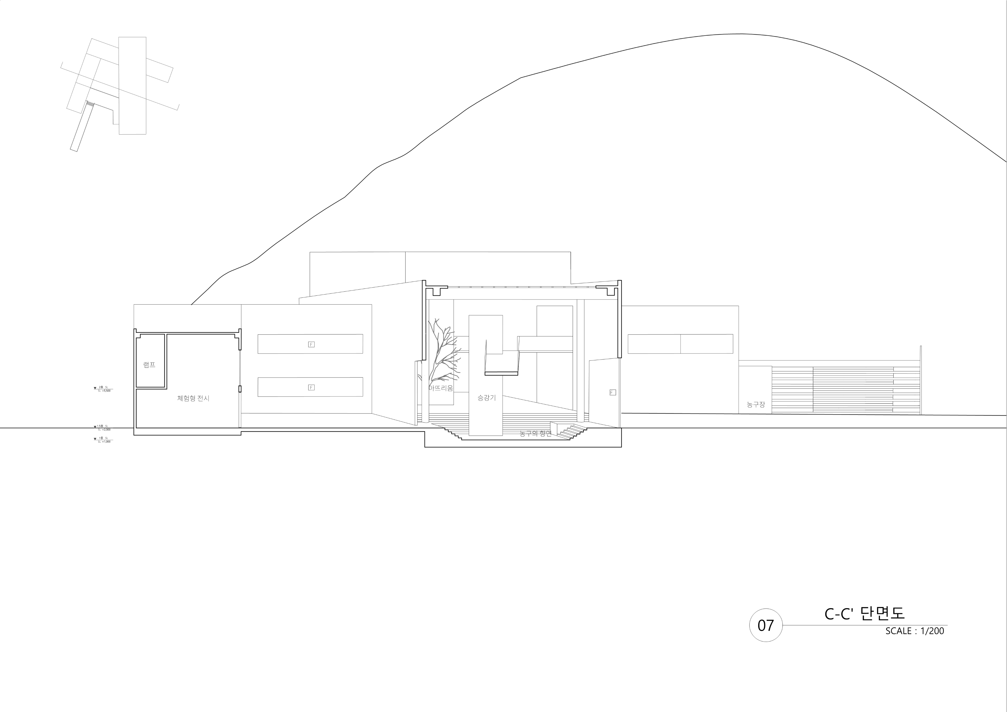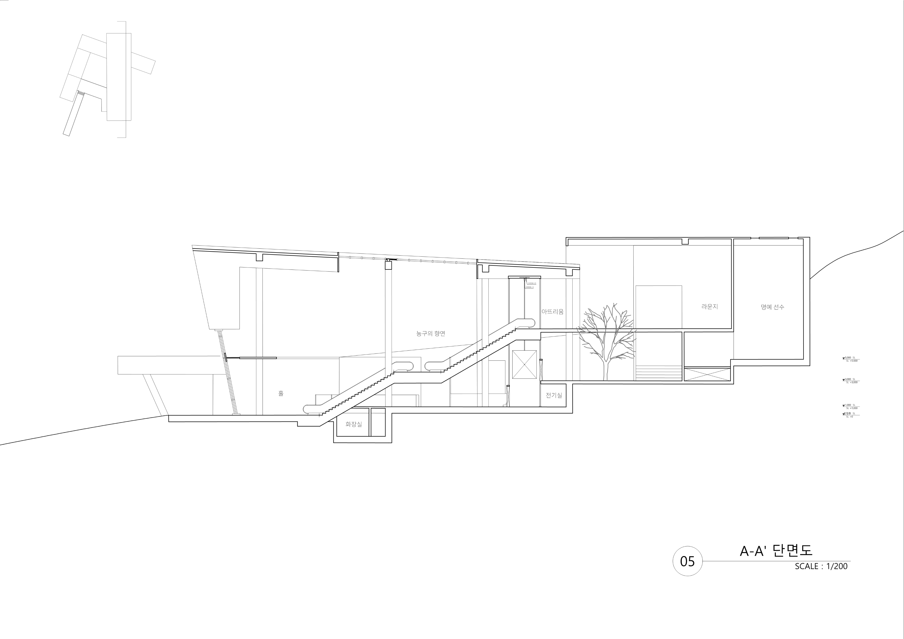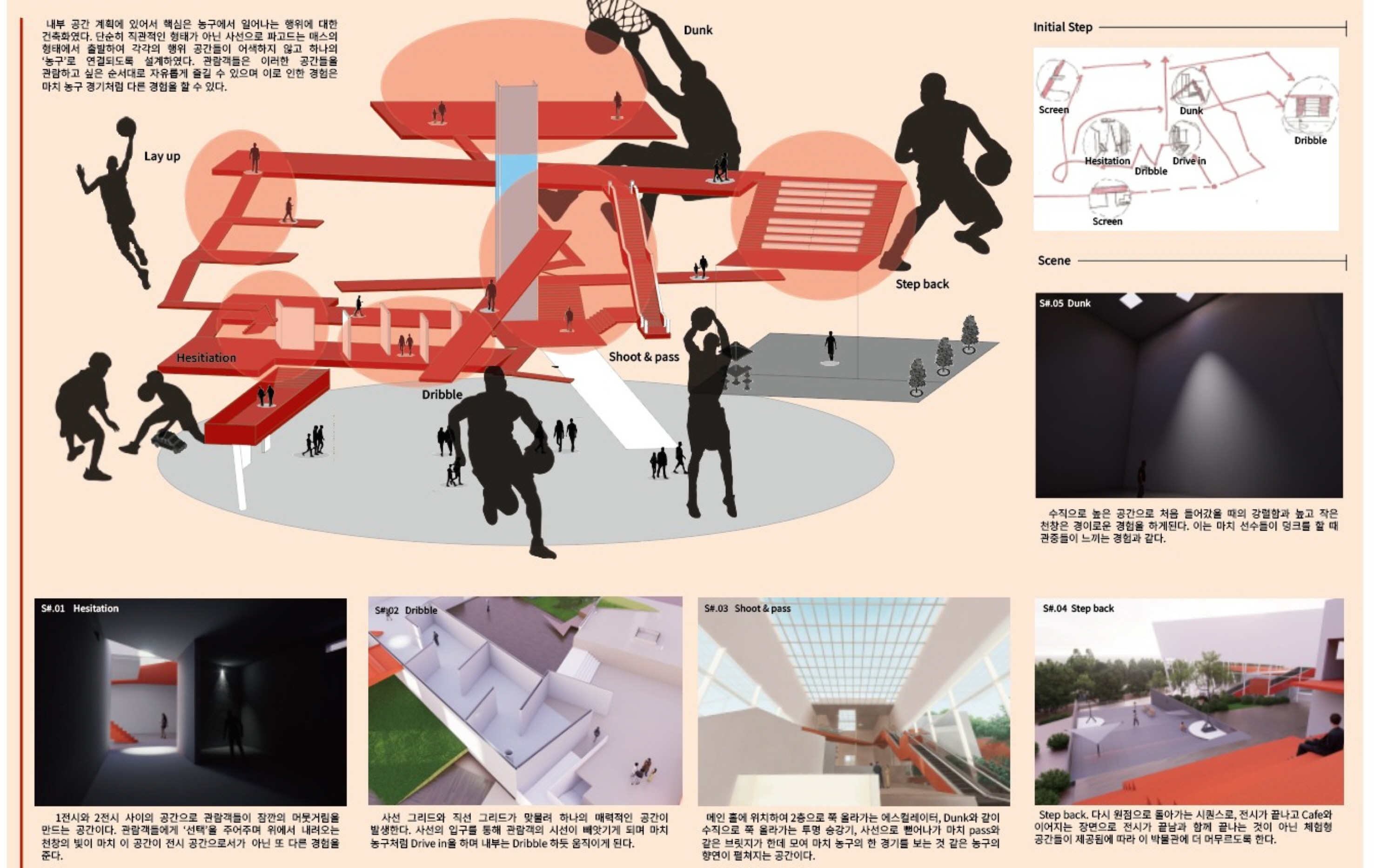 고귀하거나 아름다운 작품을 전시하는 박물관에서 벗어나 관람객이 직접 ‘선택’하고 움직이는 박물관을 목표로 설계하였다. 선수와 관련된 전시물과 플레이들을 벽과 바닥을 통해 실제로 농구를 플레이하는 듯한 느낌을 주려고 하였다. 이 박물관은 ‘농구’라는 주제로 각각의 농구 동작을 ‘Dinamic-static, Virtical- Horizontal, speed’의 기준을 가지고 분류하였으며 이를 공간 간의 흐름과 Scene에 녹여내어 건축화하는 작업을 진행하였다. 이때 사용한 언어는 ‘파고들다, 속도감 있다. 높다.’이다. 이는 ‘부’ 매스가 ‘주’ 매스를 파고드는 형태로 드러나며 각각의 공간을 ‘온전히’ 경험하는 동선과 ‘빠르게’가로지르는 동선을 만들어 관람객들이 결정할 수 있는 ‘선택권’을 주었다. 이 모든 것을 보여줄 수 있는 중앙 홀을 계획하여 높은 천장과 마치 농구 그물망 같은 천창에서 쏟아지는 빛이 하나의 농구 코트로 입장하는 듯한 연출을 하였다. 이러한 박물관은 단순히 일회성이 강한 박물관이 아닌 편하게 접근하여 같이 뛰어놀 수 있는 만남의 장을 만드는 것이 목표이다.