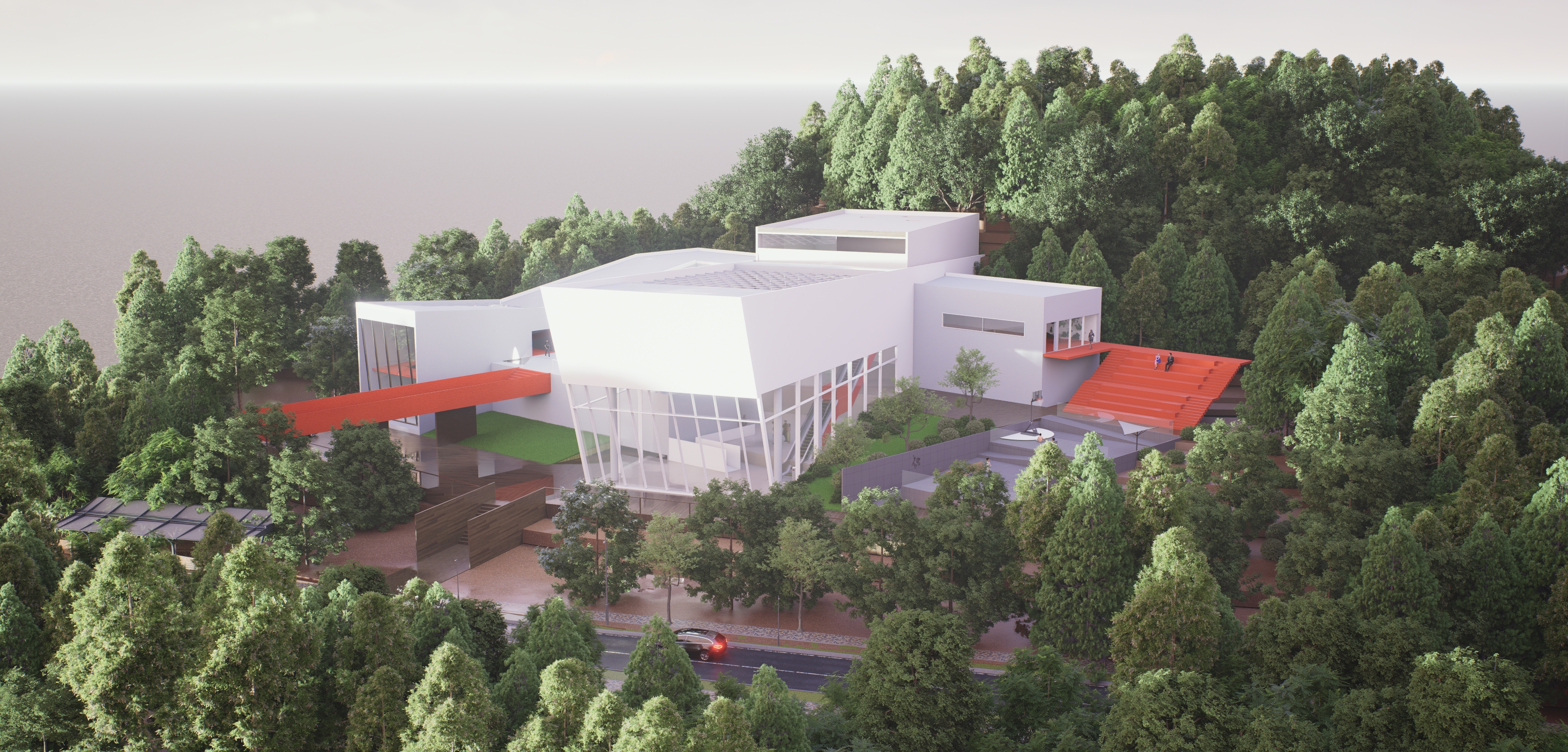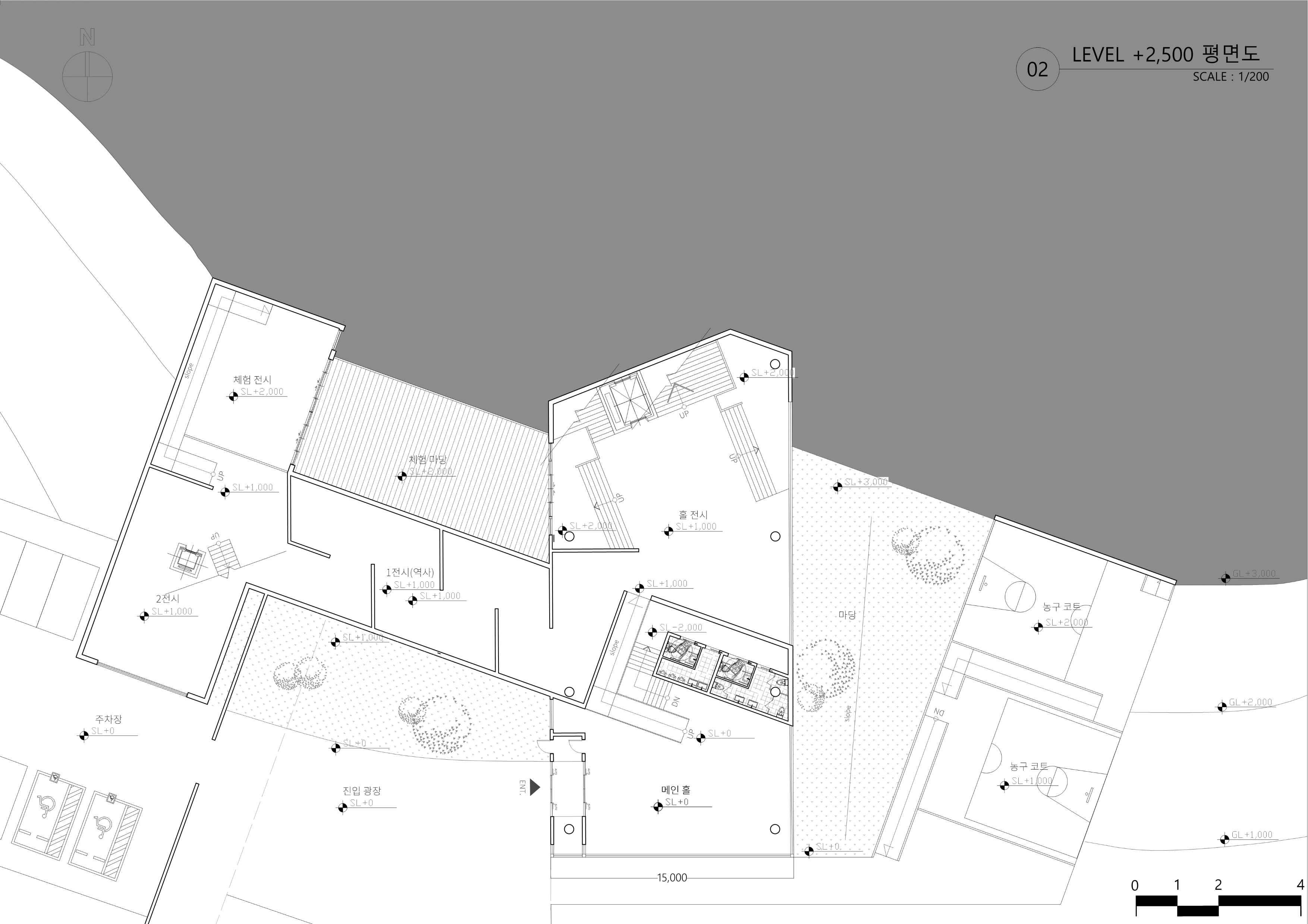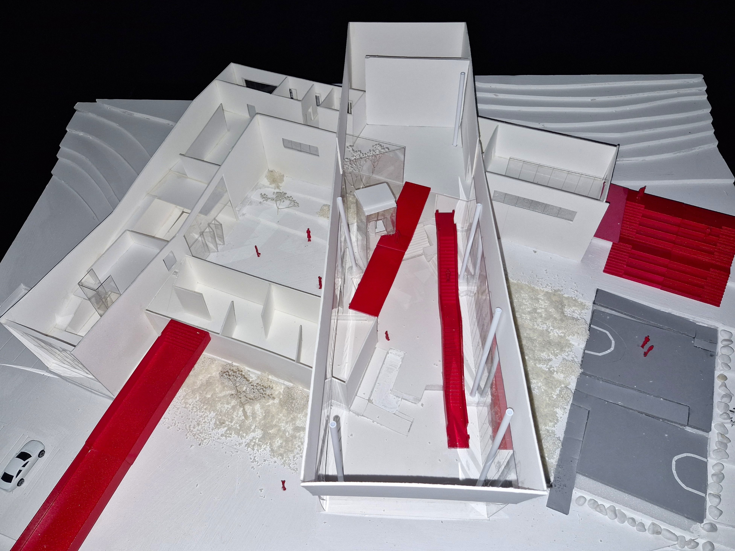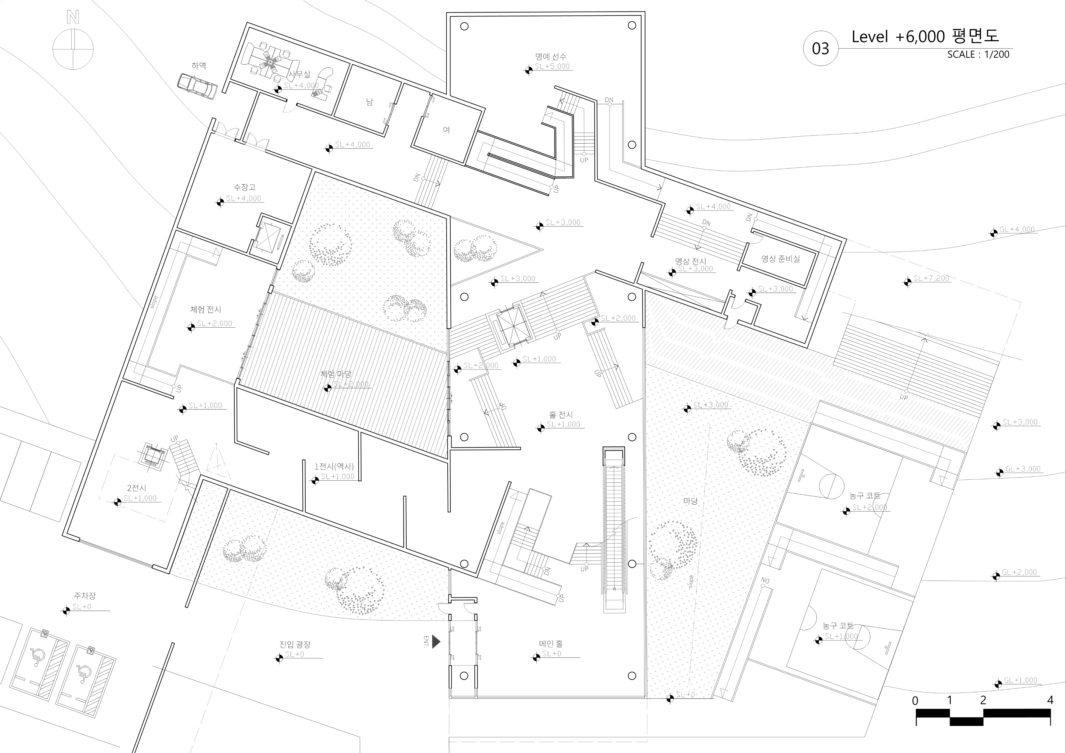 고귀하거나 아름다운 작품을 전시하는 박물관에서 벗어나 관람객이 직접 ‘선택’하고 움직이는 박물관을 목표로 설계하였다. 선수와 관련된 전시물과 플레이들을 벽과 바닥을 통해 실제로 농구를 플레이하는 듯한 느낌을 주려고 하였다. 이 박물관은 ‘농구’라는 주제로 각각의 농구 동작을 ‘Dinamic-static, Virtical- Horizontal, speed’의 기준을 가지고 분류하였으며 이를 공간 간의 흐름과 Scene에 녹여내어 건축화하는 작업을 진행하였다. 이때 사용한 언어는 ‘파고들다, 속도감 있다. 높다.’이다. 이는 ‘부’ 매스가 ‘주’ 매스를 파고드는 형태로 드러나며 각각의 공간을 ‘온전히’ 경험하는 동선과 ‘빠르게’가로지르는 동선을 만들어 관람객들이 결정할 수 있는 ‘선택권’을 주었다. 이 모든 것을 보여줄 수 있는 중앙 홀을 계획하여 높은 천장과 마치 농구 그물망 같은 천창에서 쏟아지는 빛이 하나의 농구 코트로 입장하는 듯한 연출을 하였다. 이러한 박물관은 단순히 일회성이 강한 박물관이 아닌 편하게 접근하여 같이 뛰어놀 수 있는 만남의 장을 만드는 것이 목표이다.