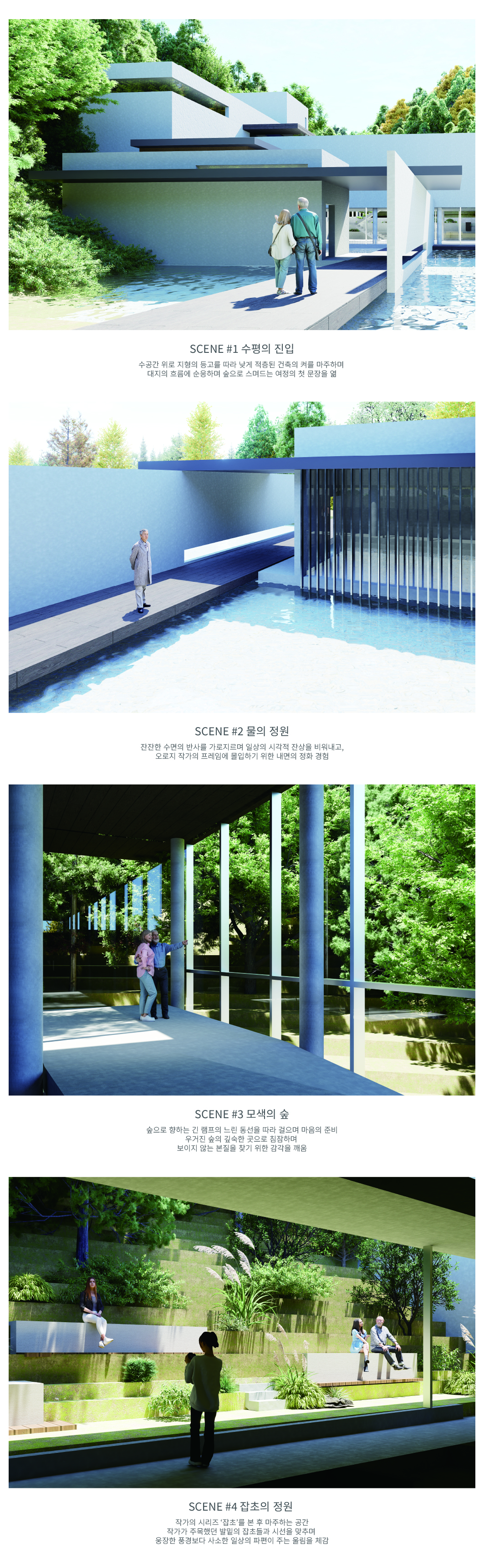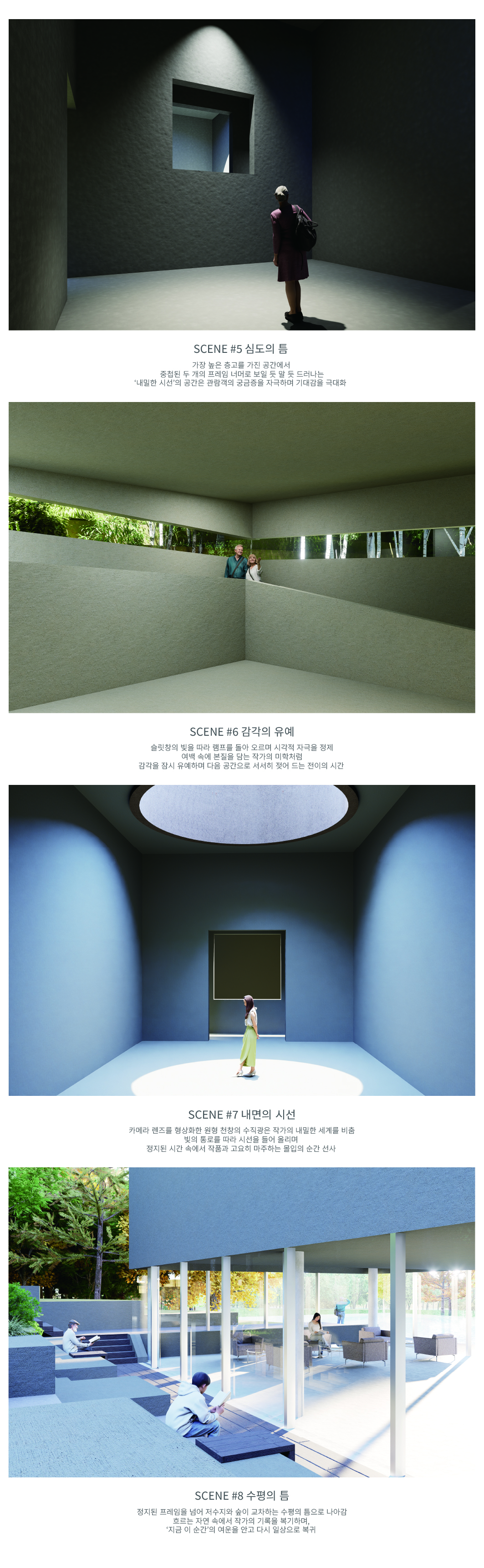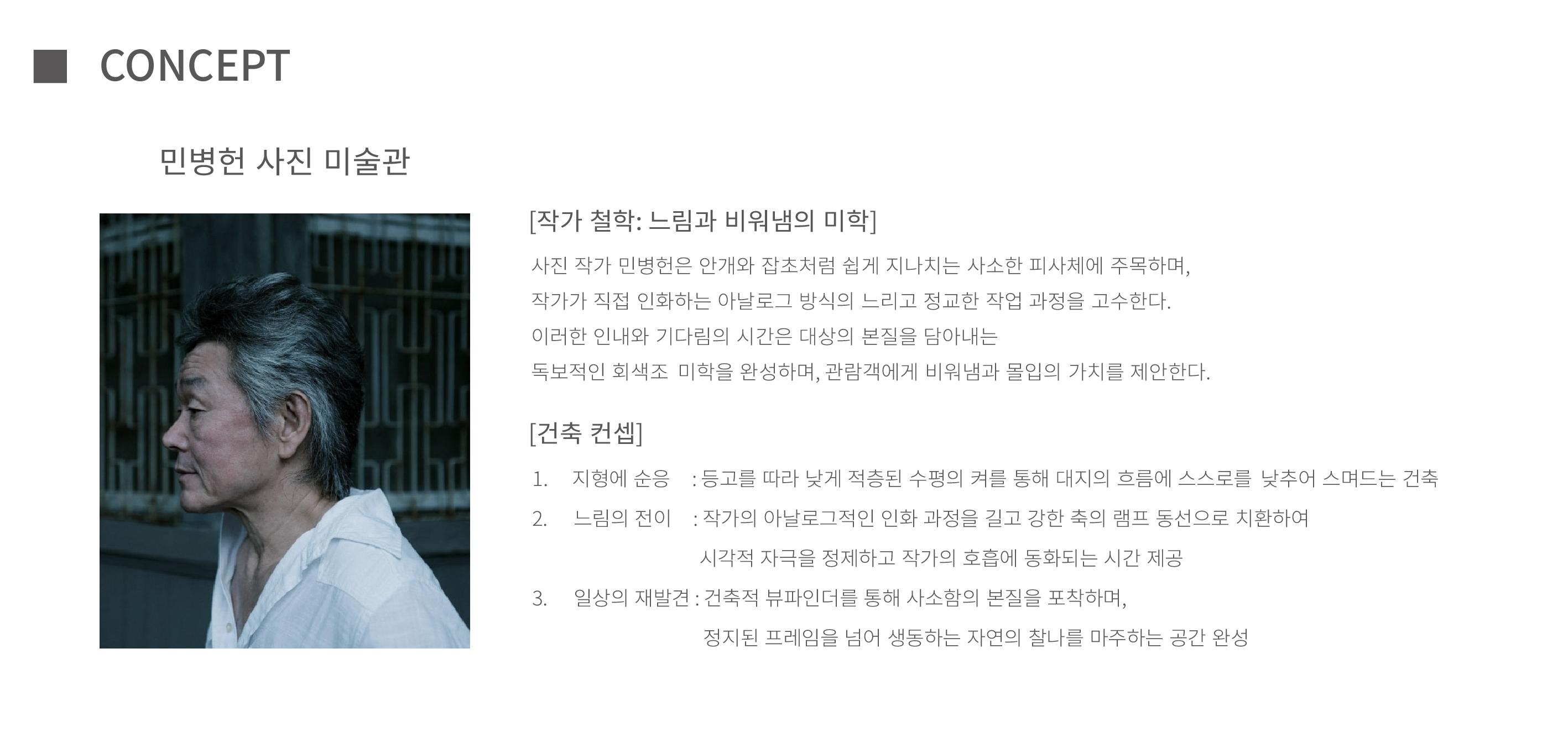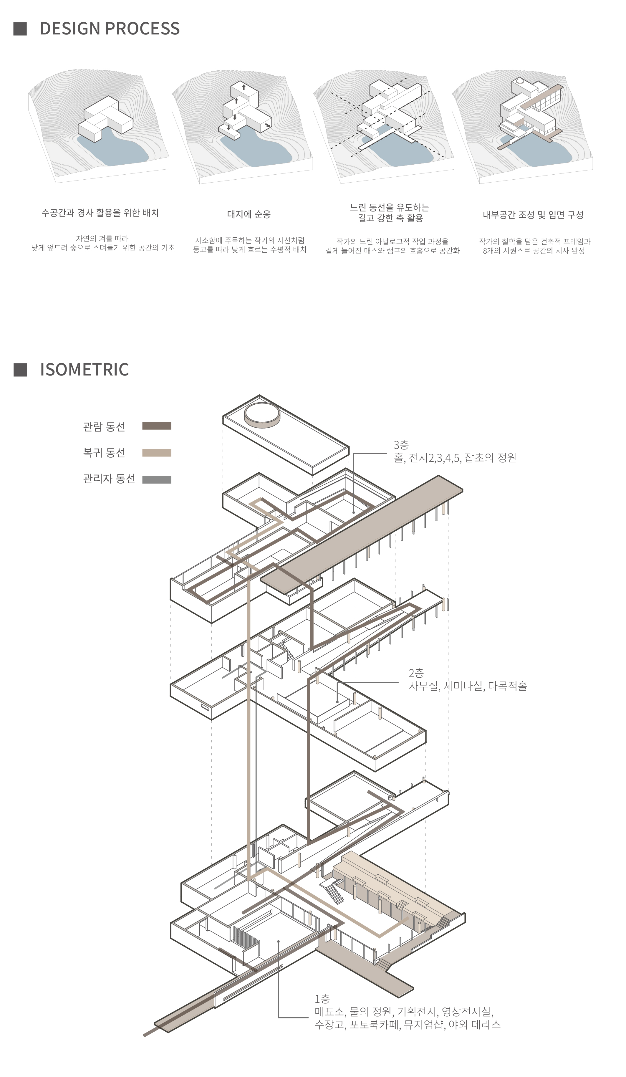 민병헌 사진 미술관 ‘PERMEATING MOMENT’는 대지의 등고를 따라 낮게 적층된 수평의 켜를 통해 자연 속에 스스로를 낮추어 스며드는 건축을 지향한다. 작가의 아날로그적인 느린 작업 과정을 공간화한 길고 강한 축의 램프 동선은 시각적 자극을 정제하고 작가의 호흡에 동화되는 지연된 시간을 제공한다. 진입부터 수평의 틈까지 이어지는 8개의 연속적인 시퀀스는 건축적 뷰파인더로서 기능하며, 사소한 풍경의 본질을 재발견하는 몰입의 여정을 완성한다. 무등산 경사지와 수원지 위에 전시와 휴게 공간을 유기적으로 배치하여, 사진이라는 정지된 프레임을 넘어 생동하는 자연의 찰나와 교감하는 장소를 구축한다.