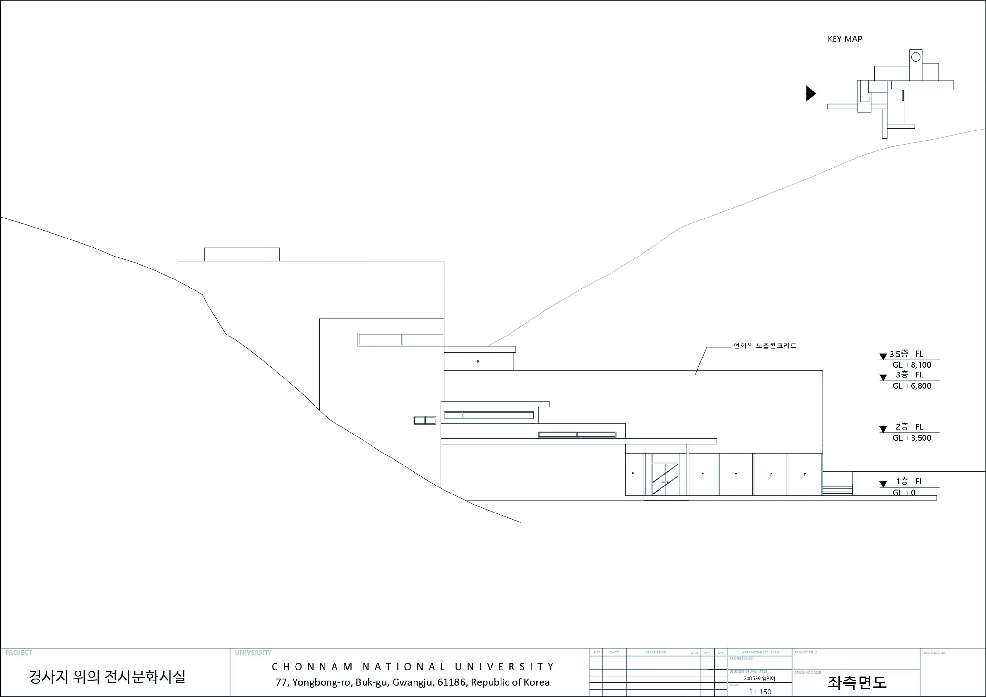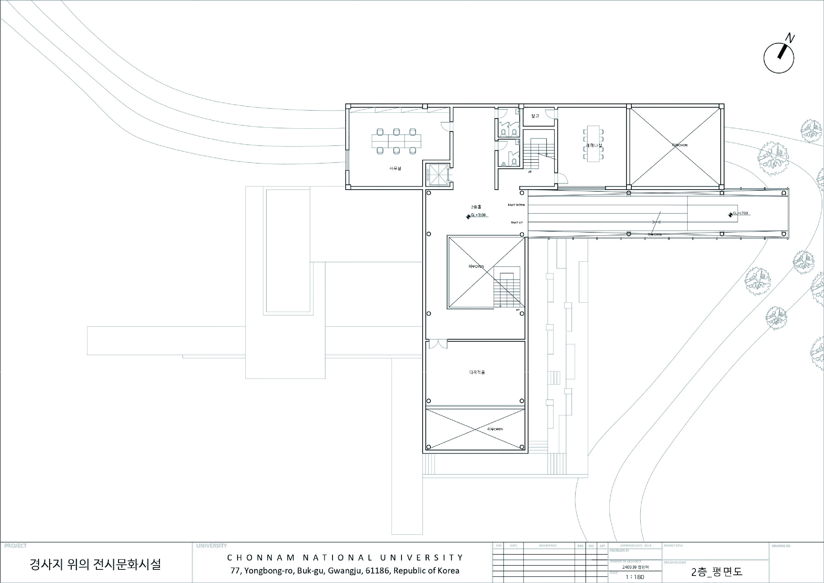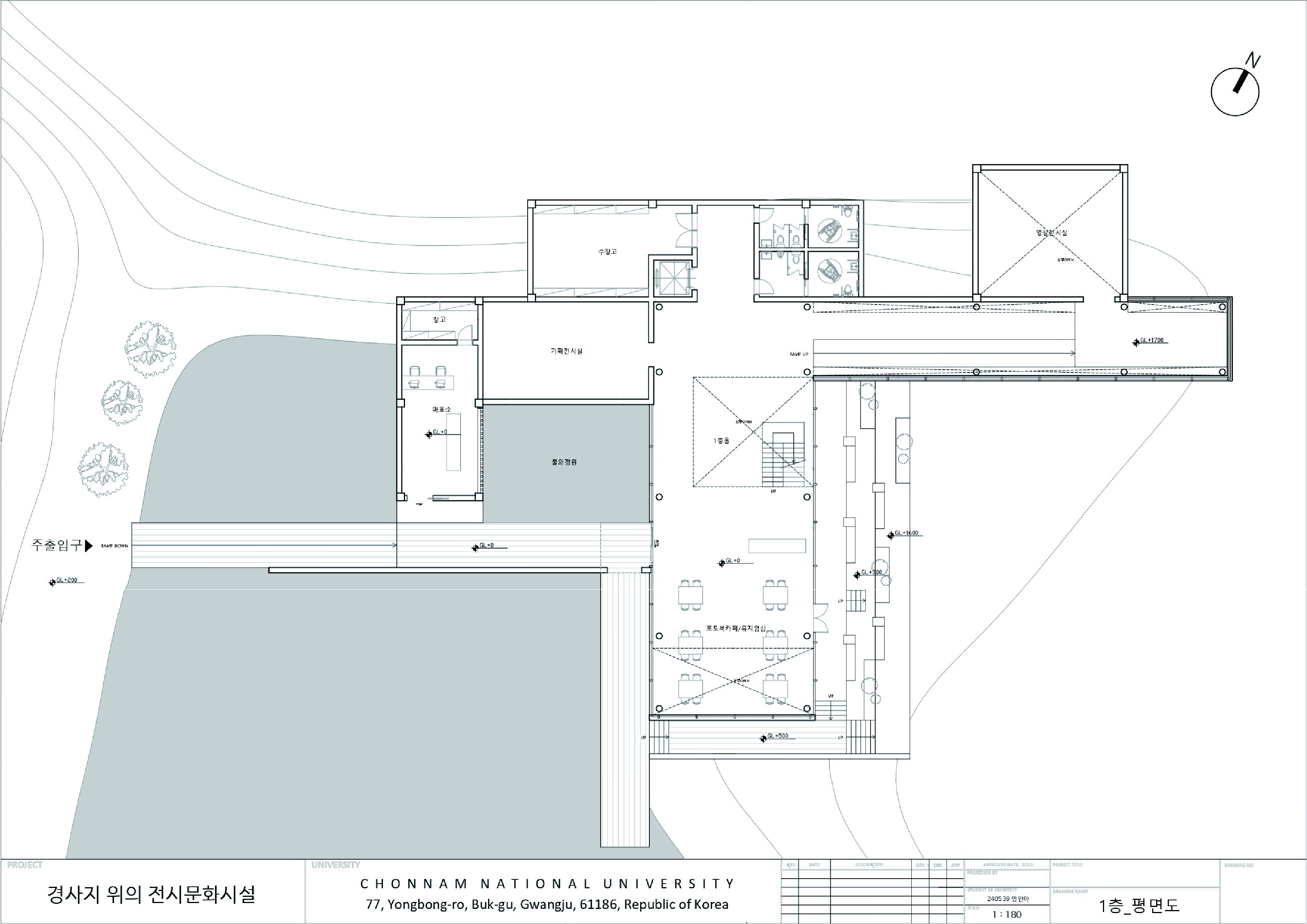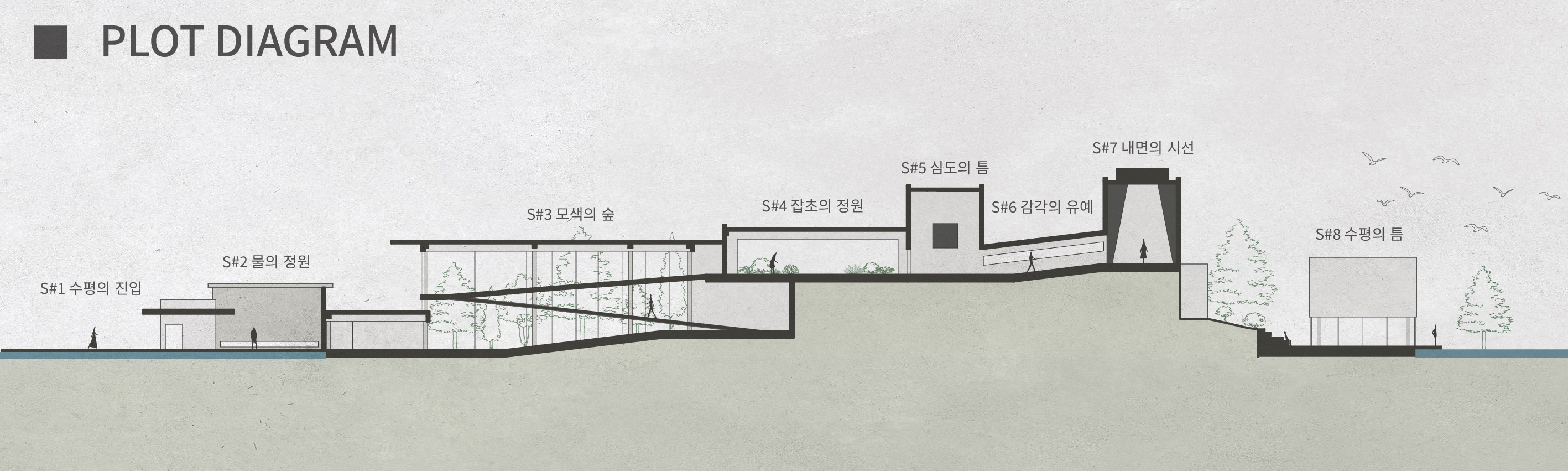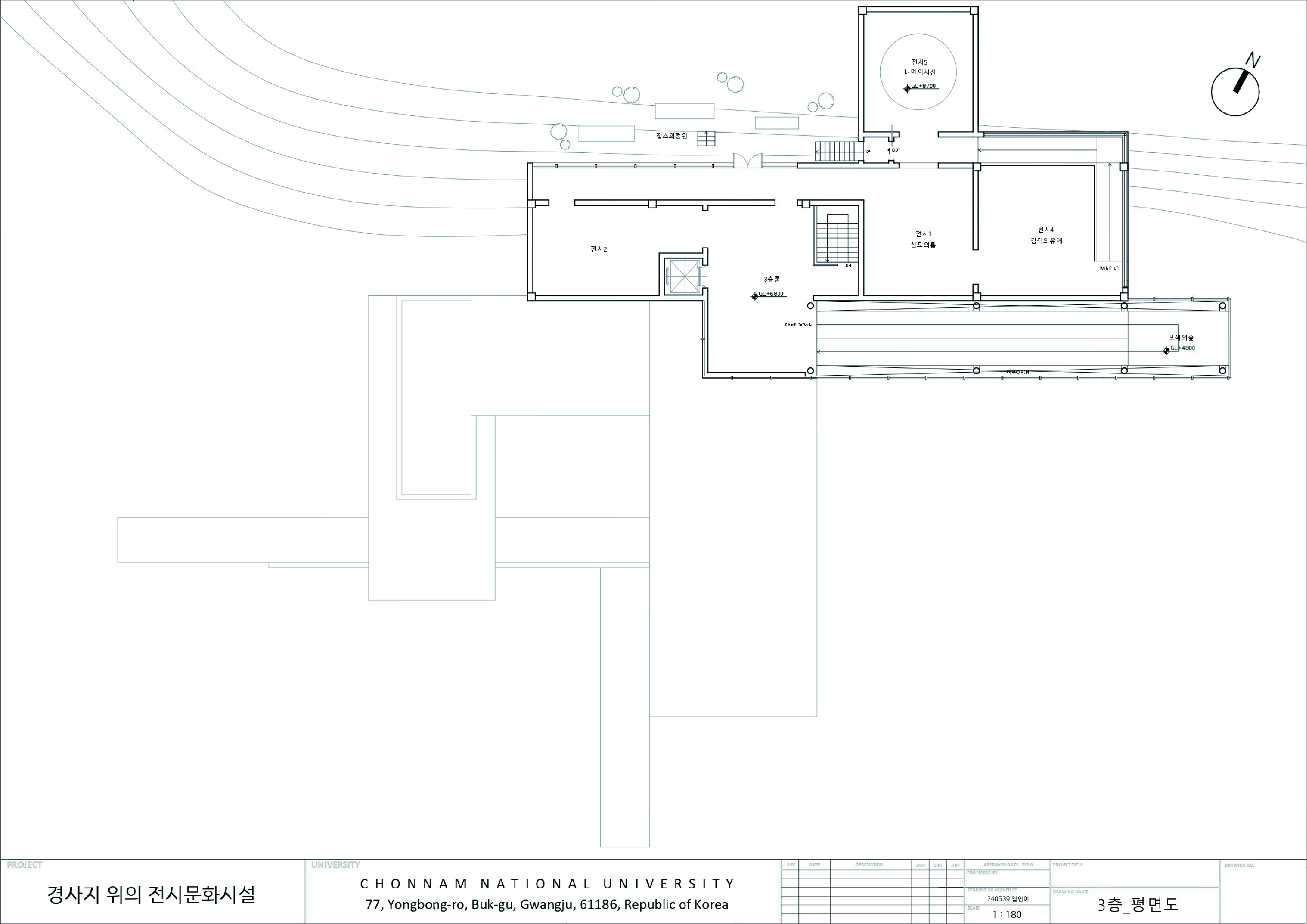 민병헌 사진 미술관 ‘PERMEATING MOMENT’는 대지의 등고를 따라 낮게 적층된 수평의 켜를 통해 자연 속에 스스로를 낮추어 스며드는 건축을 지향한다. 작가의 아날로그적인 느린 작업 과정을 공간화한 길고 강한 축의 램프 동선은 시각적 자극을 정제하고 작가의 호흡에 동화되는 지연된 시간을 제공한다. 진입부터 수평의 틈까지 이어지는 8개의 연속적인 시퀀스는 건축적 뷰파인더로서 기능하며, 사소한 풍경의 본질을 재발견하는 몰입의 여정을 완성한다. 무등산 경사지와 수원지 위에 전시와 휴게 공간을 유기적으로 배치하여, 사진이라는 정지된 프레임을 넘어 생동하는 자연의 찰나와 교감하는 장소를 구축한다.