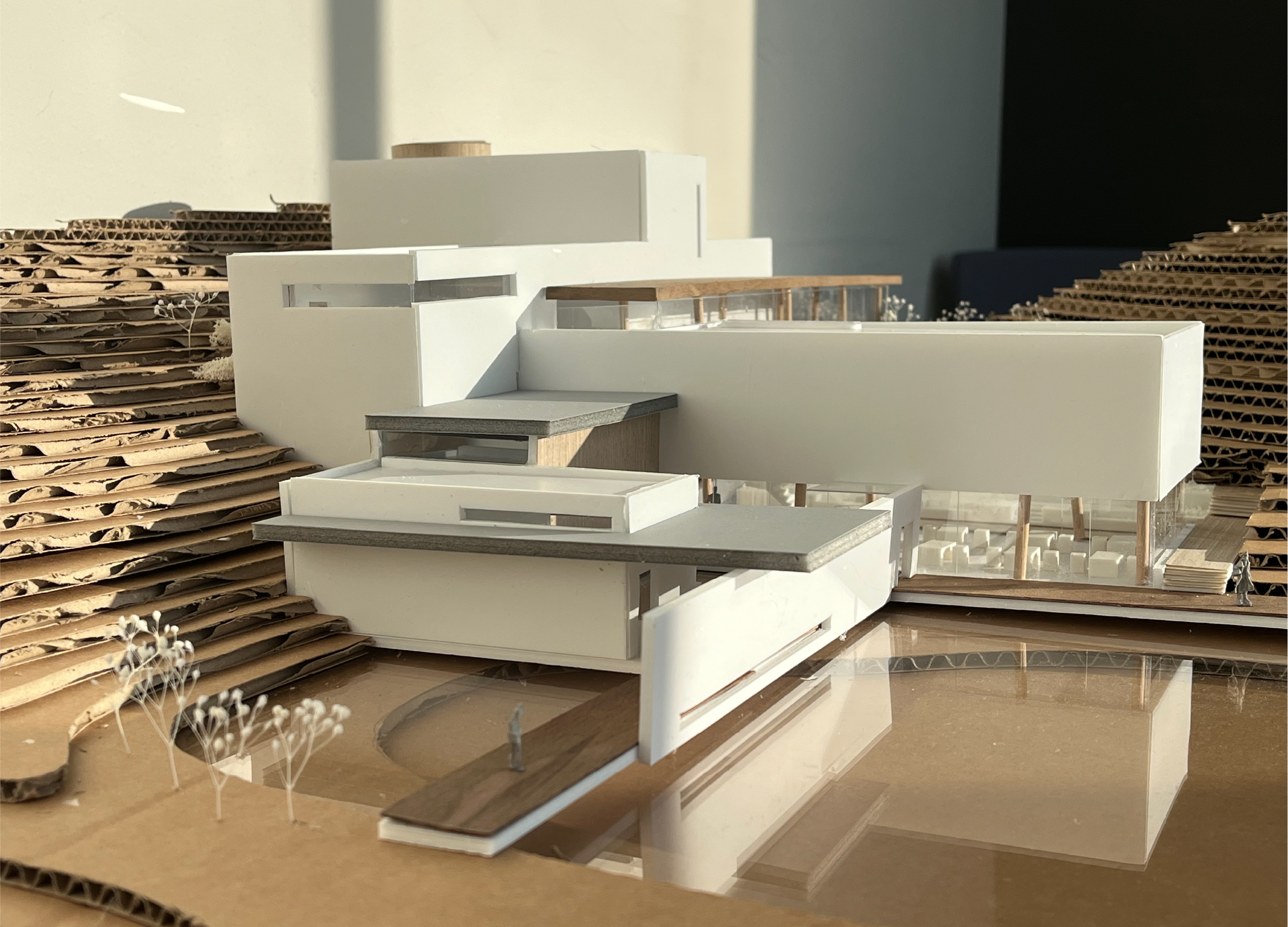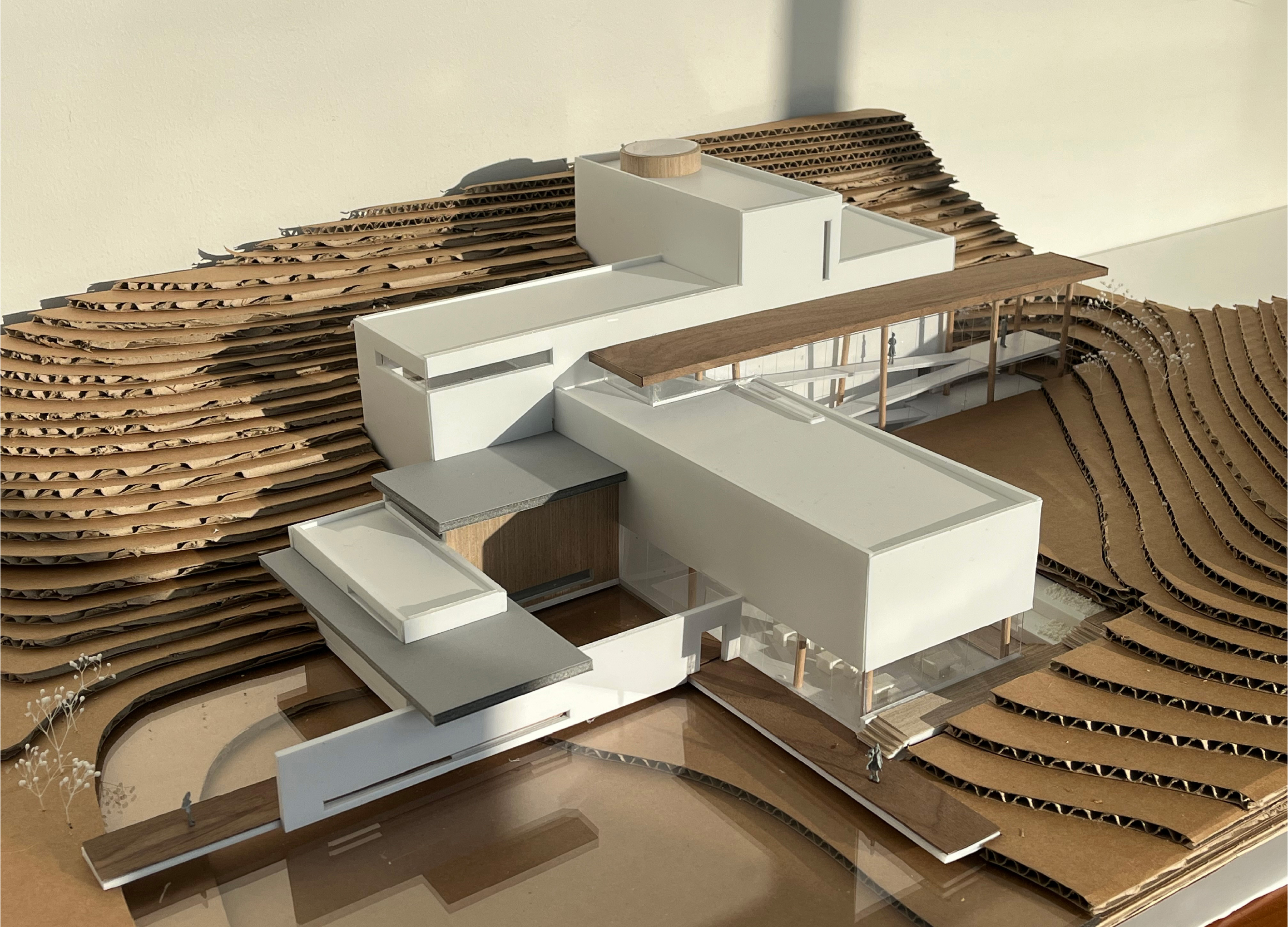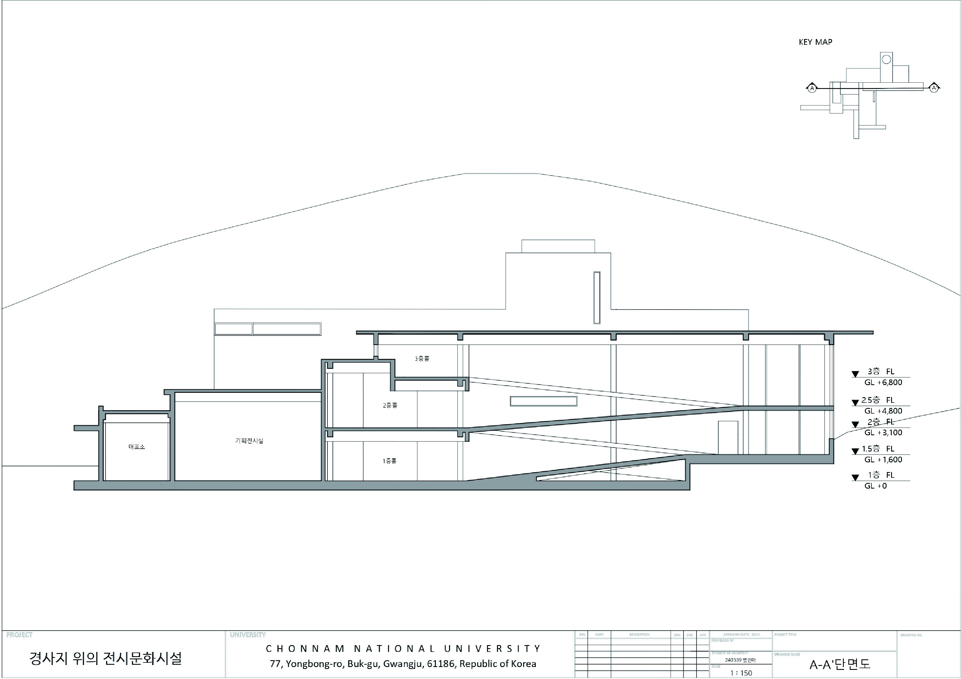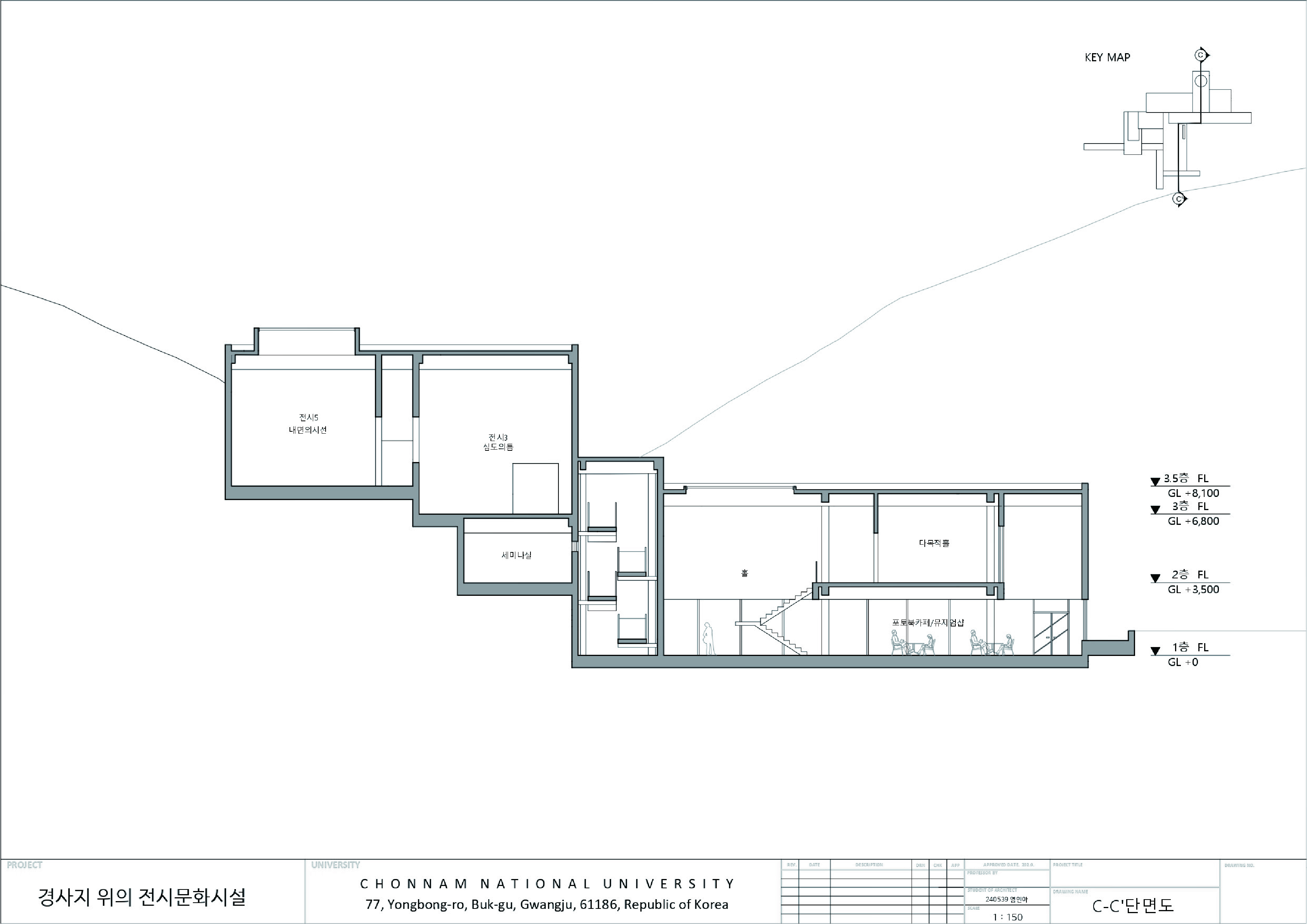 민병헌 사진 미술관 ‘PERMEATING MOMENT’는 대지의 등고를 따라 낮게 적층된 수평의 켜를 통해 자연 속에 스스로를 낮추어 스며드는 건축을 지향한다. 작가의 아날로그적인 느린 작업 과정을 공간화한 길고 강한 축의 램프 동선은 시각적 자극을 정제하고 작가의 호흡에 동화되는 지연된 시간을 제공한다. 진입부터 수평의 틈까지 이어지는 8개의 연속적인 시퀀스는 건축적 뷰파인더로서 기능하며, 사소한 풍경의 본질을 재발견하는 몰입의 여정을 완성한다. 무등산 경사지와 수원지 위에 전시와 휴게 공간을 유기적으로 배치하여, 사진이라는 정지된 프레임을 넘어 생동하는 자연의 찰나와 교감하는 장소를 구축한다.