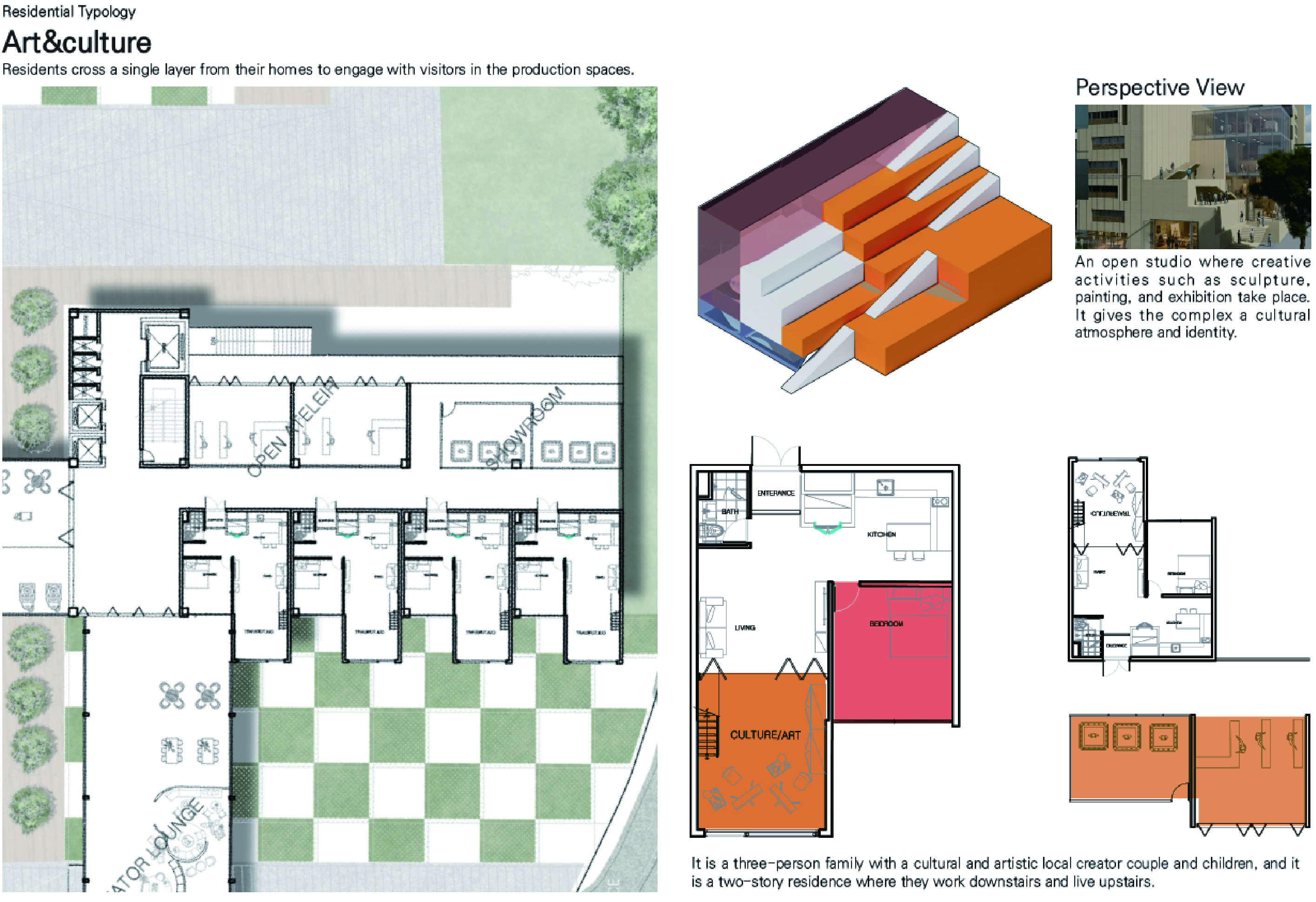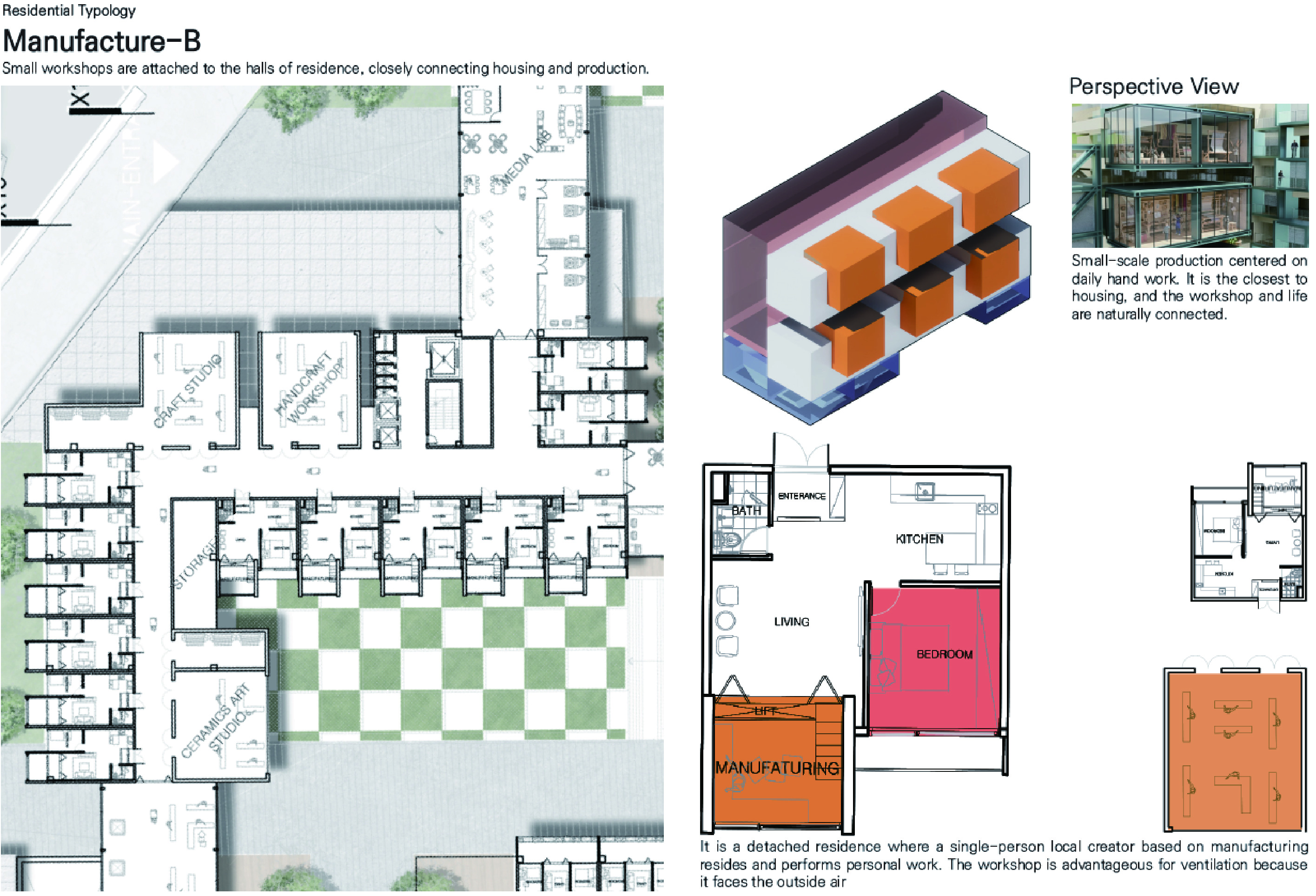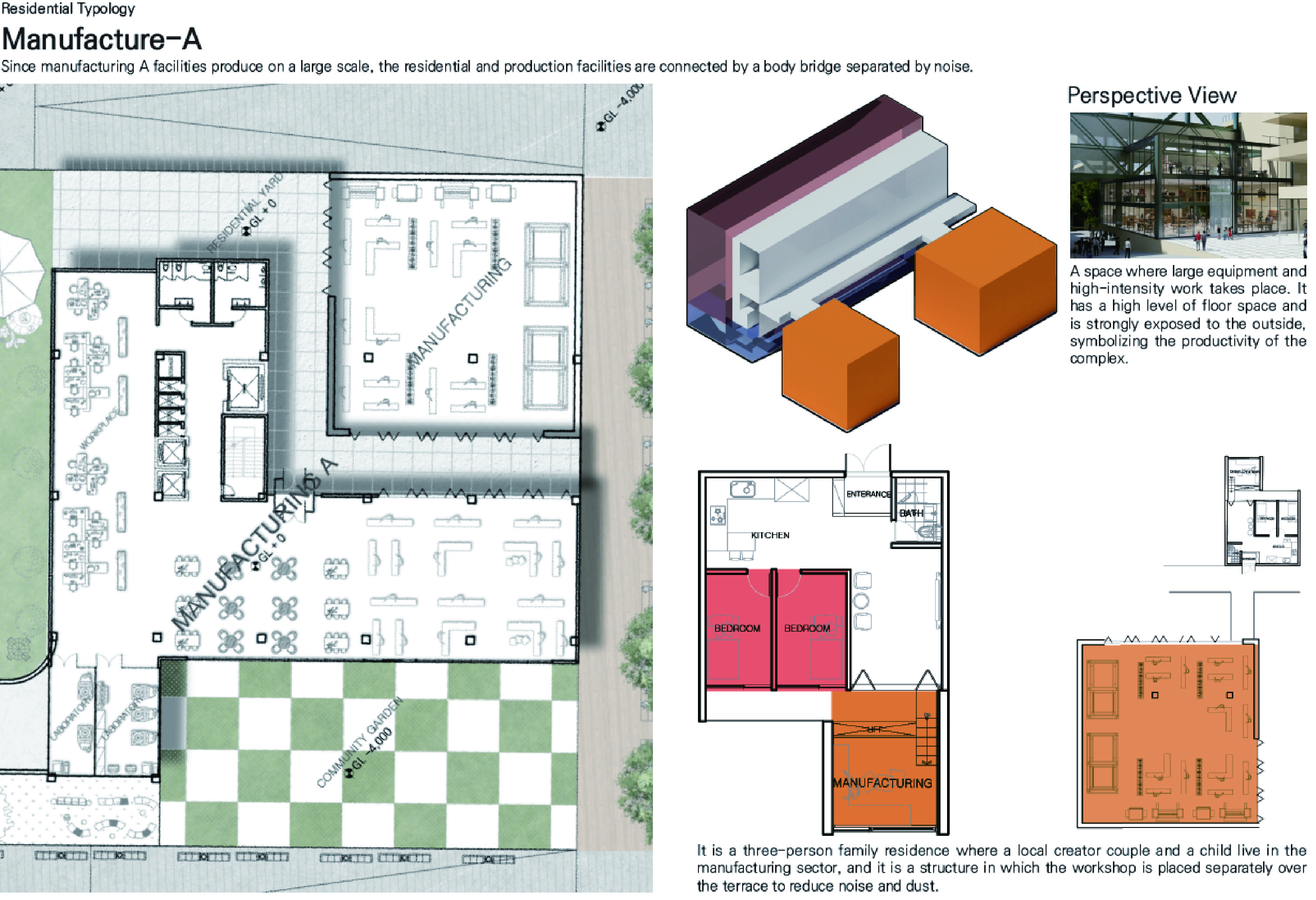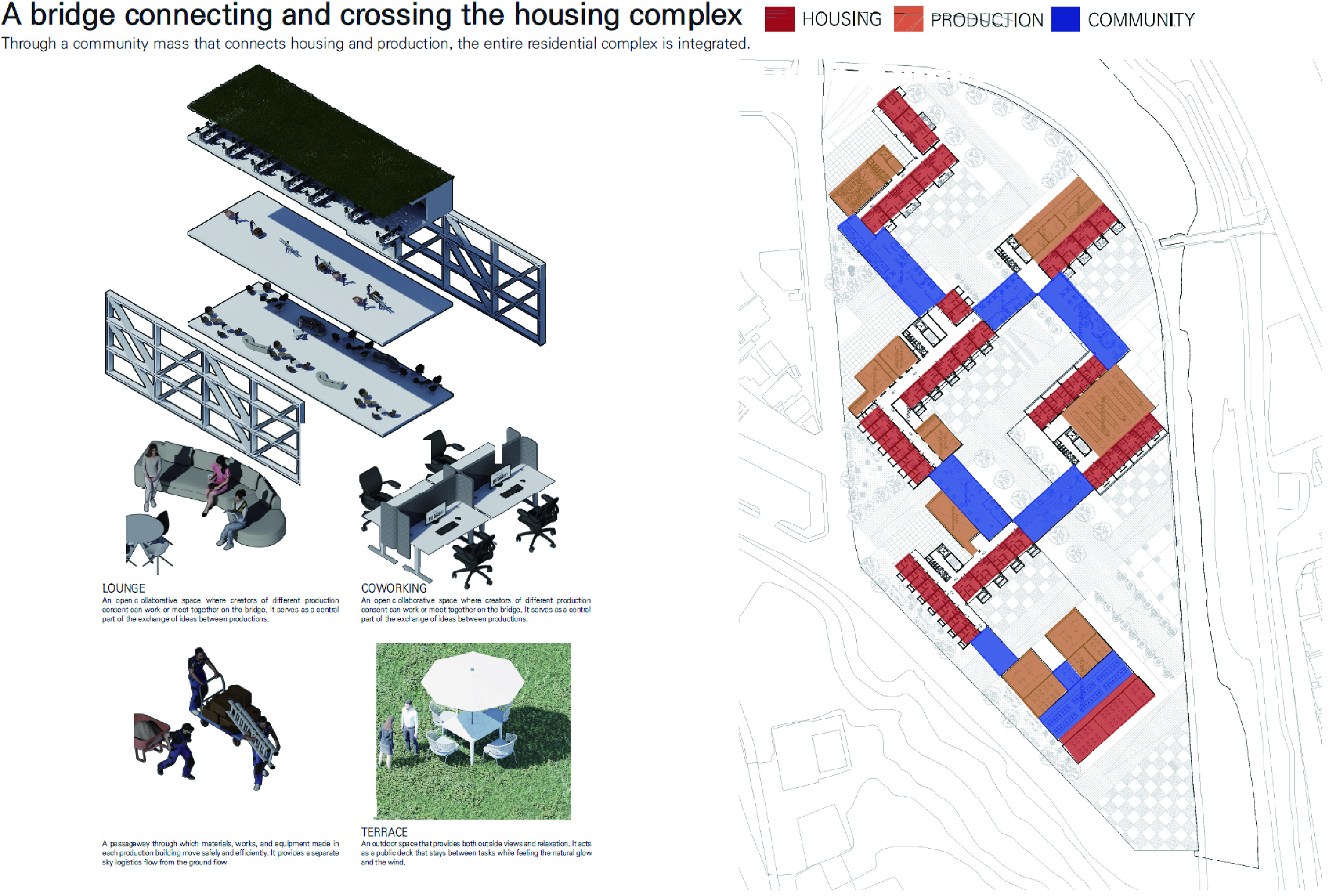 '생산형 집합주거(Production Housing)' 프로젝트는 주거와 생산, 사람과 커뮤니티가 융합되어 다양한 생산 활동이 공존하는 로컬 크리에이터를 위한 주거 단지입니다. 광주천과 맞닿은 대지의 심한 레벨 차이를 극복하기 위해 지면을 평탄화하면서 경사면과 옹벽을 형성했고, 이를 기준으로 하부의 공공 공간과 상부의 프라이빗한 주거 영역을 분리했습니다. 단지 내부는 체크보드 형태의 녹지와 타일로 구성되며, 중앙을 가로지르는 숲길이 주민들의 소통을 유도합니다. 각 주거 유닛은 크리에이터의 작업 특성에 맞춰 다채롭게 구성되는데, 테라스에 스마트팜이 결합된 친환경 2인 주거, 조각이나 회화 작업을 위한 오픈 스튜디오를 갖춘 3인 가족 문화/예술 주거, 대규모 장비 소음을 고려해 작업실을 브릿지로 분리한 3인 가족 제조형 A 주거, 개인 수작업 공방이 주거 공간에 밀착된 1인 제조형 B 주거, 방음이 철저한 폐쇄형 스튜디오를 공유하는 2인 쉐어형 디지털 미디어 주거 등으로 나뉩니다. 특히 이 단지는 여러 생산 건물을 잇고 가로지르는 브릿지 시스템이 핵심인데, 이 브릿지는 크리에이터들의 아이디어 교류를 위한 라운지와 코워킹 스페이스 역할을 함과 동시에 지상과 분리된 공중 물류 라인을 제공하여 자재와 장비가 안전하고 효율적으로 이동할 수 있게 해줍니다.