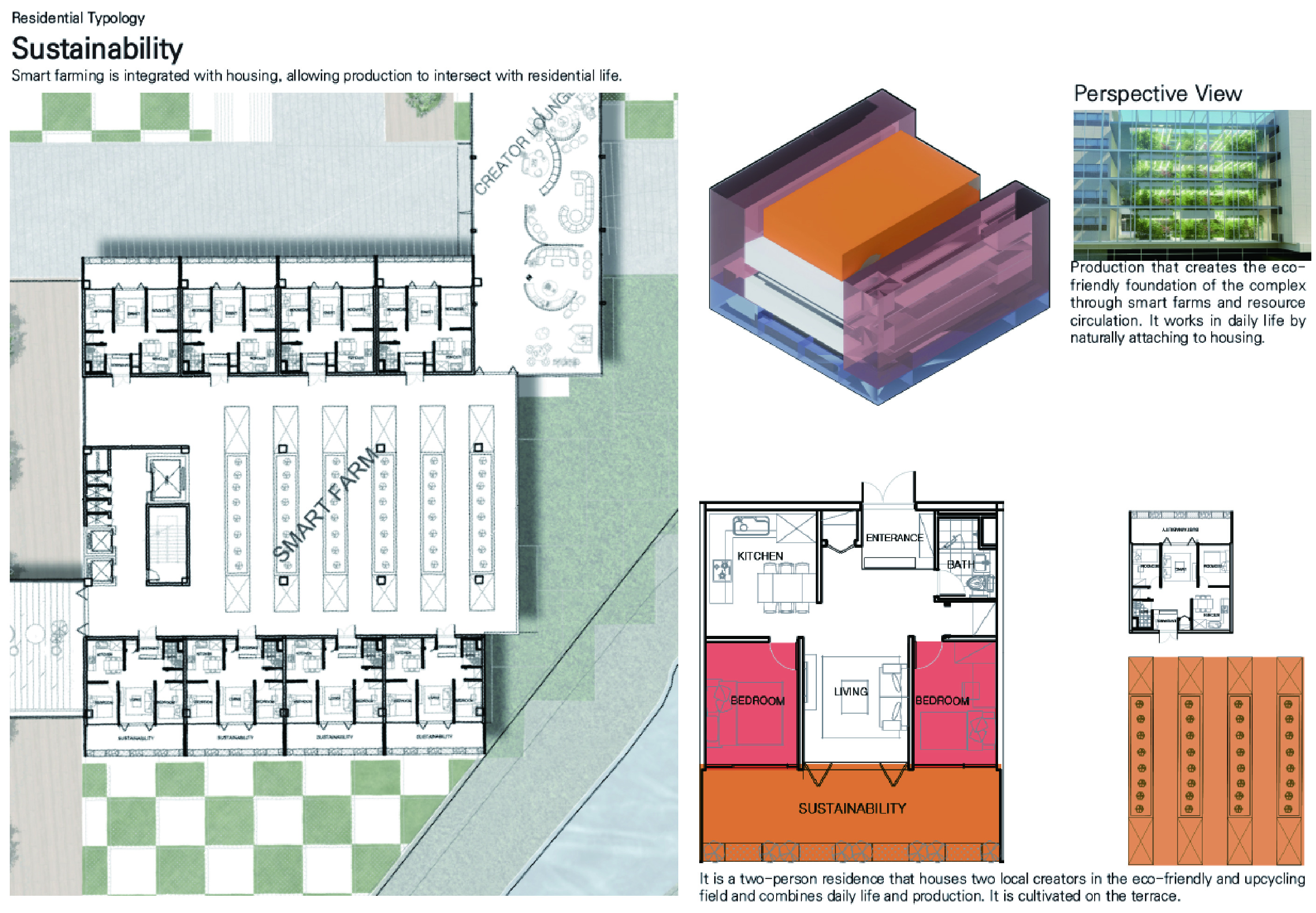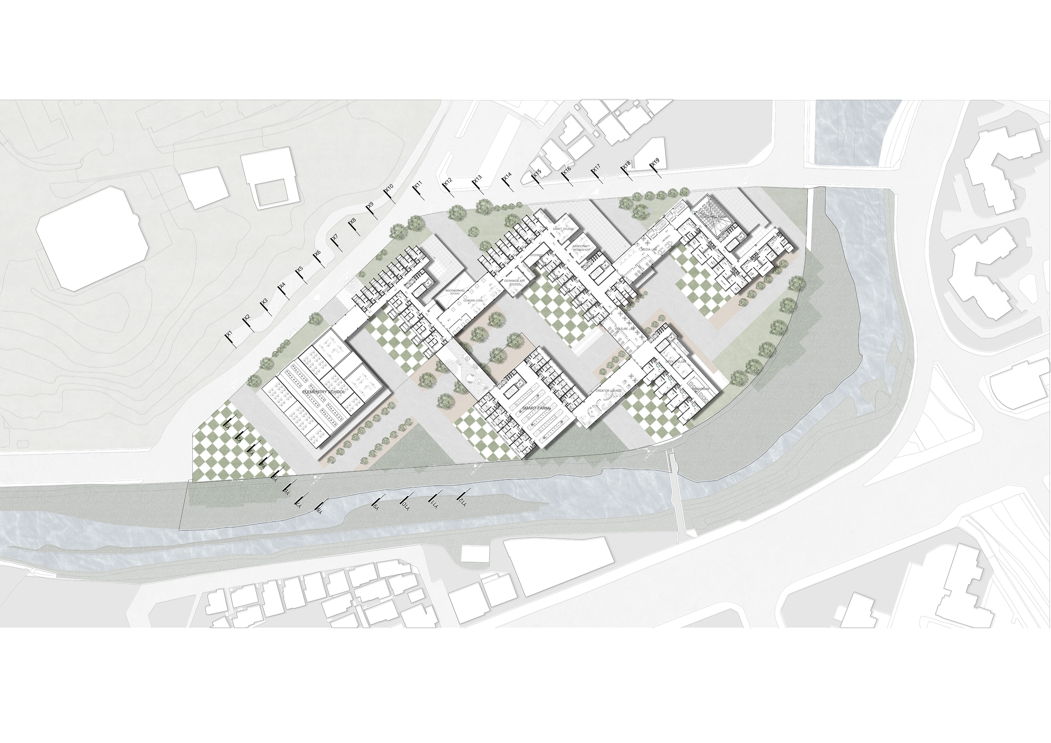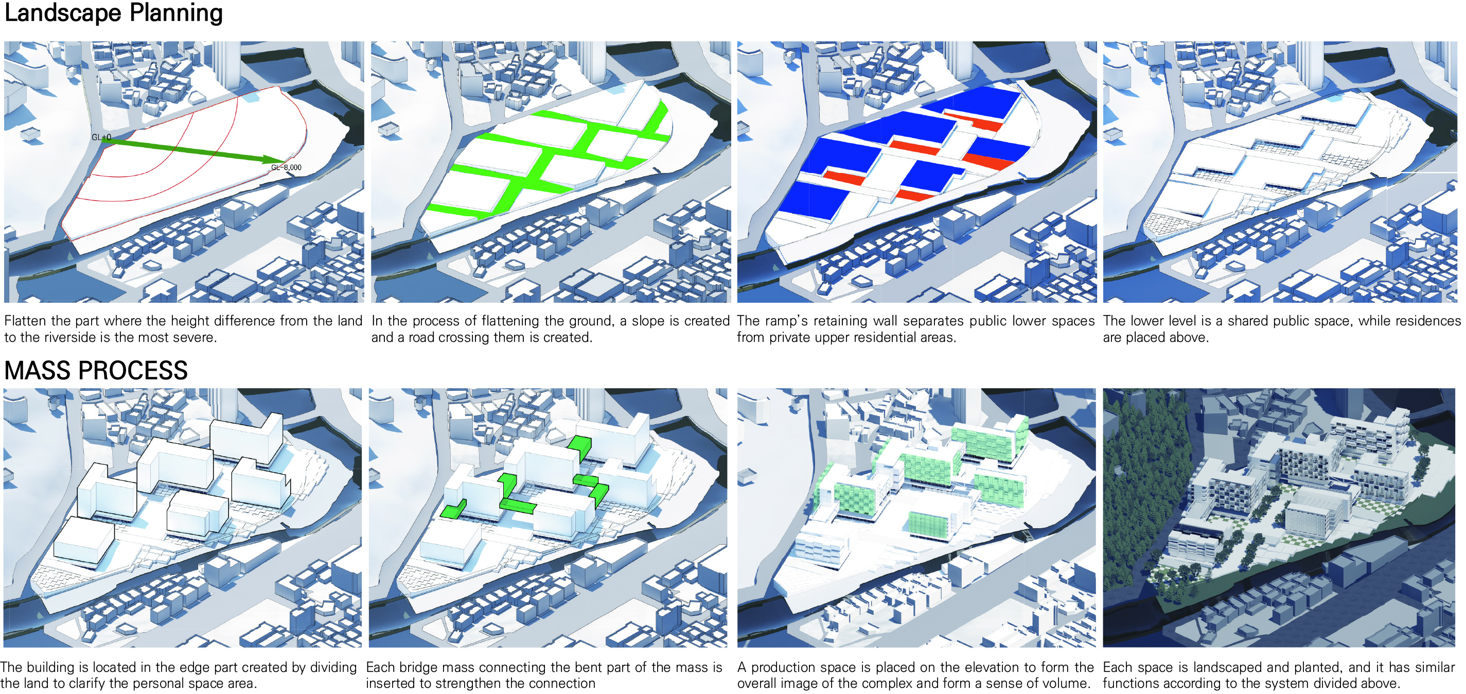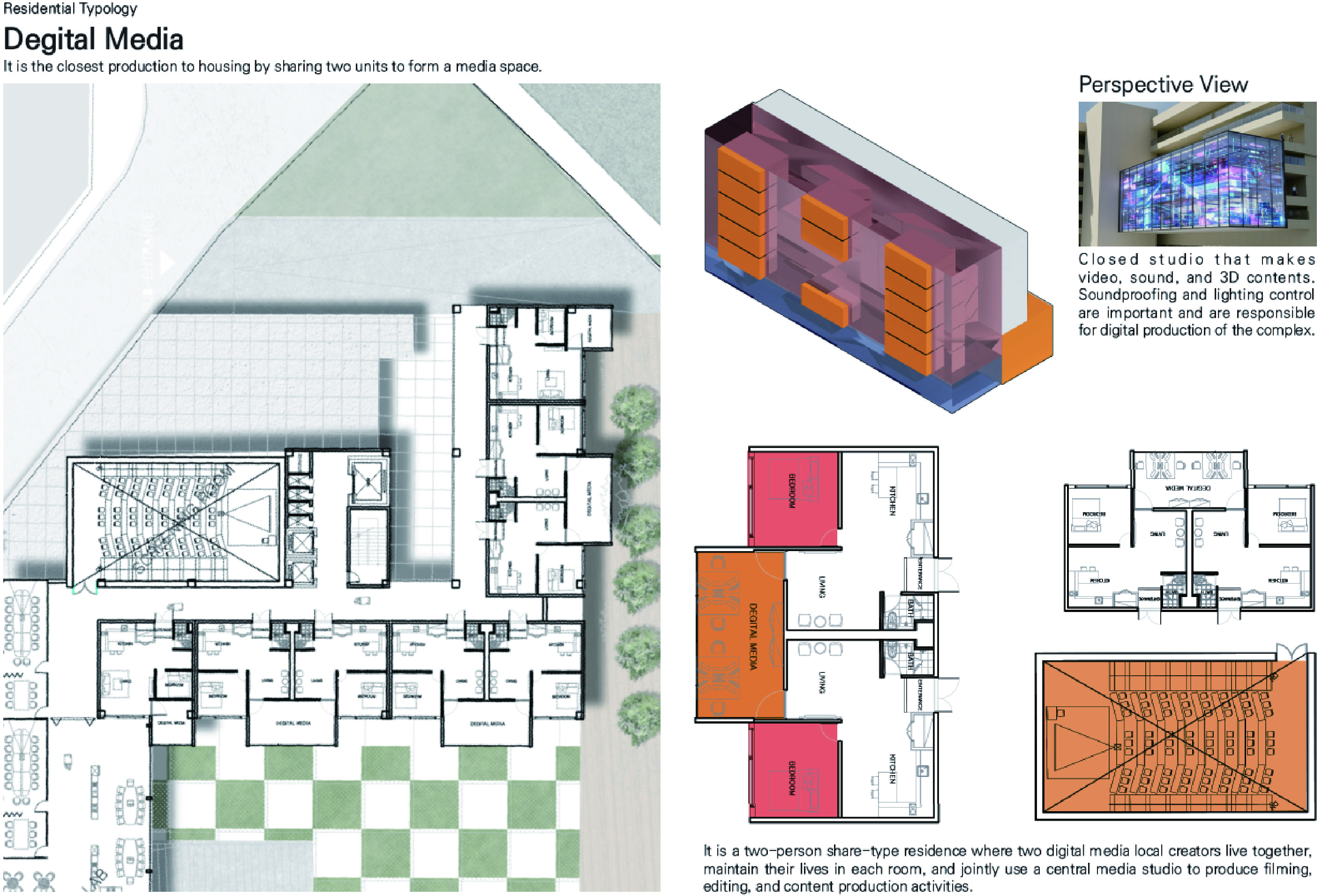 '생산형 집합주거(Production Housing)' 프로젝트는 주거와 생산, 사람과 커뮤니티가 융합되어 다양한 생산 활동이 공존하는 로컬 크리에이터를 위한 주거 단지입니다. 광주천과 맞닿은 대지의 심한 레벨 차이를 극복하기 위해 지면을 평탄화하면서 경사면과 옹벽을 형성했고, 이를 기준으로 하부의 공공 공간과 상부의 프라이빗한 주거 영역을 분리했습니다. 단지 내부는 체크보드 형태의 녹지와 타일로 구성되며, 중앙을 가로지르는 숲길이 주민들의 소통을 유도합니다. 각 주거 유닛은 크리에이터의 작업 특성에 맞춰 다채롭게 구성되는데, 테라스에 스마트팜이 결합된 친환경 2인 주거, 조각이나 회화 작업을 위한 오픈 스튜디오를 갖춘 3인 가족 문화/예술 주거, 대규모 장비 소음을 고려해 작업실을 브릿지로 분리한 3인 가족 제조형 A 주거, 개인 수작업 공방이 주거 공간에 밀착된 1인 제조형 B 주거, 방음이 철저한 폐쇄형 스튜디오를 공유하는 2인 쉐어형 디지털 미디어 주거 등으로 나뉩니다. 특히 이 단지는 여러 생산 건물을 잇고 가로지르는 브릿지 시스템이 핵심인데, 이 브릿지는 크리에이터들의 아이디어 교류를 위한 라운지와 코워킹 스페이스 역할을 함과 동시에 지상과 분리된 공중 물류 라인을 제공하여 자재와 장비가 안전하고 효율적으로 이동할 수 있게 해줍니다.
