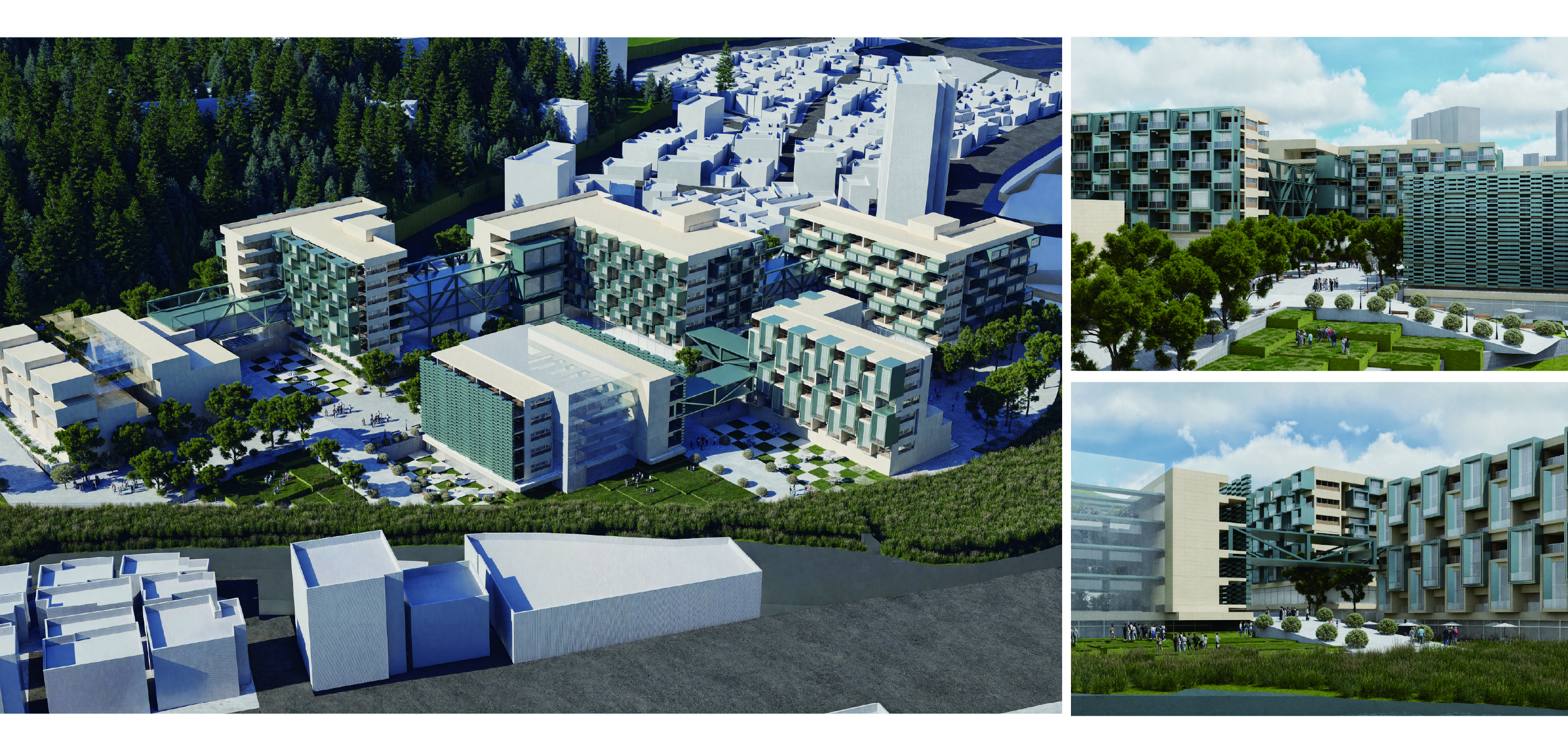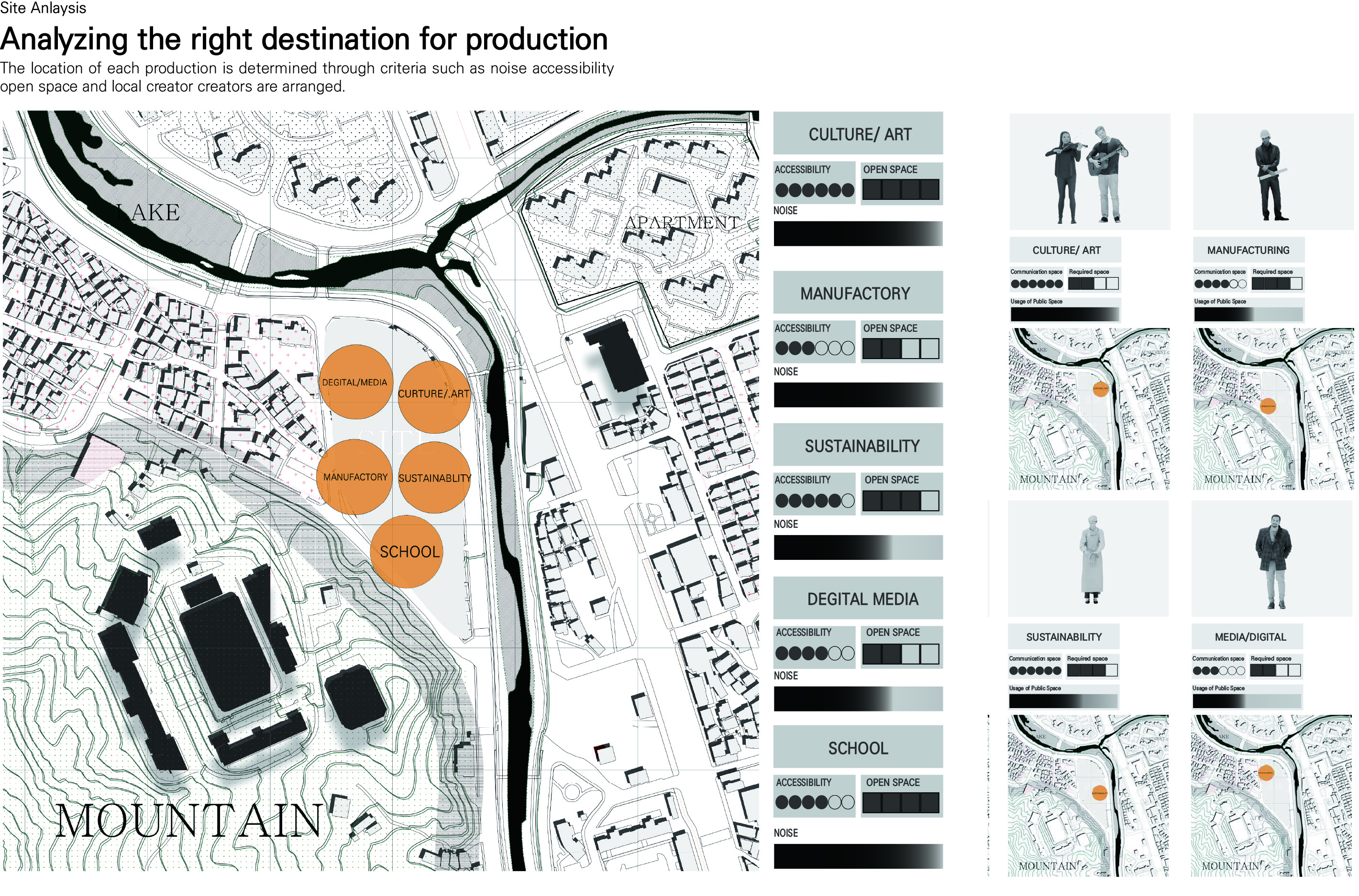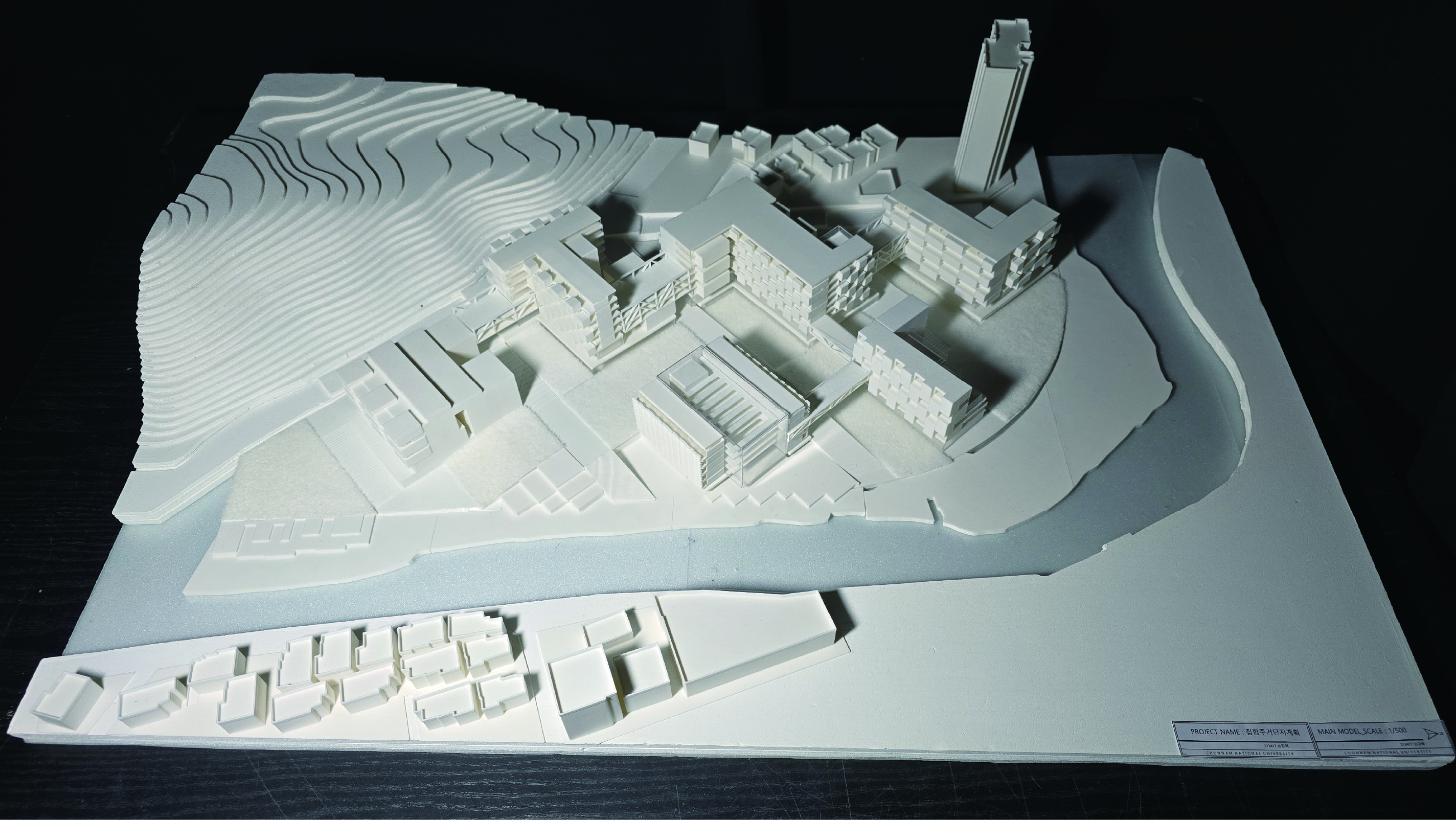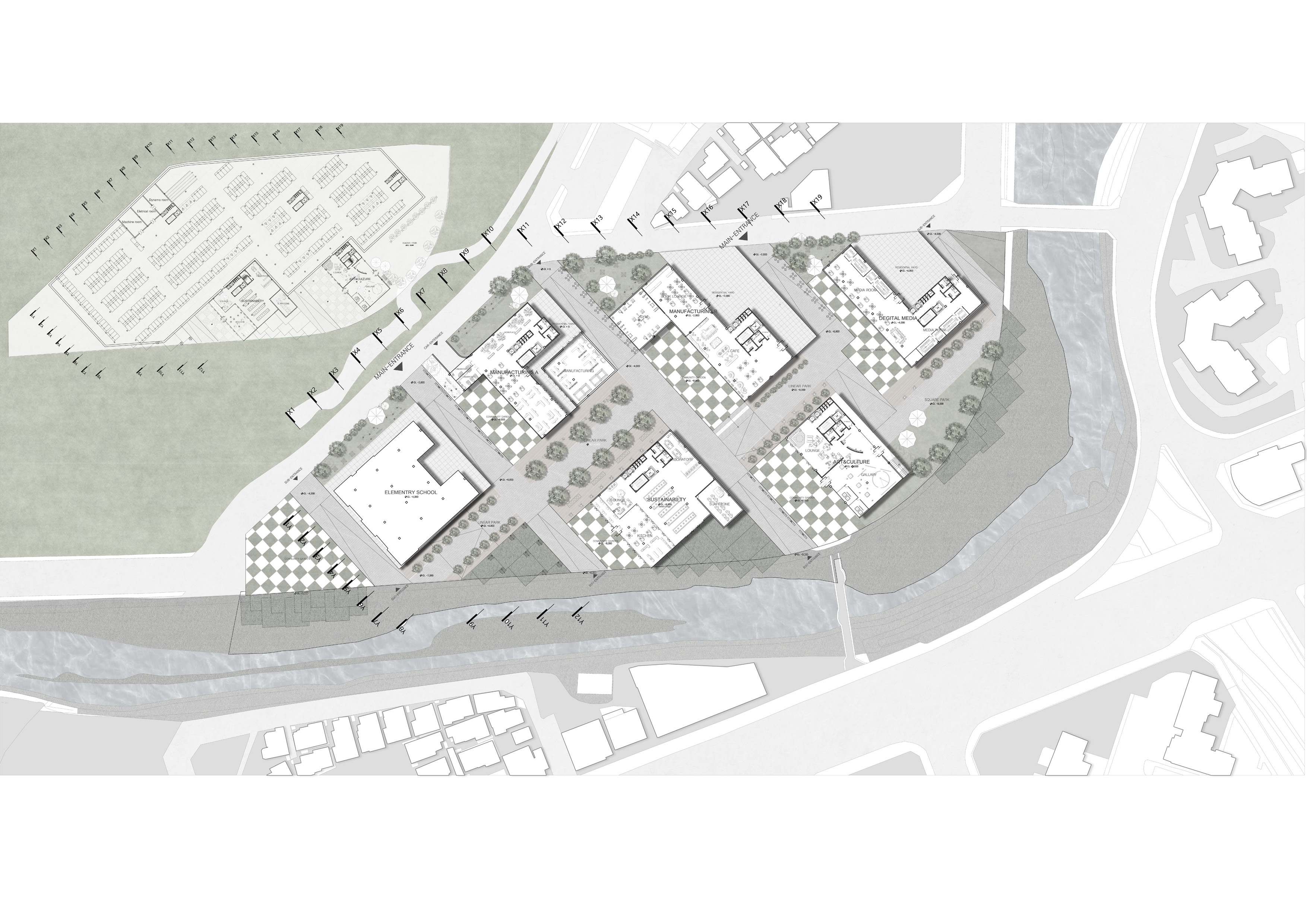 '생산형 집합주거(Production Housing)' 프로젝트는 주거와 생산, 사람과 커뮤니티가 융합되어 다양한 생산 활동이 공존하는 로컬 크리에이터를 위한 주거 단지입니다. 광주천과 맞닿은 대지의 심한 레벨 차이를 극복하기 위해 지면을 평탄화하면서 경사면과 옹벽을 형성했고, 이를 기준으로 하부의 공공 공간과 상부의 프라이빗한 주거 영역을 분리했습니다. 단지 내부는 체크보드 형태의 녹지와 타일로 구성되며, 중앙을 가로지르는 숲길이 주민들의 소통을 유도합니다. 각 주거 유닛은 크리에이터의 작업 특성에 맞춰 다채롭게 구성되는데, 테라스에 스마트팜이 결합된 친환경 2인 주거, 조각이나 회화 작업을 위한 오픈 스튜디오를 갖춘 3인 가족 문화/예술 주거, 대규모 장비 소음을 고려해 작업실을 브릿지로 분리한 3인 가족 제조형 A 주거, 개인 수작업 공방이 주거 공간에 밀착된 1인 제조형 B 주거, 방음이 철저한 폐쇄형 스튜디오를 공유하는 2인 쉐어형 디지털 미디어 주거 등으로 나뉩니다. 특히 이 단지는 여러 생산 건물을 잇고 가로지르는 브릿지 시스템이 핵심인데, 이 브릿지는 크리에이터들의 아이디어 교류를 위한 라운지와 코워킹 스페이스 역할을 함과 동시에 지상과 분리된 공중 물류 라인을 제공하여 자재와 장비가 안전하고 효율적으로 이동할 수 있게 해줍니다.