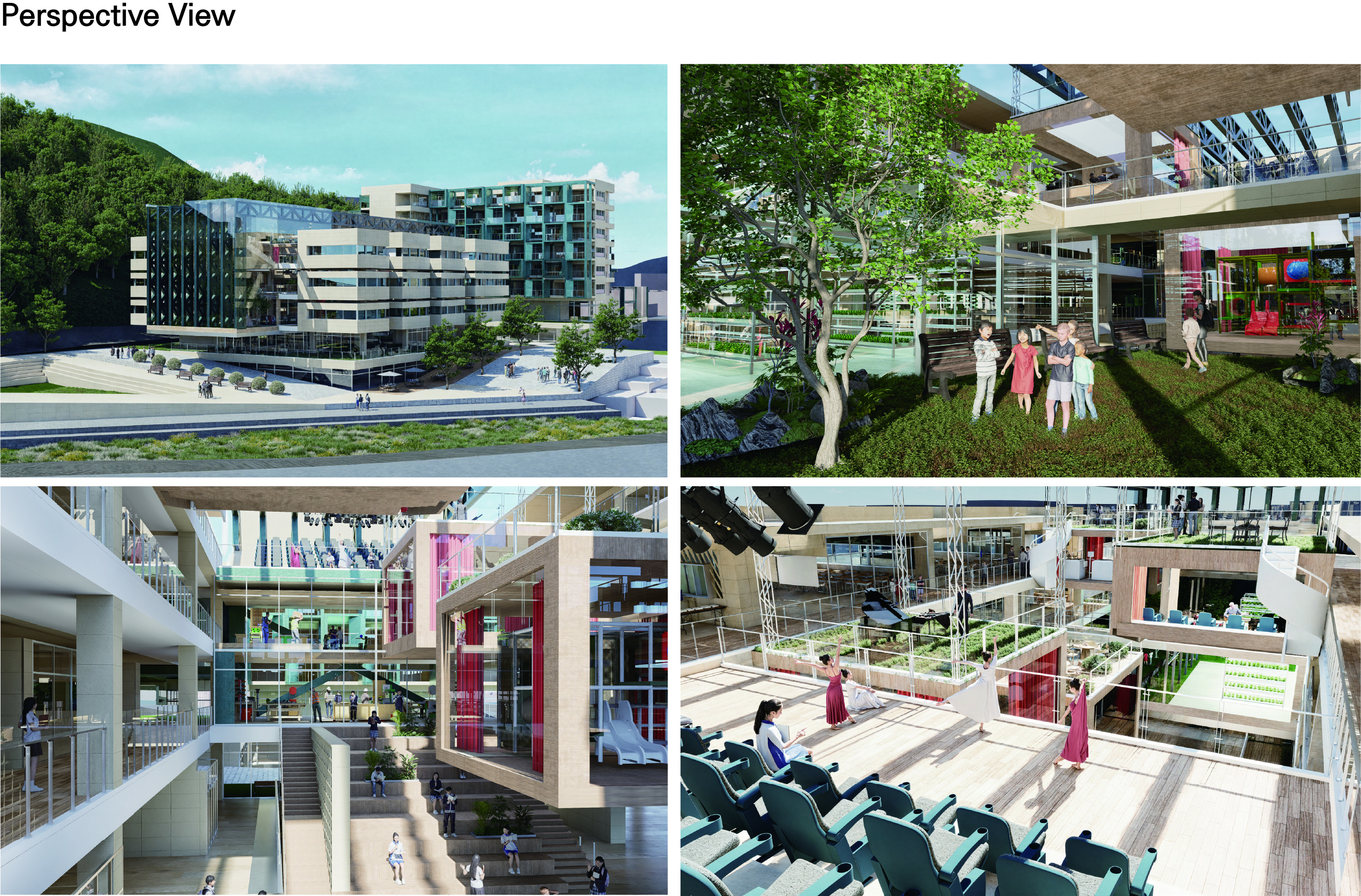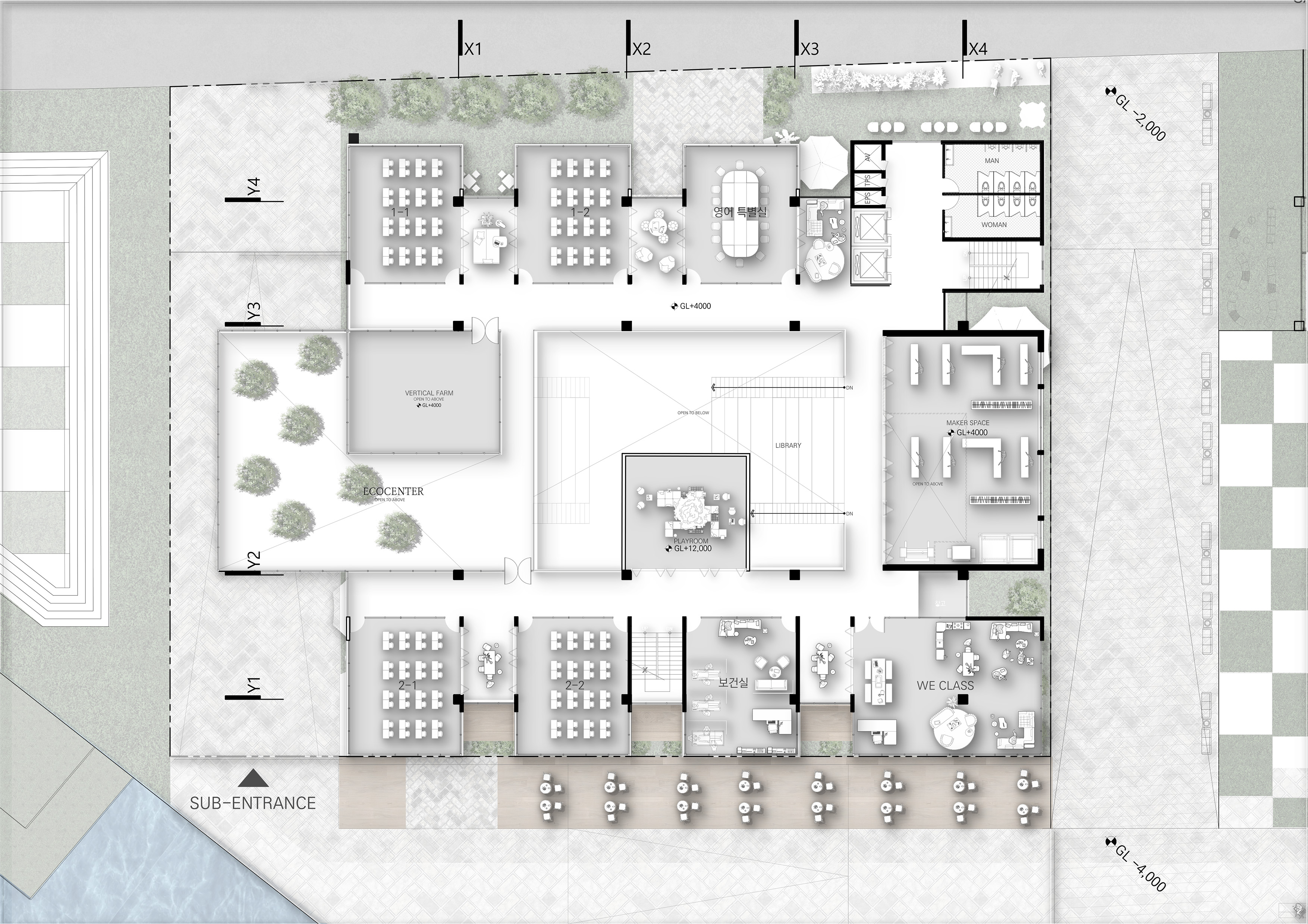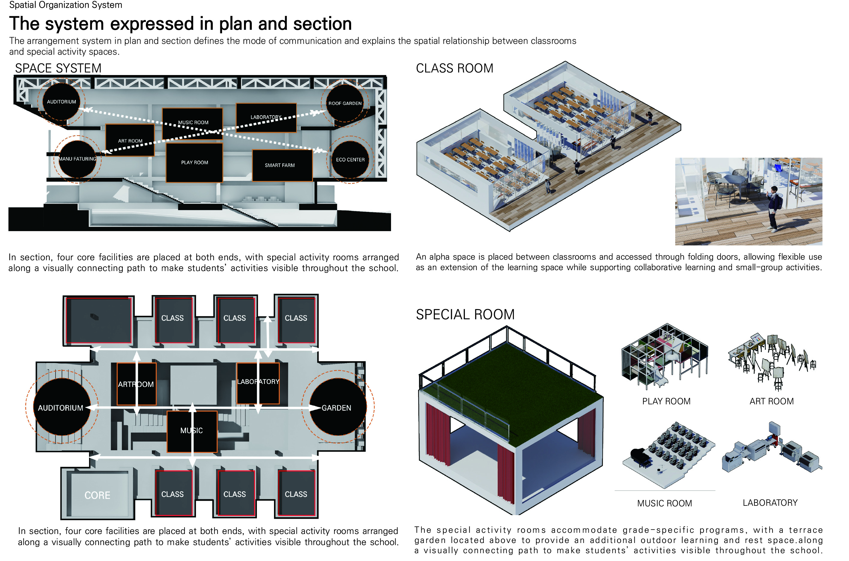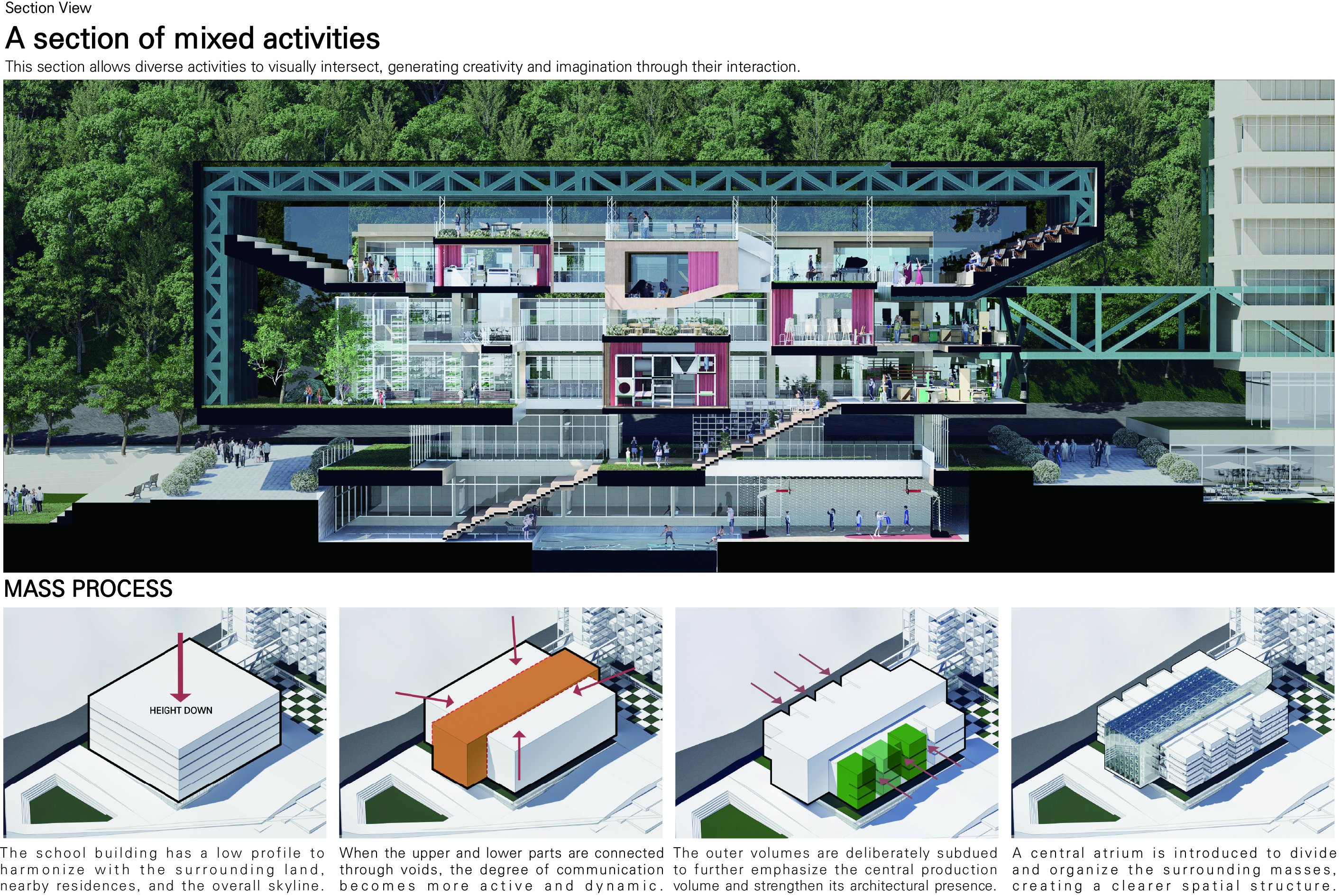 '생산형 학교(Production School)' 프로젝트는 다양한 학습 및 특별 활동이 단면상에서 시각적으로 교차하며 학생들의 창의력과 상상력을 자극하도록 설계된 혼합된 단면 구조의 학교입니다. 주변 지형 및 주택가의 스카이라인과 조화를 이루도록 건물의 높이를 전반적으로 낮추었으며, 매스 중앙에 아트리움을 도입해 공간을 분절하면서도 시각적 소통을 활성화하고 건축적 존재감을 높였습니다. 내부 공간은 1층에 교실 대신 도서관과 갤러리 같은 대규모 공유 공간을 중심에 배치하여 교류의 출발점으로 삼았고, 2층과 3층으로 올라갈수록 일반 교실과 특별 활동실이 시각적으로 겹치며 양 측면에서 중앙 보이드 공간을 내려다볼 수 있게 설계되었습니다. 단면상 건물의 양 끝에 4개의 거점 공간을 배치하고, 시각적으로 연결된 동선을 따라 스마트팜, 에코센터, 미술실, 음악실 등의 특별 활동실을 배열하여 학생들의 다양한 활동이 학교 전체에서 투명하게 드러나도록 유도했습니다. 더불어 교실 사이에는 폴딩 도어로 열고 닫을 수 있는 알파 공간을 두어 소그룹 협업 학습이나 학습 공간의 유연한 확장을 지원합니다.