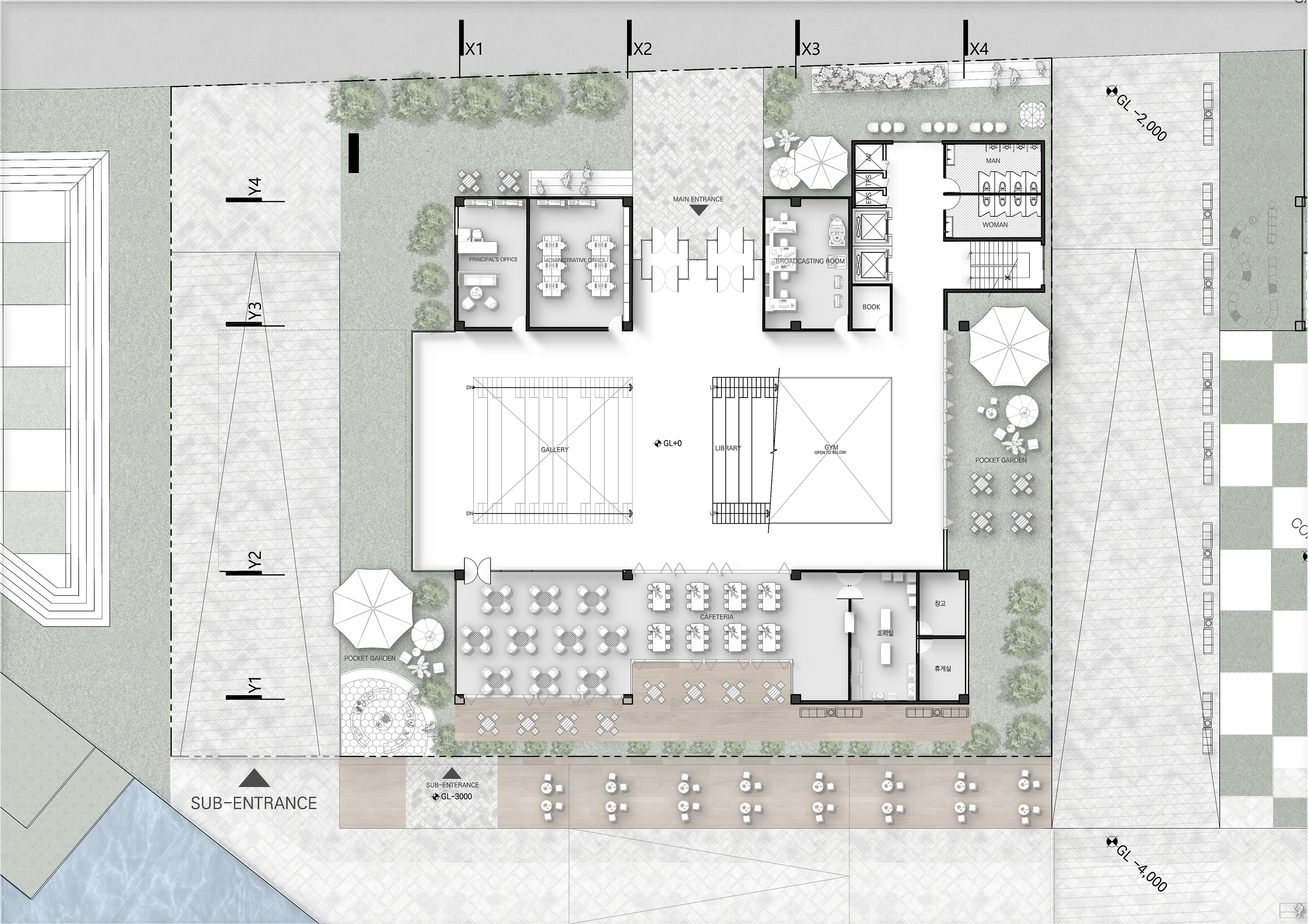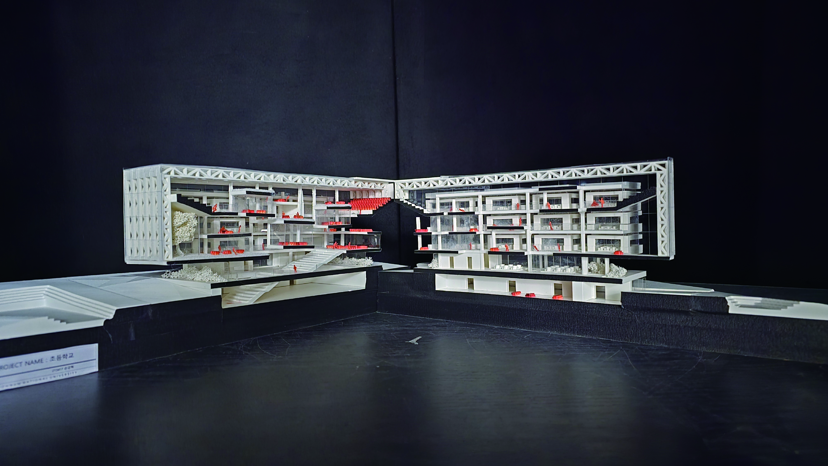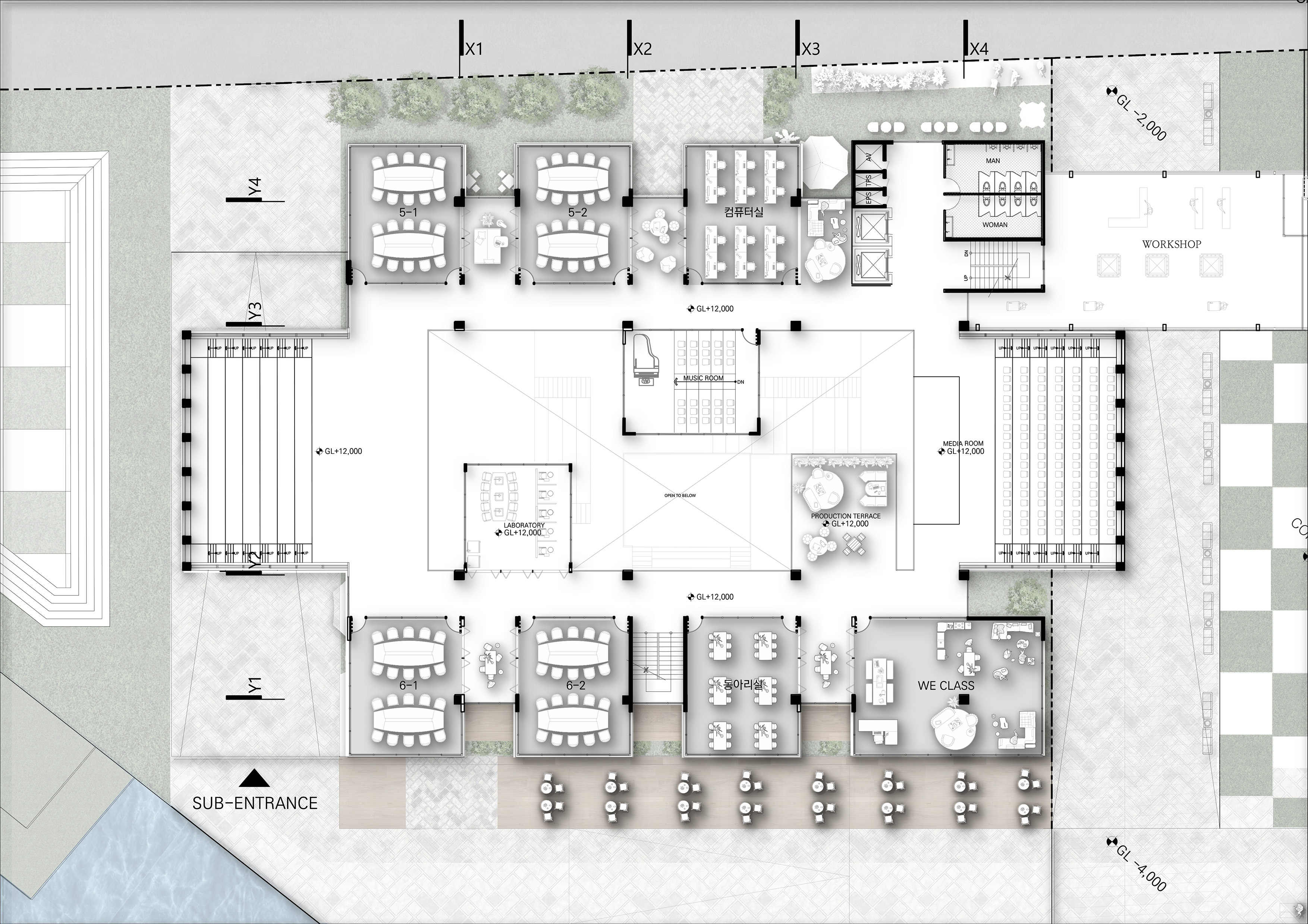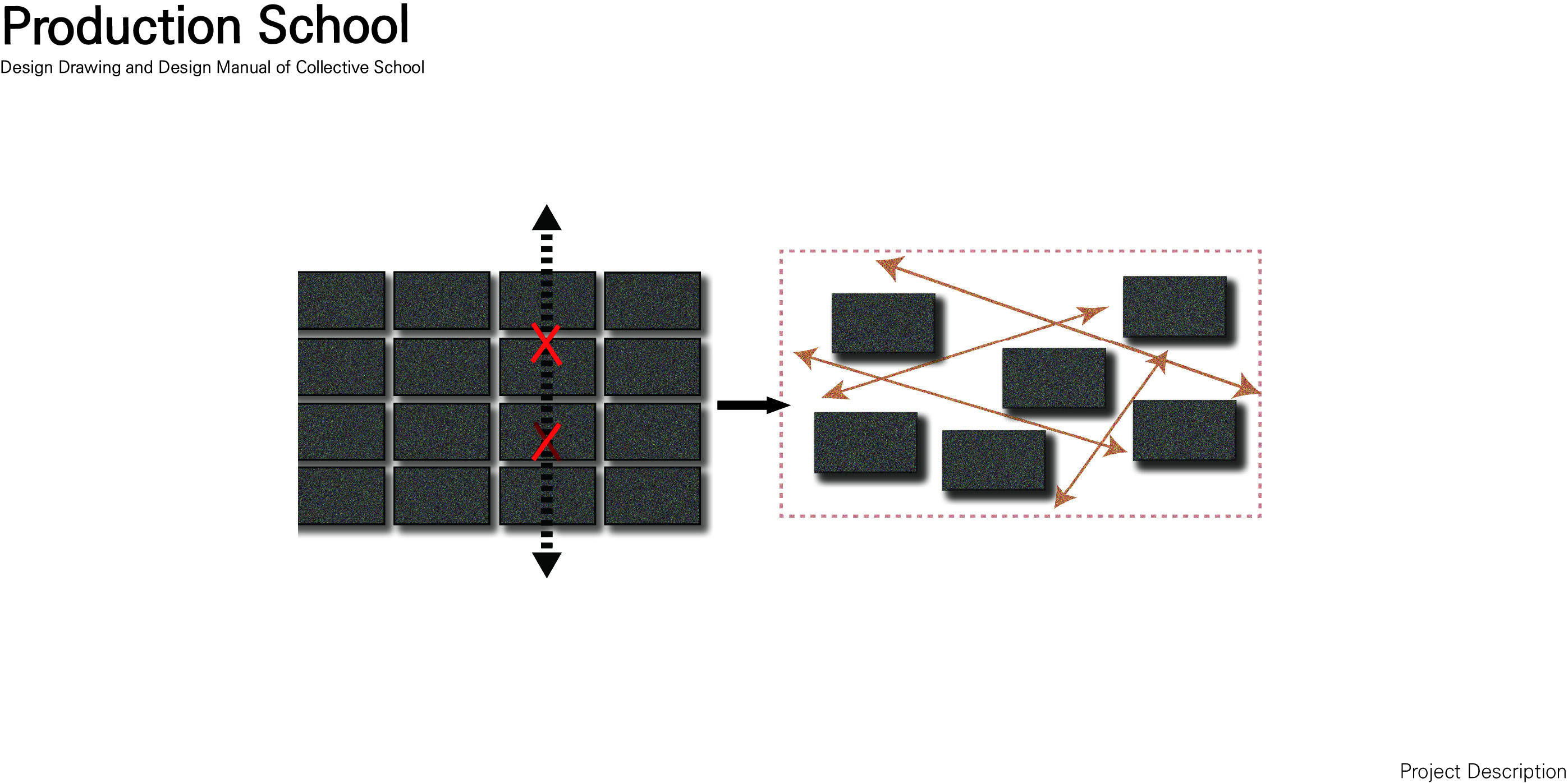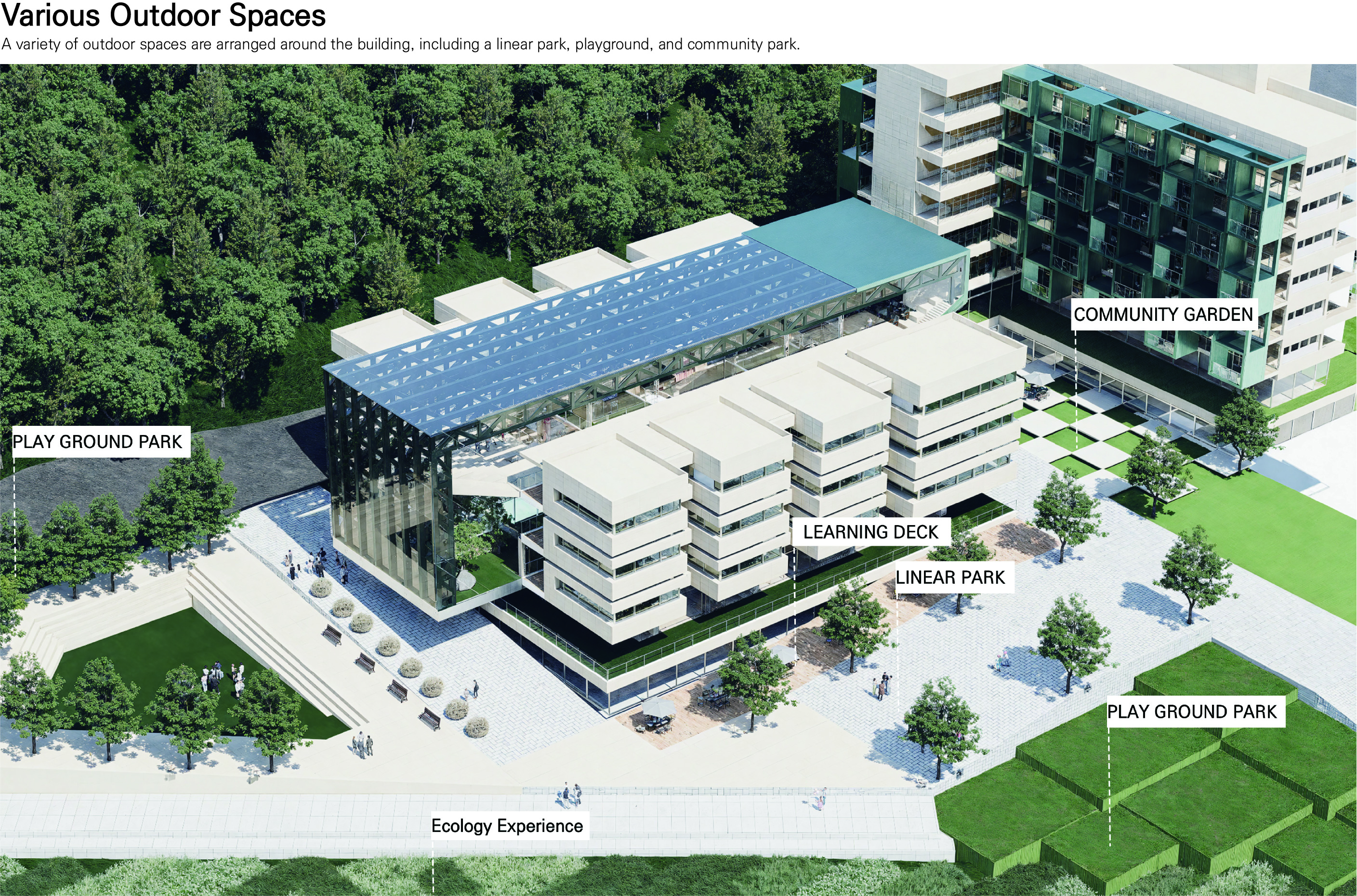 '생산형 학교(Production School)' 프로젝트는 다양한 학습 및 특별 활동이 단면상에서 시각적으로 교차하며 학생들의 창의력과 상상력을 자극하도록 설계된 혼합된 단면 구조의 학교입니다. 주변 지형 및 주택가의 스카이라인과 조화를 이루도록 건물의 높이를 전반적으로 낮추었으며, 매스 중앙에 아트리움을 도입해 공간을 분절하면서도 시각적 소통을 활성화하고 건축적 존재감을 높였습니다. 내부 공간은 1층에 교실 대신 도서관과 갤러리 같은 대규모 공유 공간을 중심에 배치하여 교류의 출발점으로 삼았고, 2층과 3층으로 올라갈수록 일반 교실과 특별 활동실이 시각적으로 겹치며 양 측면에서 중앙 보이드 공간을 내려다볼 수 있게 설계되었습니다. 단면상 건물의 양 끝에 4개의 거점 공간을 배치하고, 시각적으로 연결된 동선을 따라 스마트팜, 에코센터, 미술실, 음악실 등의 특별 활동실을 배열하여 학생들의 다양한 활동이 학교 전체에서 투명하게 드러나도록 유도했습니다. 더불어 교실 사이에는 폴딩 도어로 열고 닫을 수 있는 알파 공간을 두어 소그룹 협업 학습이나 학습 공간의 유연한 확장을 지원합니다.