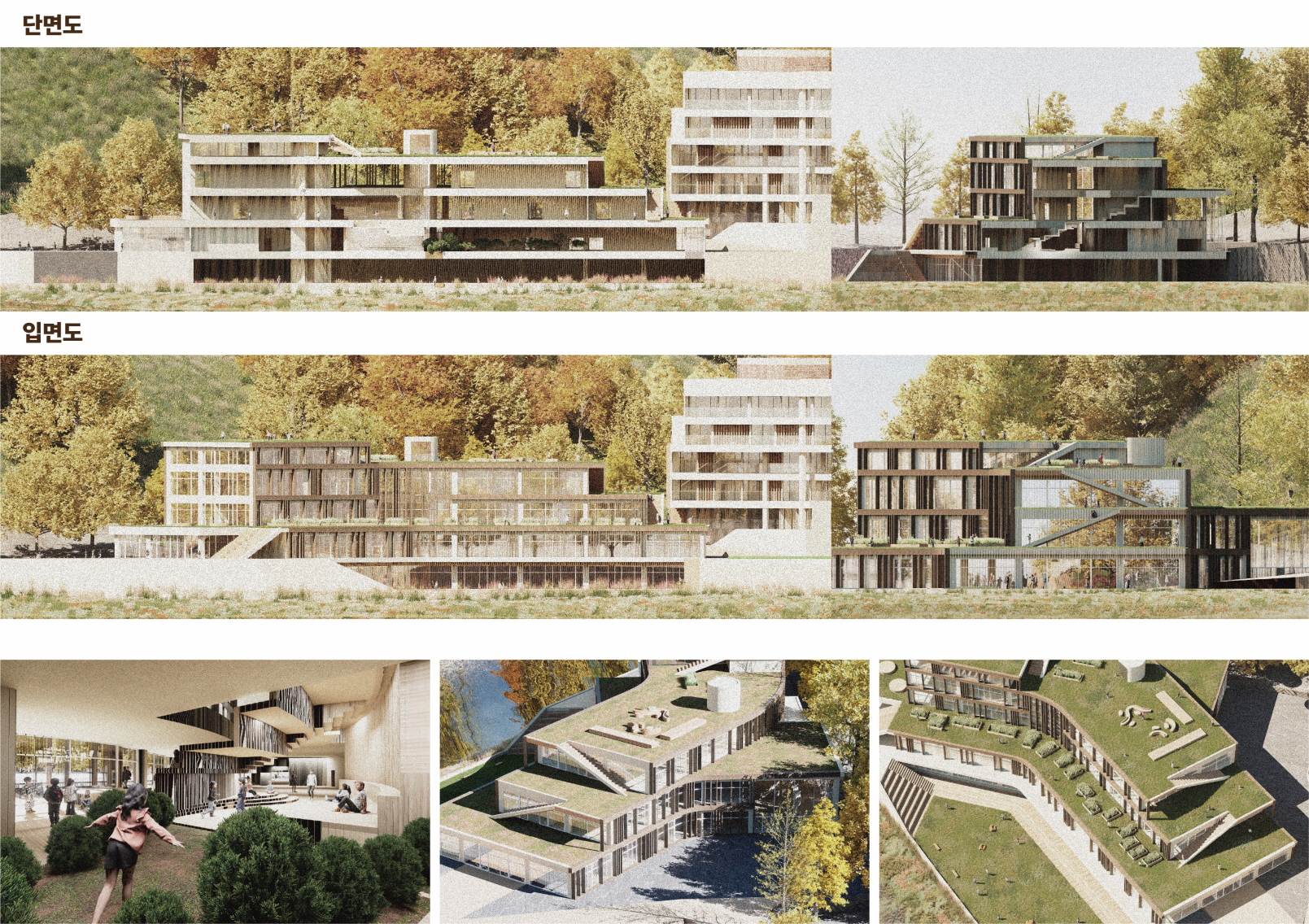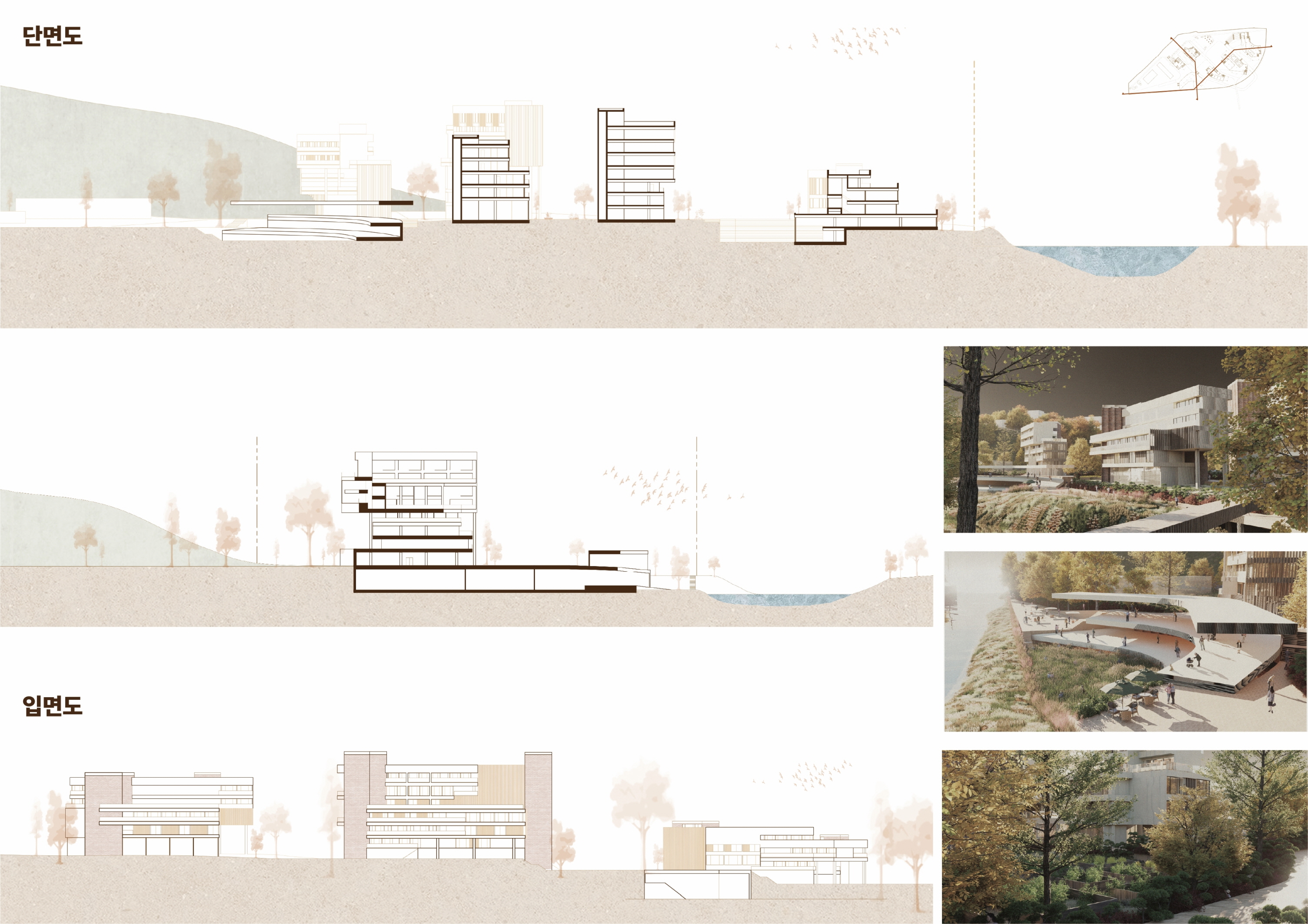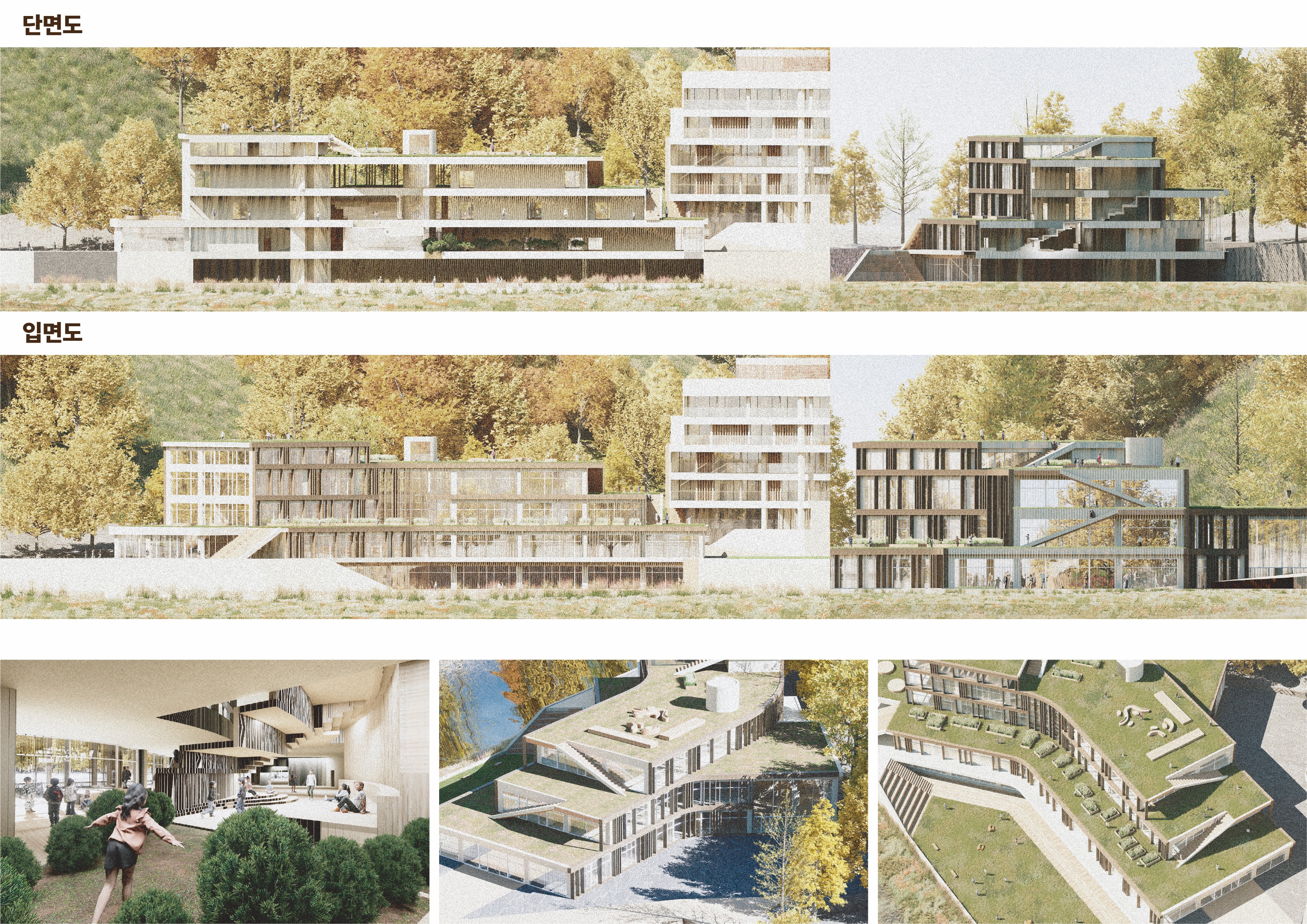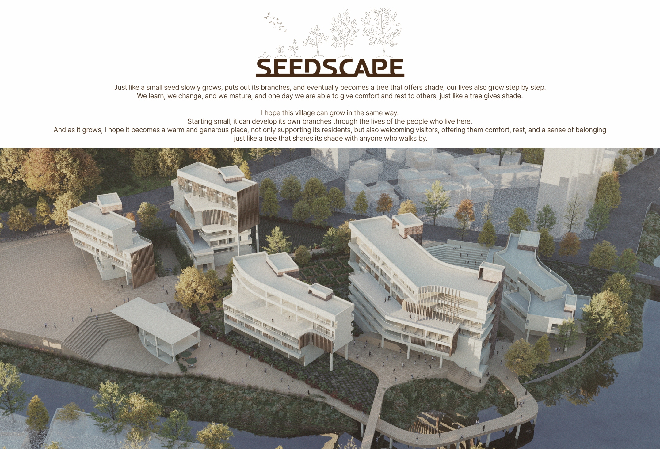 씨드스케이프는 화순과 구도심, 남광주시장 사이에 위치한 도시농부를 위한 마을이다. 도시의 인프라를 유지하면서도 귀농·귀촌을 원하는 도시민이 자연과 가까운 삶을 시작할 수 있는 입지적·경관적 장점을 지닌다. 씨앗의 성장 과정을 개념으로 삼아 다양한 연령층이 함께 거주하며 교류하도록 계획하였다. 대지의 레벨이 낮은 곳에는 외부와 활발히 소통하는 공용 공간과 커뮤니티 시설을 배치하고, 높은 곳으로 갈수록 보다 사적인 주거 공간을 두어 점차 고요해지는 환경을 형성하였다. 지배적 축에 직교하는 축을 설정한 뒤 이를 비틀어 씨앗에서 가지가 뻗어나가듯 매스를 전개하였으며, 코어를 중심으로 공간이 확장되도록 구성하였다. 매스의 결합부는 필렛 처리하여 부드럽게 연결함으로써 성장의 이미지를 공간적으로 드러내고자 하였다. 이 마을은 거주자뿐 아니라 외부인에게도 열려 있는 공동체로서, 도시와 자연을 매개하는 새로운 삶의 방식을 제안하는 공간이다.