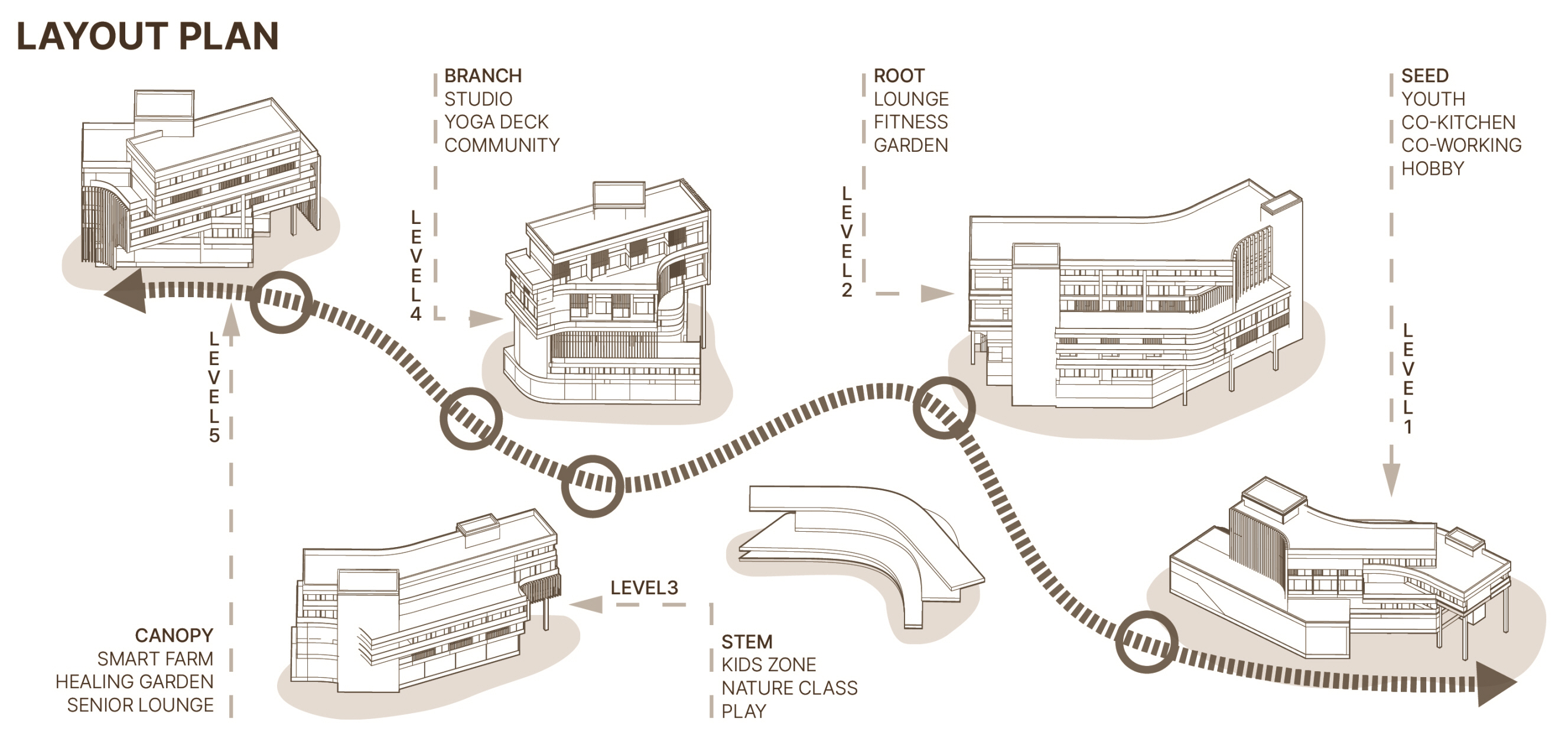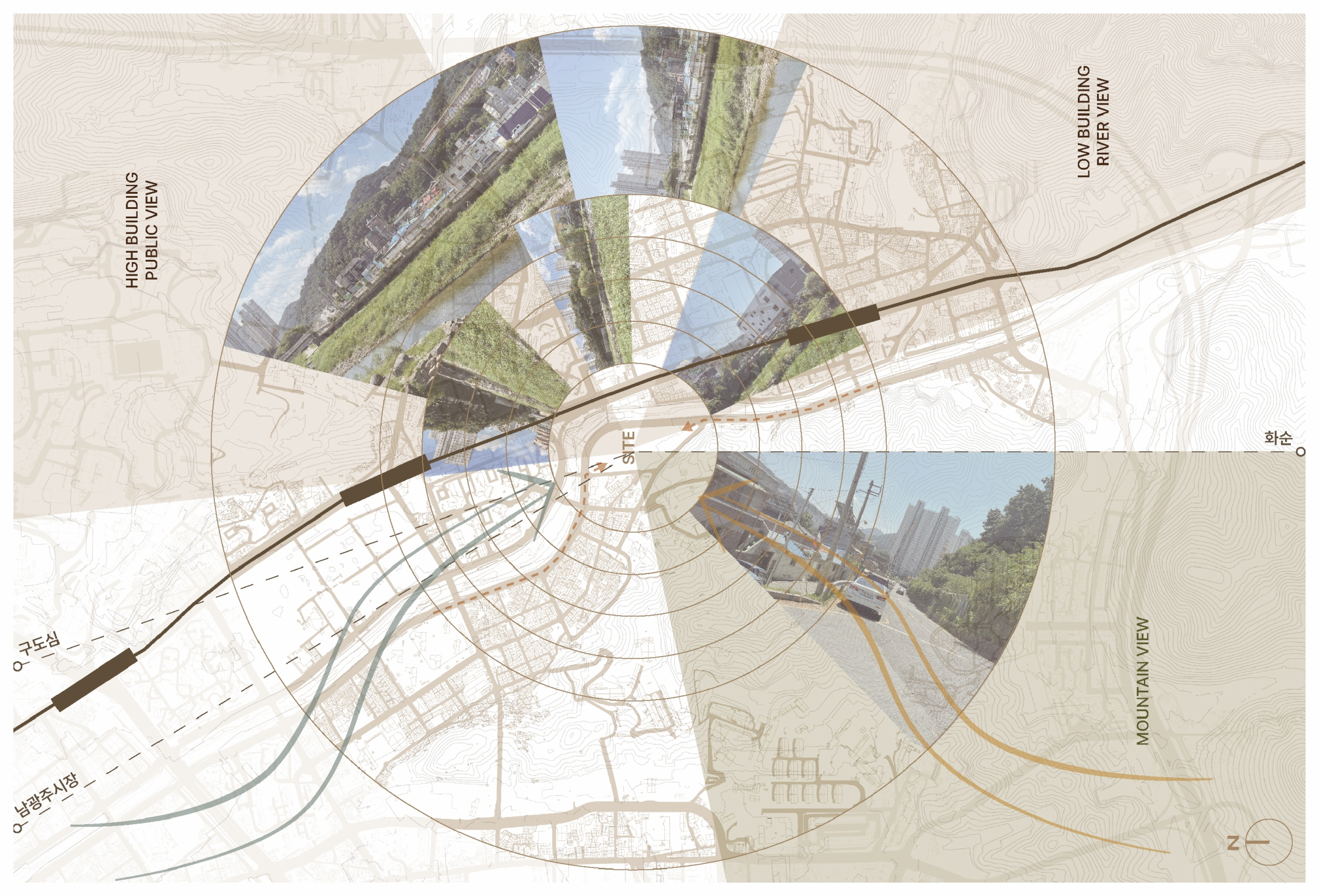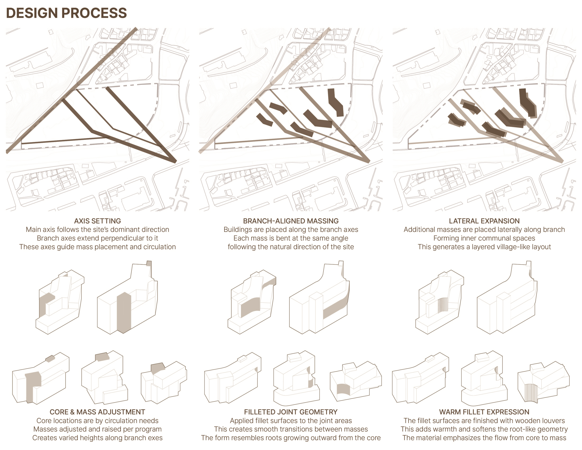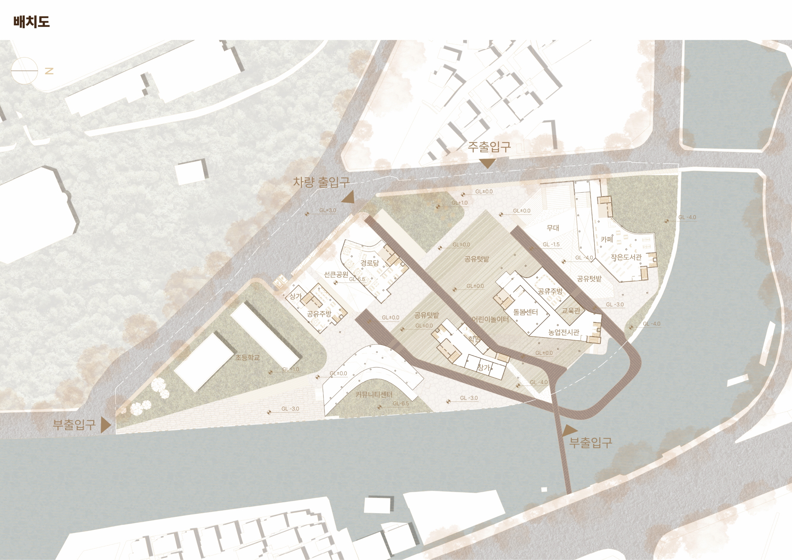 씨드스케이프는 화순과 구도심, 남광주시장 사이에 위치한 도시농부를 위한 마을이다. 도시의 인프라를 유지하면서도 귀농·귀촌을 원하는 도시민이 자연과 가까운 삶을 시작할 수 있는 입지적·경관적 장점을 지닌다. 씨앗의 성장 과정을 개념으로 삼아 다양한 연령층이 함께 거주하며 교류하도록 계획하였다. 대지의 레벨이 낮은 곳에는 외부와 활발히 소통하는 공용 공간과 커뮤니티 시설을 배치하고, 높은 곳으로 갈수록 보다 사적인 주거 공간을 두어 점차 고요해지는 환경을 형성하였다. 지배적 축에 직교하는 축을 설정한 뒤 이를 비틀어 씨앗에서 가지가 뻗어나가듯 매스를 전개하였으며, 코어를 중심으로 공간이 확장되도록 구성하였다. 매스의 결합부는 필렛 처리하여 부드럽게 연결함으로써 성장의 이미지를 공간적으로 드러내고자 하였다. 이 마을은 거주자뿐 아니라 외부인에게도 열려 있는 공동체로서, 도시와 자연을 매개하는 새로운 삶의 방식을 제안하는 공간이다.