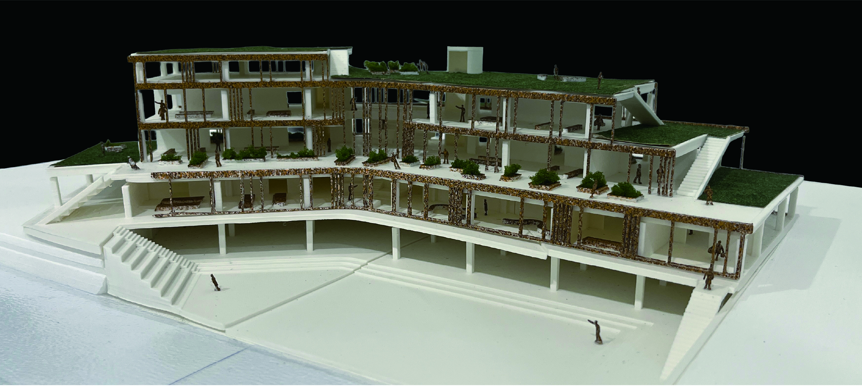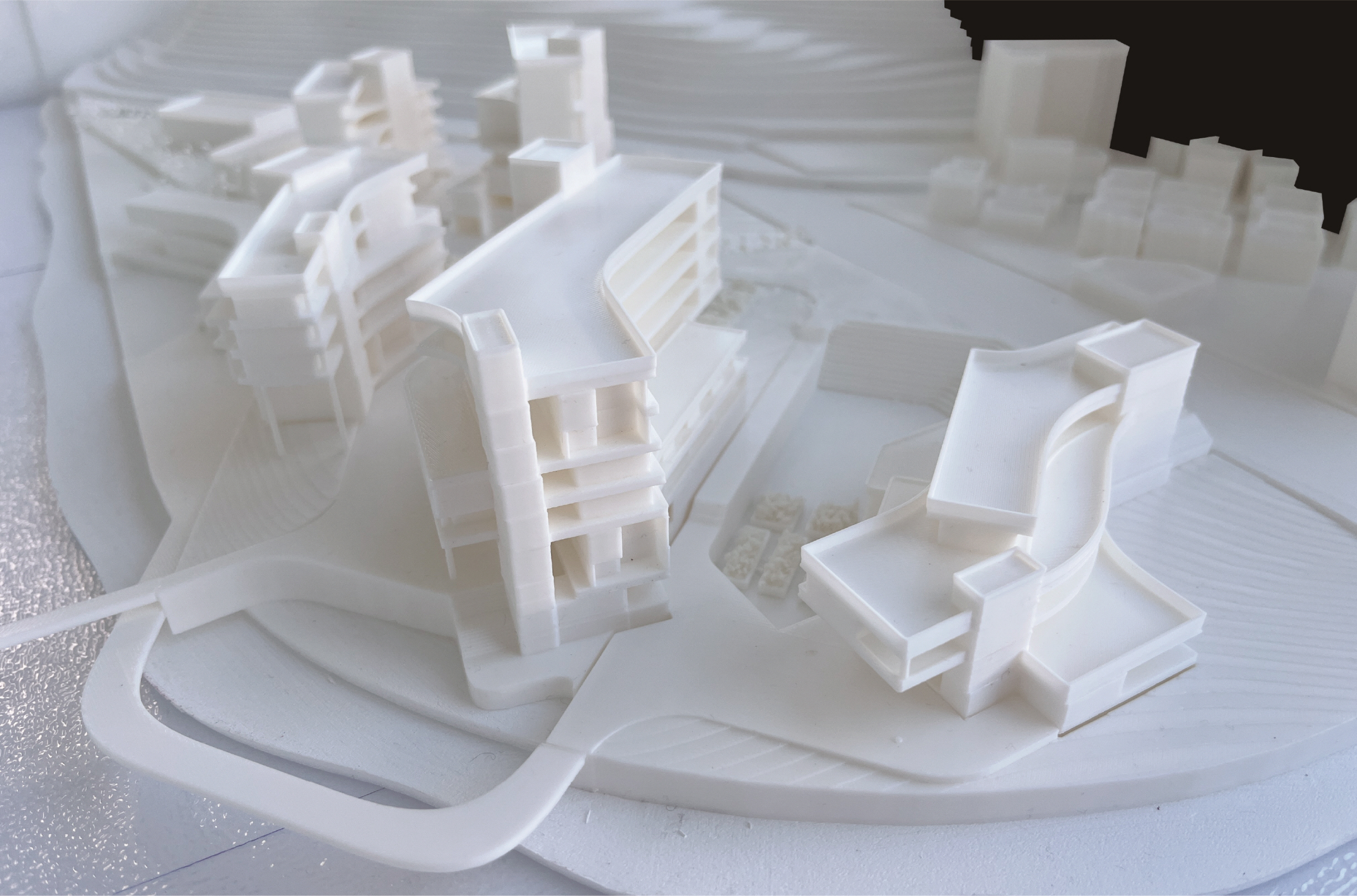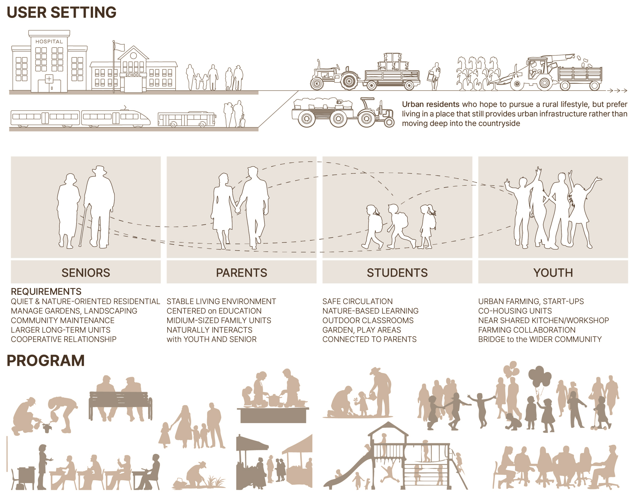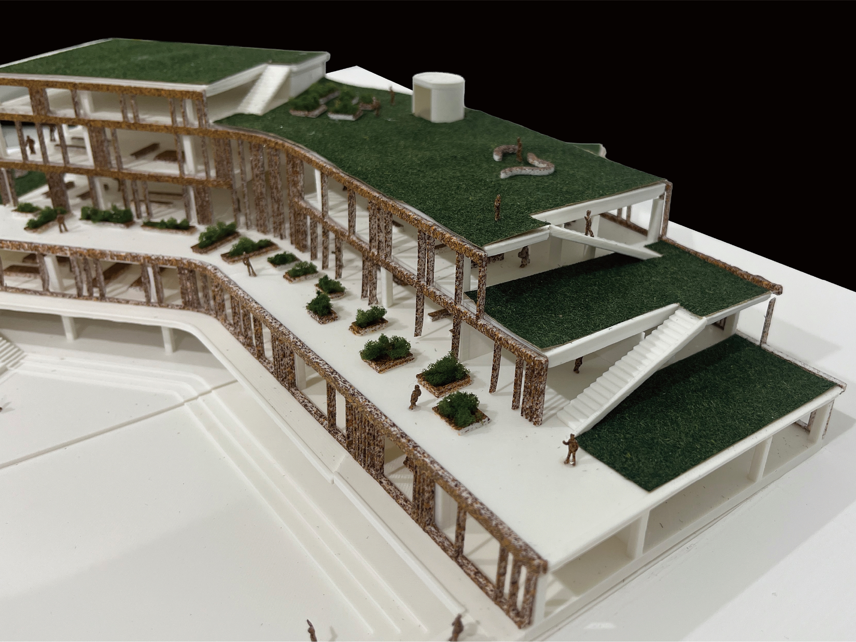 씨드스케이프는 화순과 구도심, 남광주시장 사이에 위치한 도시농부를 위한 마을이다. 도시의 인프라를 유지하면서도 귀농·귀촌을 원하는 도시민이 자연과 가까운 삶을 시작할 수 있는 입지적·경관적 장점을 지닌다. 씨앗의 성장 과정을 개념으로 삼아 다양한 연령층이 함께 거주하며 교류하도록 계획하였다. 대지의 레벨이 낮은 곳에는 외부와 활발히 소통하는 공용 공간과 커뮤니티 시설을 배치하고, 높은 곳으로 갈수록 보다 사적인 주거 공간을 두어 점차 고요해지는 환경을 형성하였다. 지배적 축에 직교하는 축을 설정한 뒤 이를 비틀어 씨앗에서 가지가 뻗어나가듯 매스를 전개하였으며, 코어를 중심으로 공간이 확장되도록 구성하였다. 매스의 결합부는 필렛 처리하여 부드럽게 연결함으로써 성장의 이미지를 공간적으로 드러내고자 하였다. 이 마을은 거주자뿐 아니라 외부인에게도 열려 있는 공동체로서, 도시와 자연을 매개하는 새로운 삶의 방식을 제안하는 공간이다.