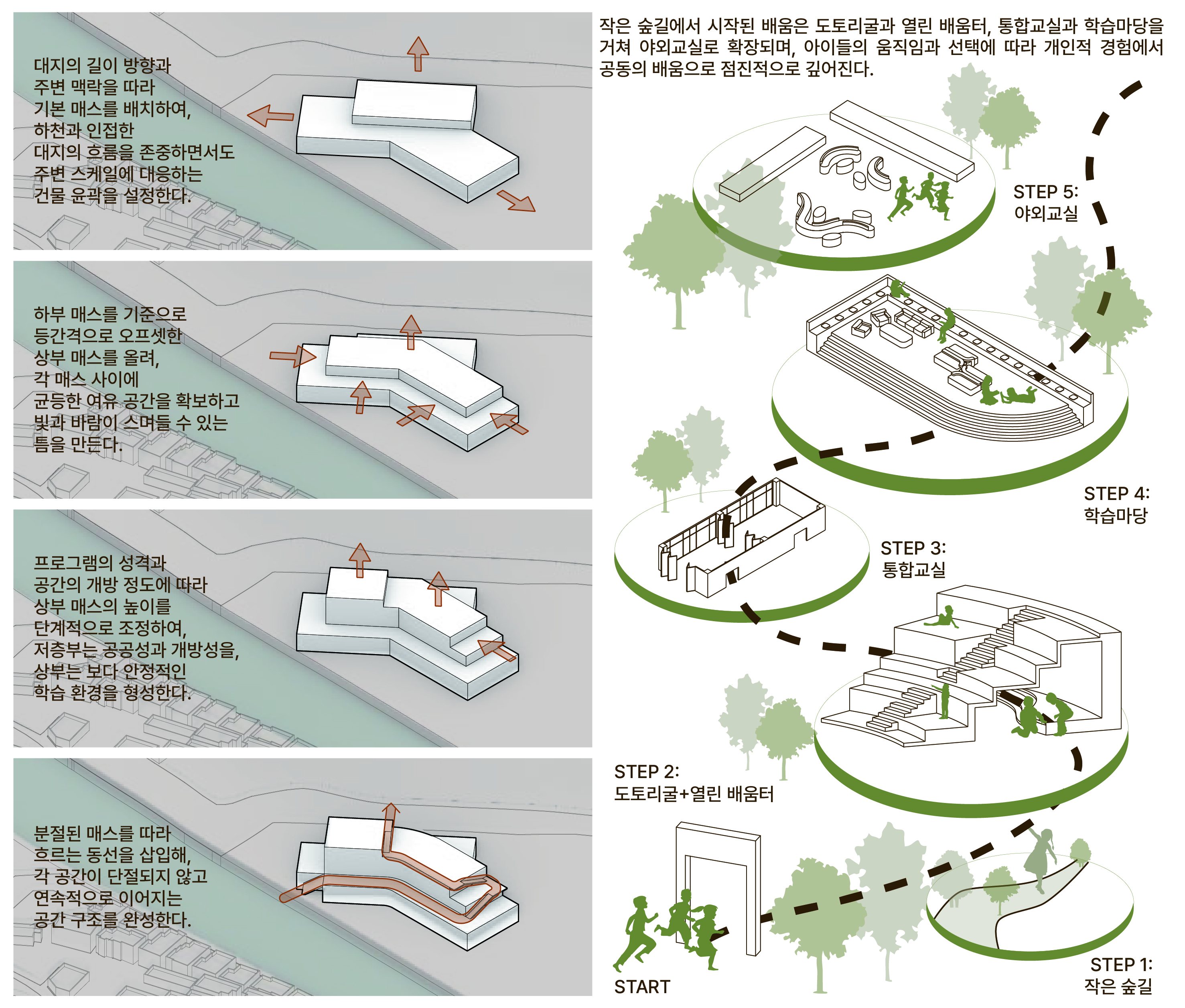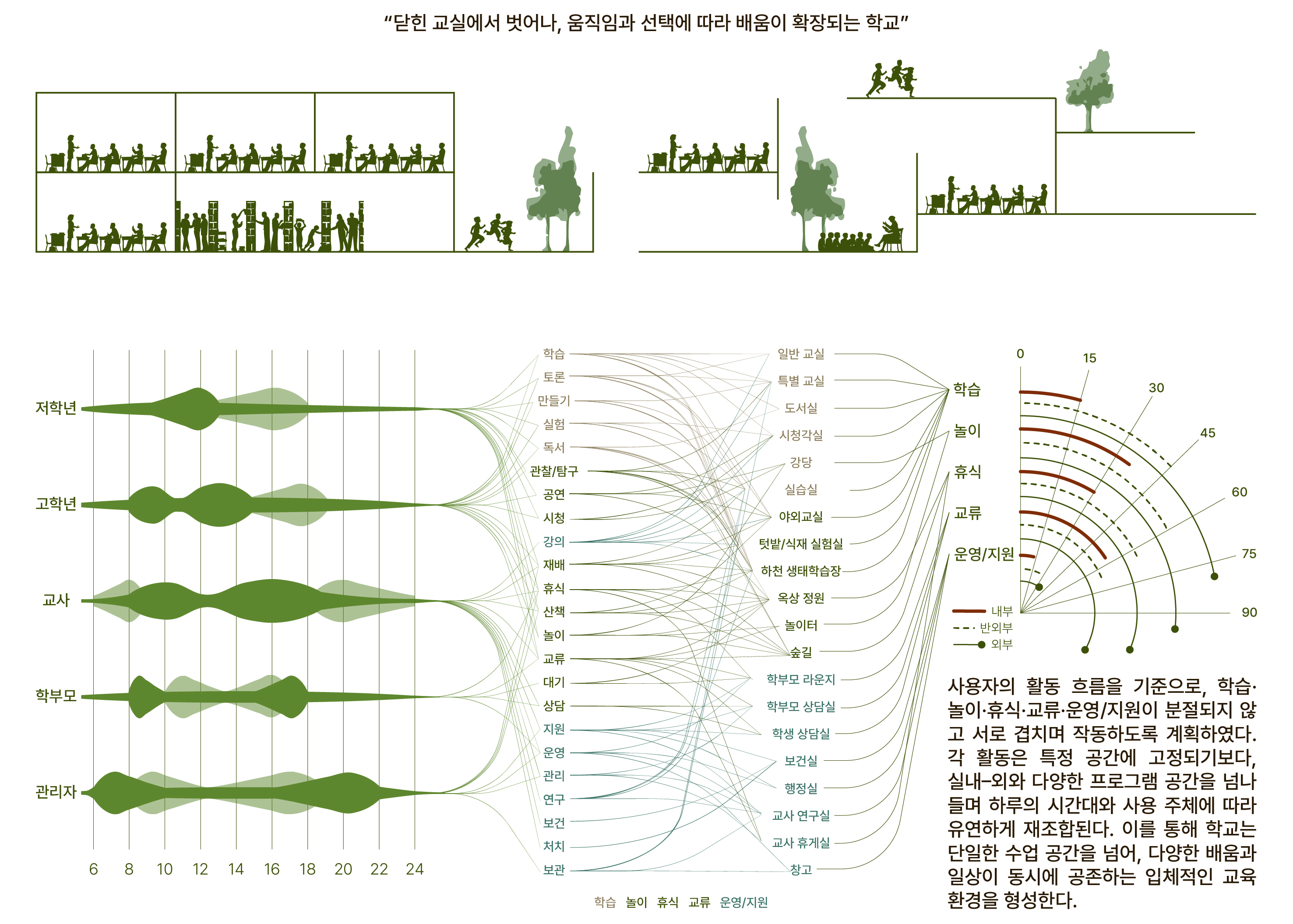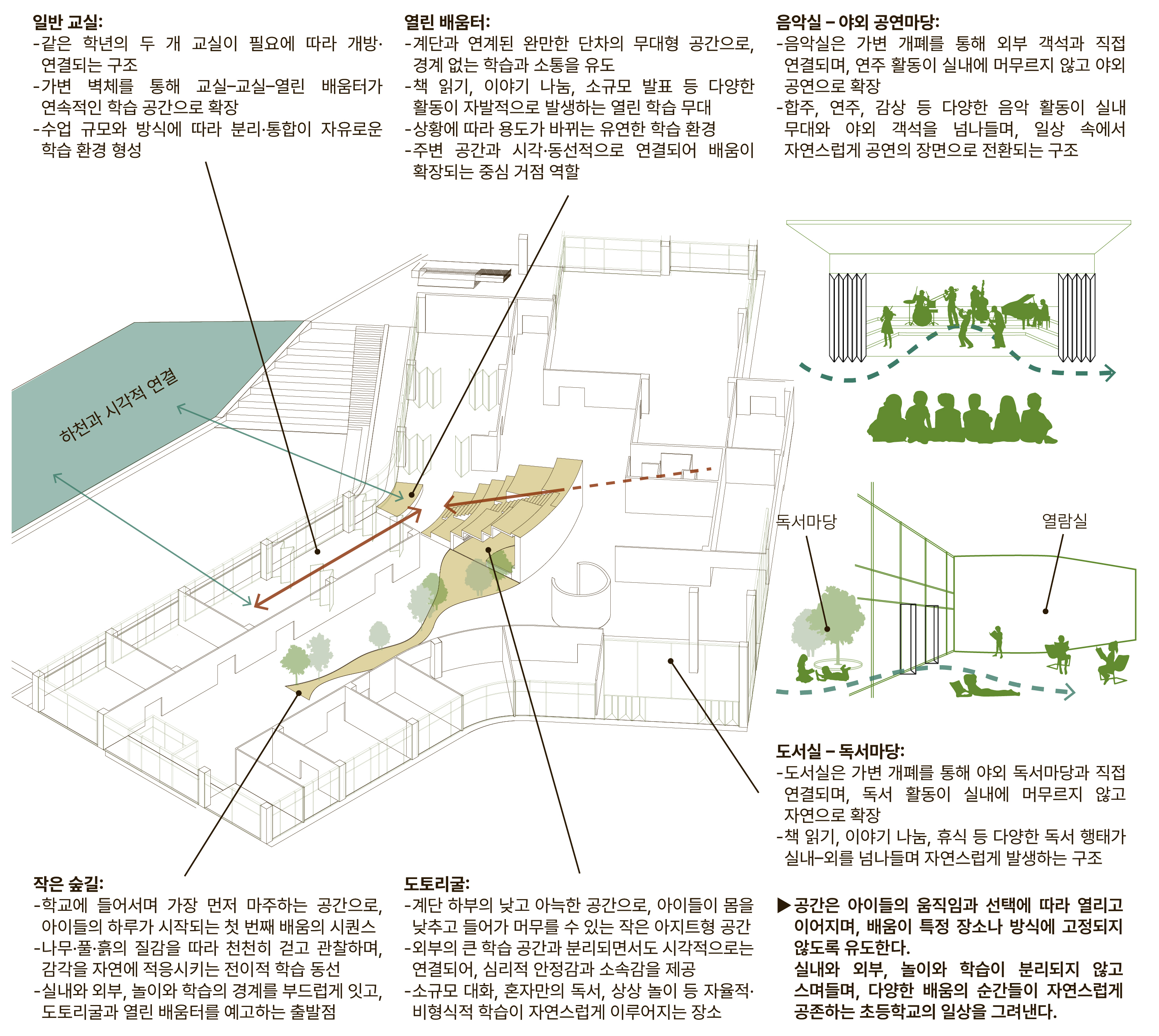 Alt + Tab은 작업 화면을 전환하는 단축키의 개념을 공간에 적용한 것이다. 이 학교의 공간은 하나의 기능에 고정되지 않고 상황에 따라 성격이 바뀌는 구조이다. 교실은 열린 공간으로, 실내는 외부로, 학습은 놀이와 공연으로 전환된다. 하천과 맞닿은 하부 레벨의 음악실은 천변과 연계되어 배치되며, 개방 시 야외 객석과 연결된 공연 공간으로 확장된다. 작은 숲길은 학교에 들어서며 마주하는 완충 공간으로, 외부에서 내부로의 전이를 유도한다. 계단 하부의 도토리굴은 낮은 스케일의 머무름 공간으로 아이들의 소규모 활동을 담는다. 상부의 열린 배움터는 학습과 발표, 공연이 가능한 중심 공간이며, 교실은 서로 및 외부 공간과 유기적으로 열리며 가변적으로 사용된다. 이처럼 공간은 이동의 흐름 속에서 기능이 전환되는 학습 환경을 형성한다.