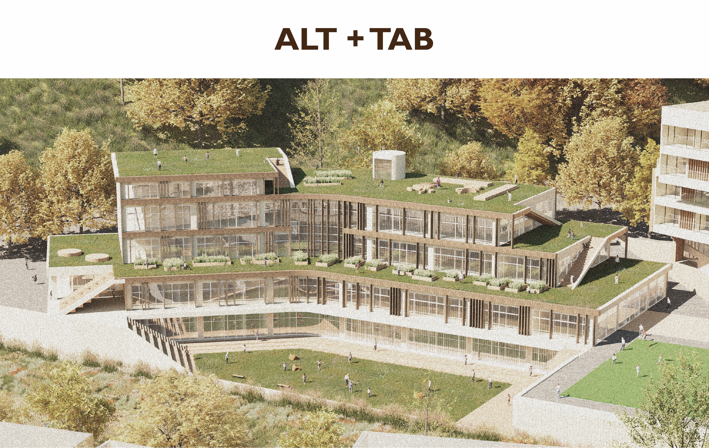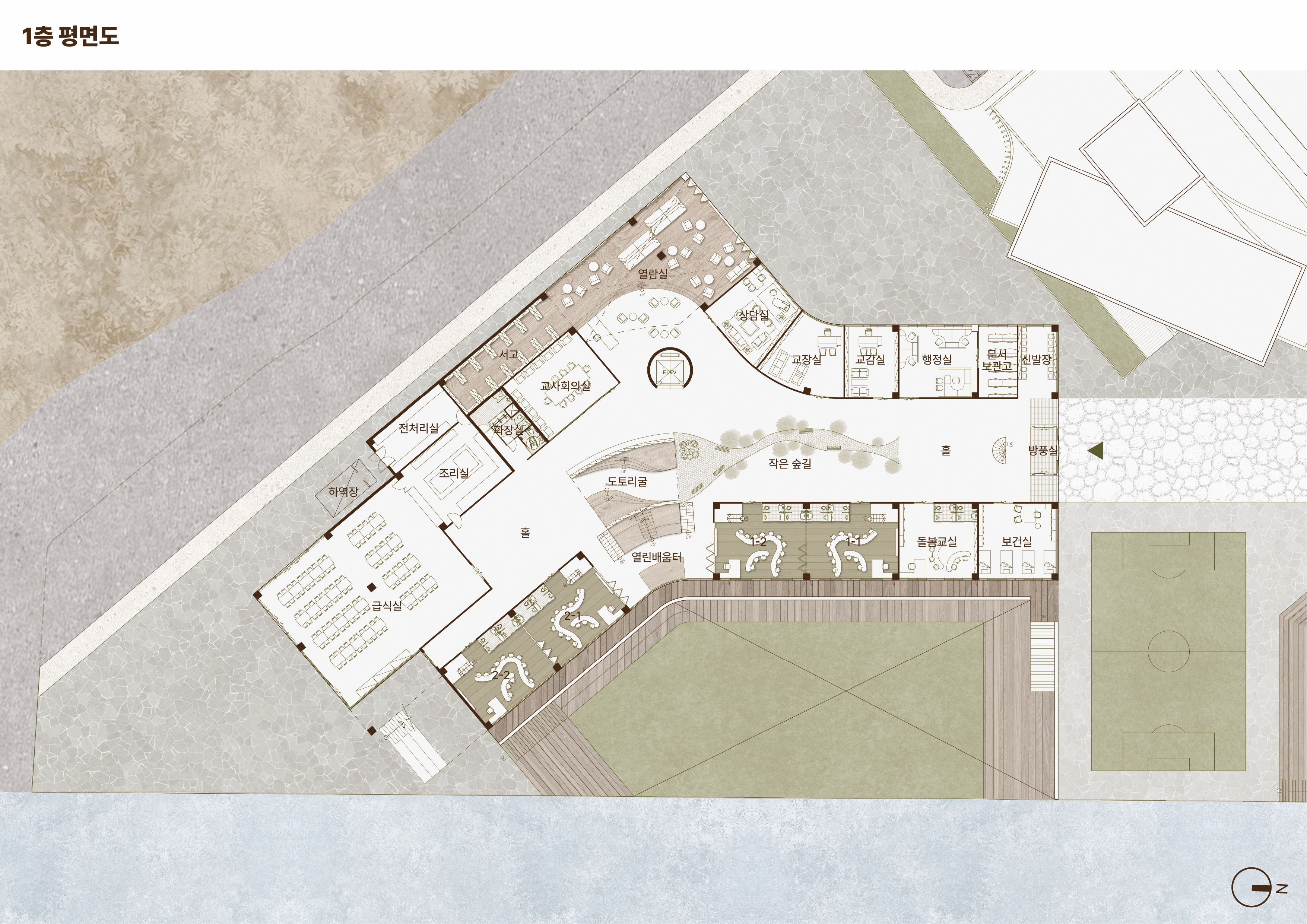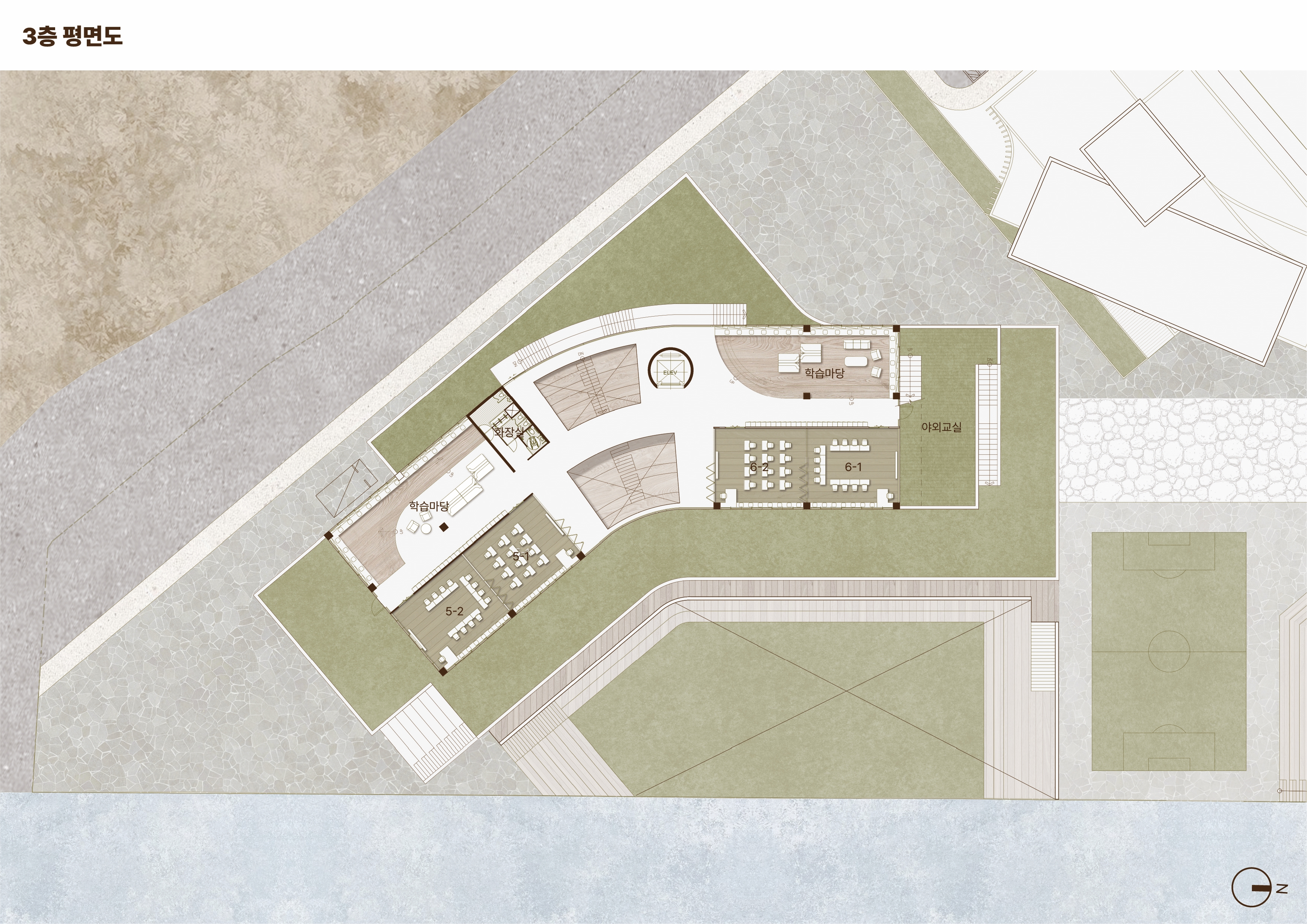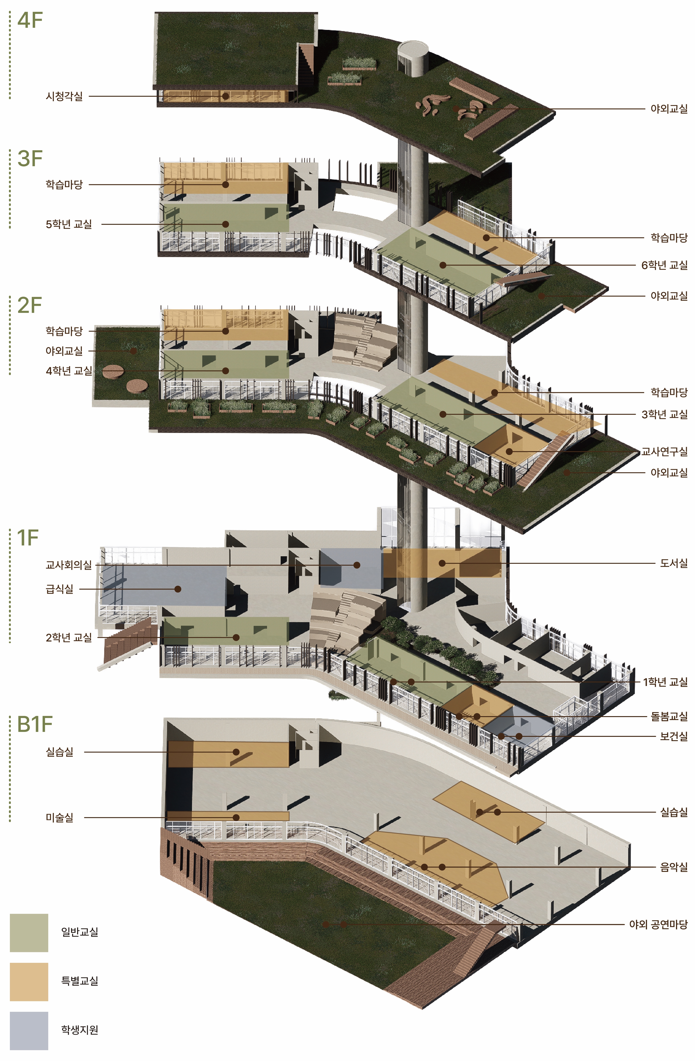 Alt + Tab은 작업 화면을 전환하는 단축키의 개념을 공간에 적용한 것이다. 이 학교의 공간은 하나의 기능에 고정되지 않고 상황에 따라 성격이 바뀌는 구조이다. 교실은 열린 공간으로, 실내는 외부로, 학습은 놀이와 공연으로 전환된다. 하천과 맞닿은 하부 레벨의 음악실은 천변과 연계되어 배치되며, 개방 시 야외 객석과 연결된 공연 공간으로 확장된다. 작은 숲길은 학교에 들어서며 마주하는 완충 공간으로, 외부에서 내부로의 전이를 유도한다. 계단 하부의 도토리굴은 낮은 스케일의 머무름 공간으로 아이들의 소규모 활동을 담는다. 상부의 열린 배움터는 학습과 발표, 공연이 가능한 중심 공간이며, 교실은 서로 및 외부 공간과 유기적으로 열리며 가변적으로 사용된다. 이처럼 공간은 이동의 흐름 속에서 기능이 전환되는 학습 환경을 형성한다.