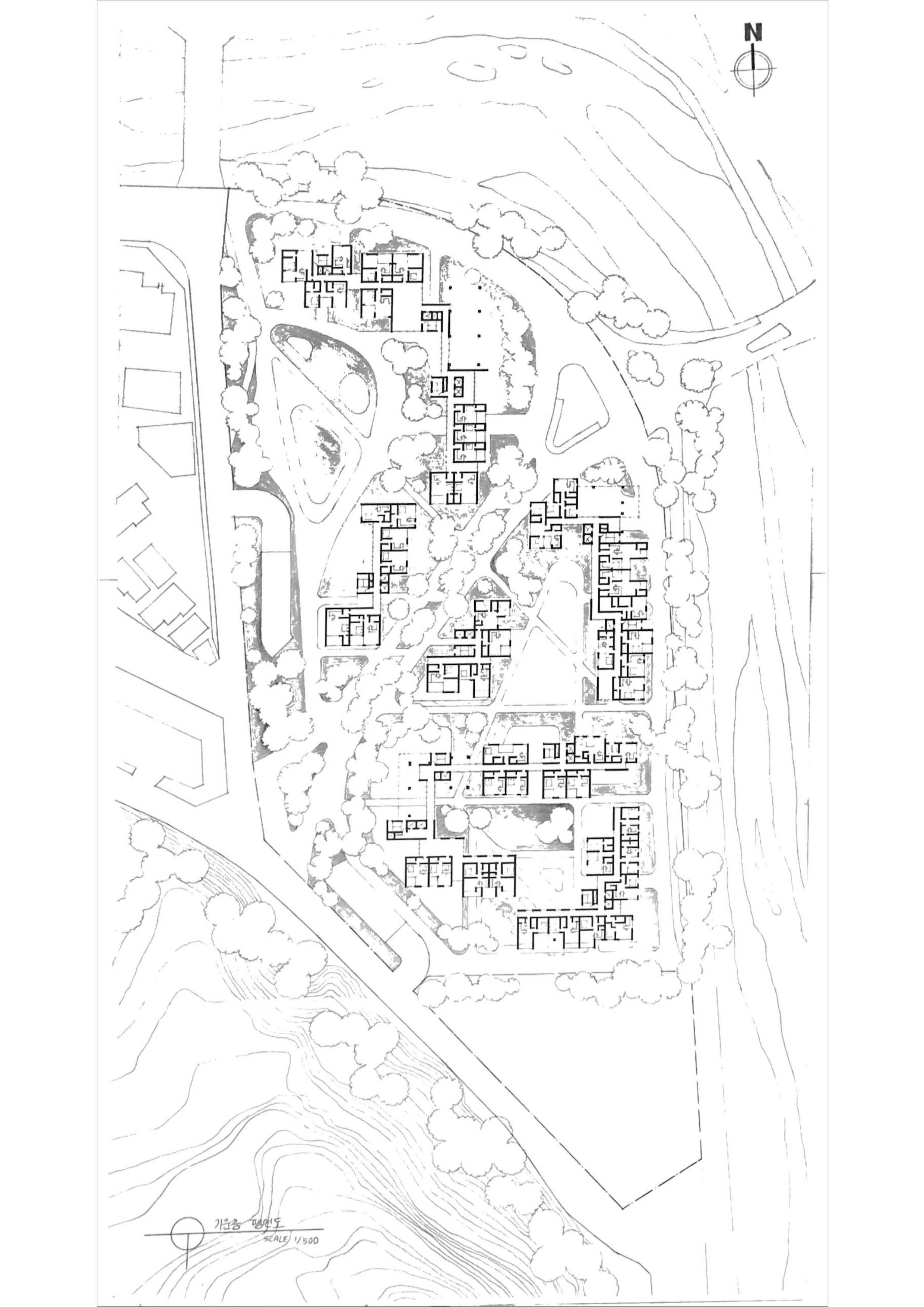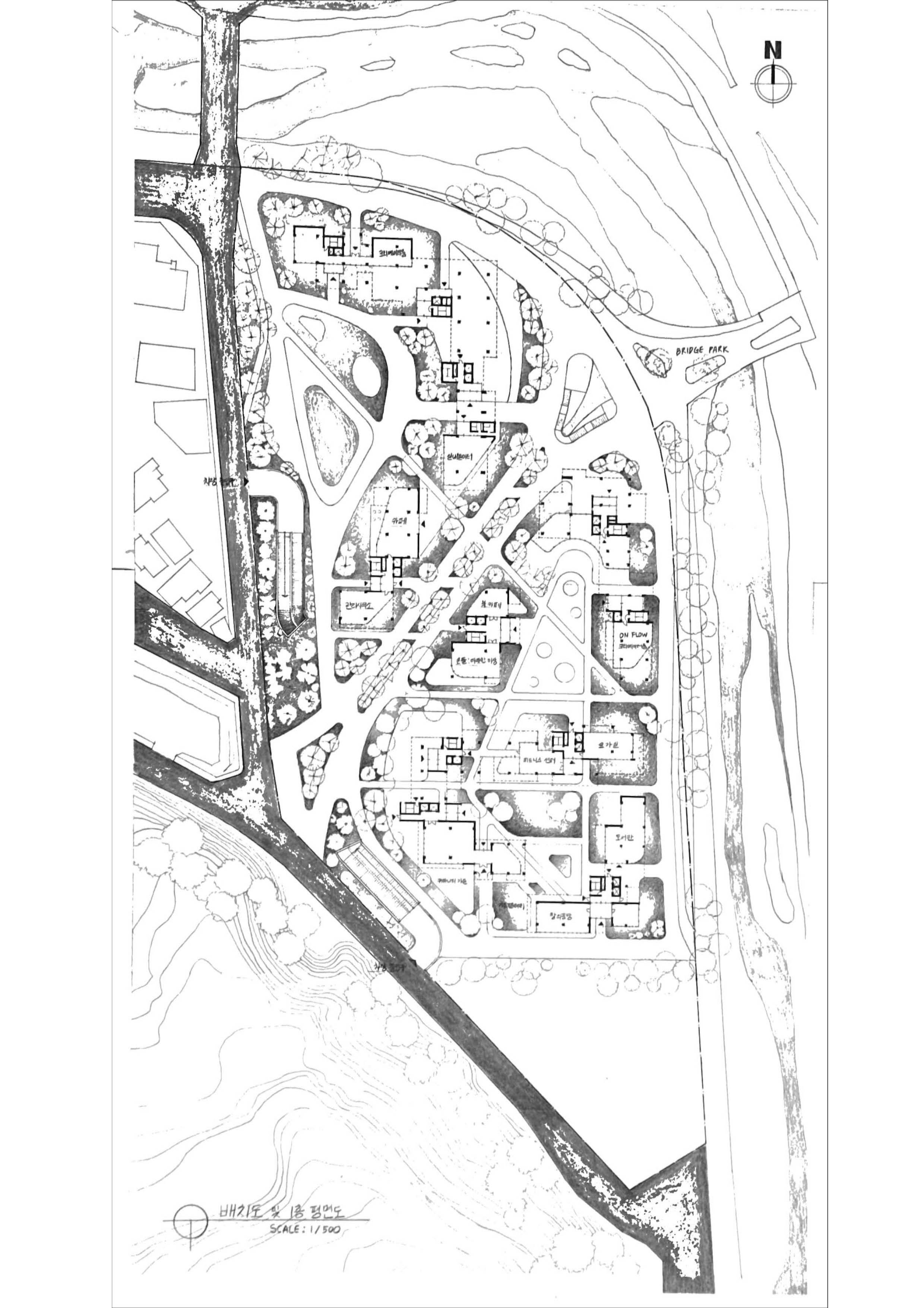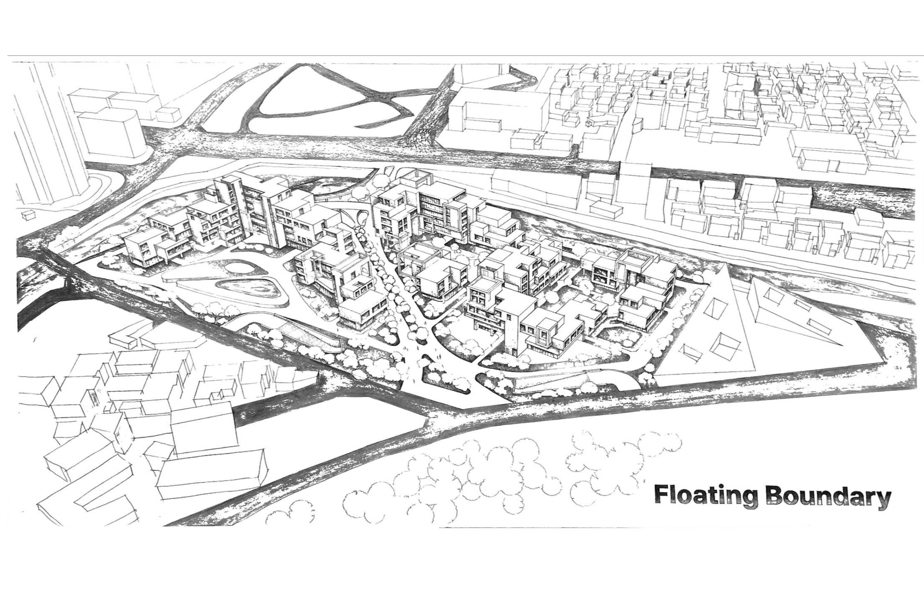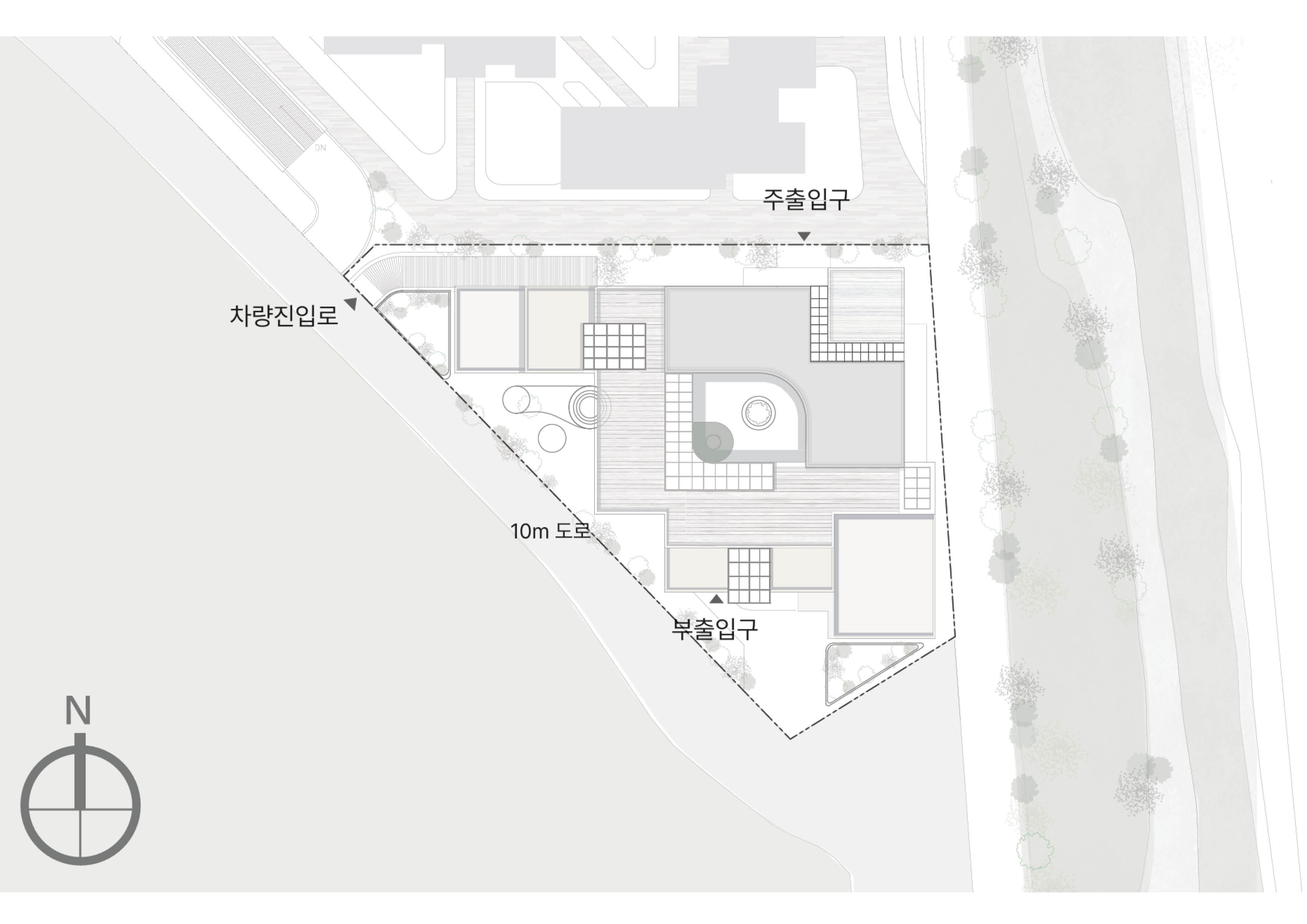 산의 능선을 따라 이어지는 자연의 선형을 건축적 흐름으로 확장하였다. 지형의 결이 흘러내리듯, 주거의 매스 또한 그 흐름을 따라 물결처럼 펼쳐진다. 일부 매스는 지면에서 들어 올려져 하천 위에 부유하는 경계를 형성하며, 자연과 건축, 땅과 하늘 사이의 새로운 층위를 만들어낸다. 이 ‘떠 있는 경계’는 단순한 구조적 틈이 아니라, 주거와 주거 사이, 개인과 공동체를 이어주는 관계의 공간으로 작동한다.