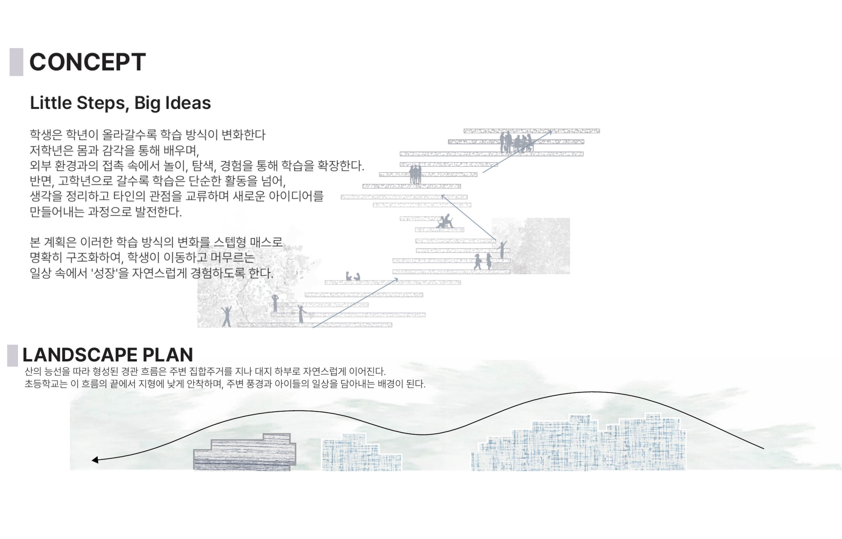 본 계획은 이러한 학습 방식의 변화를 스텝형 매스로 명확히 구조화하여, 학생이 이동하고 머무르는 일상 속에서 '성장'을 자연스럽게 경험하도록 한다.