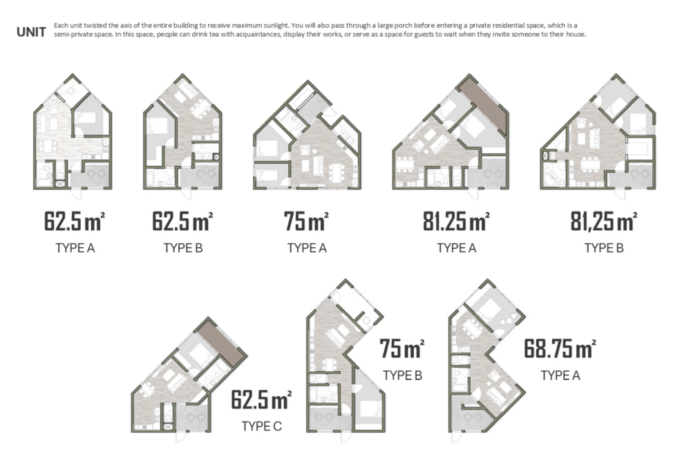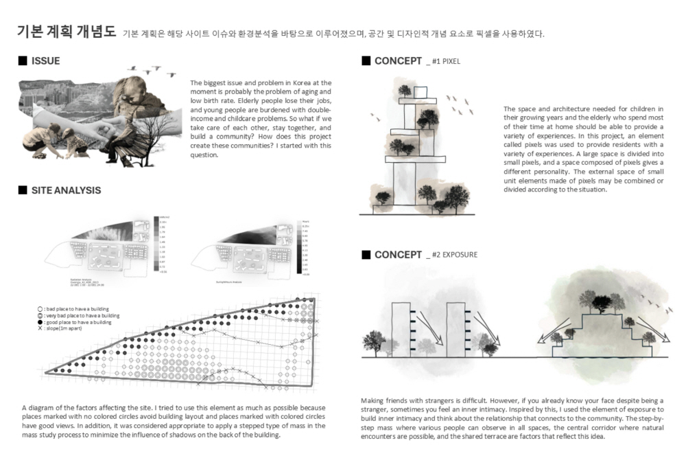 해당 프로젝트는 한국의 저출산과 고령화 문제를 건축적으로 어떻게 해결할 수 있을까에 대한 의문으로 시작하였습니다. 아이들과 노인들에게 적합한 커뮤니티 프로그램과 공간, 그리고 집합주거 단지 내 커뮤니티 촉진을 위한 퍼블릭-프라이빗 공간에 초점을 맞추어 설계를 진행하였습니다. 전반적인 건축 디자인에서는 픽셀이라는 요소를 활용하였고, 내부 및 외부는 노출이라는 공간 개념을 사용하고자 하였습니다.