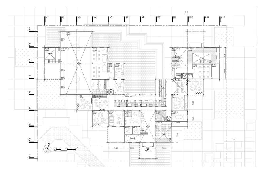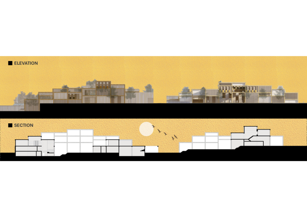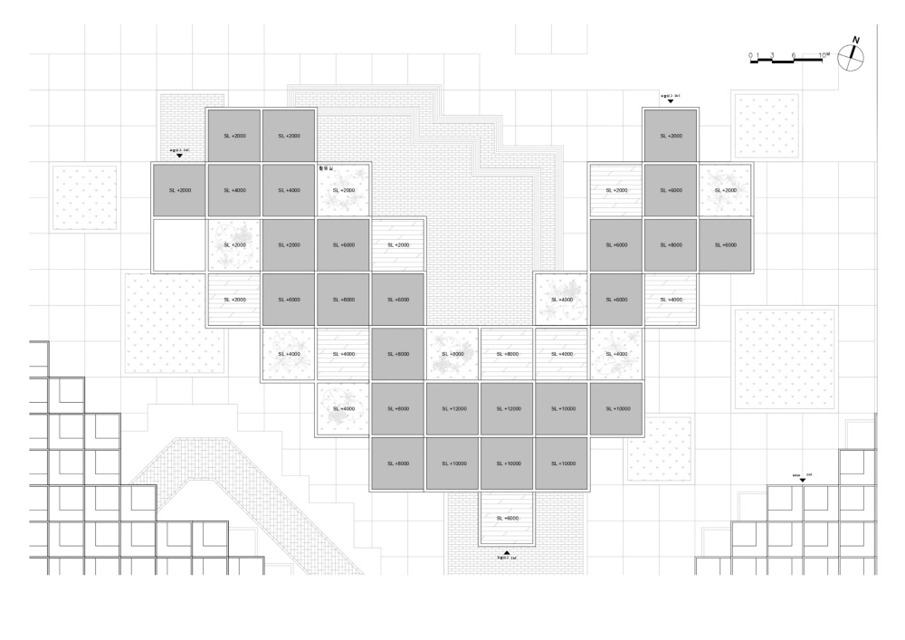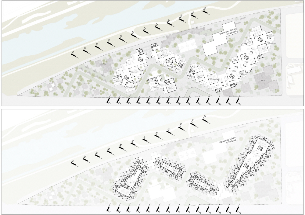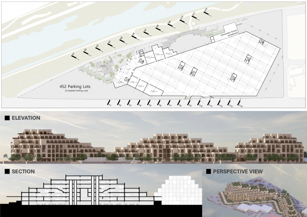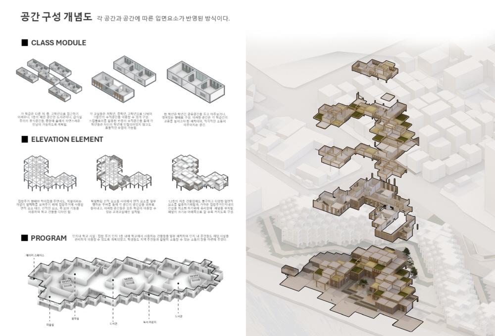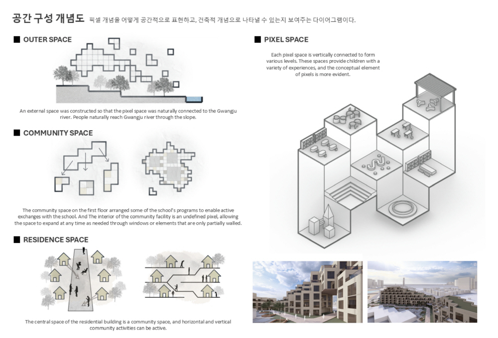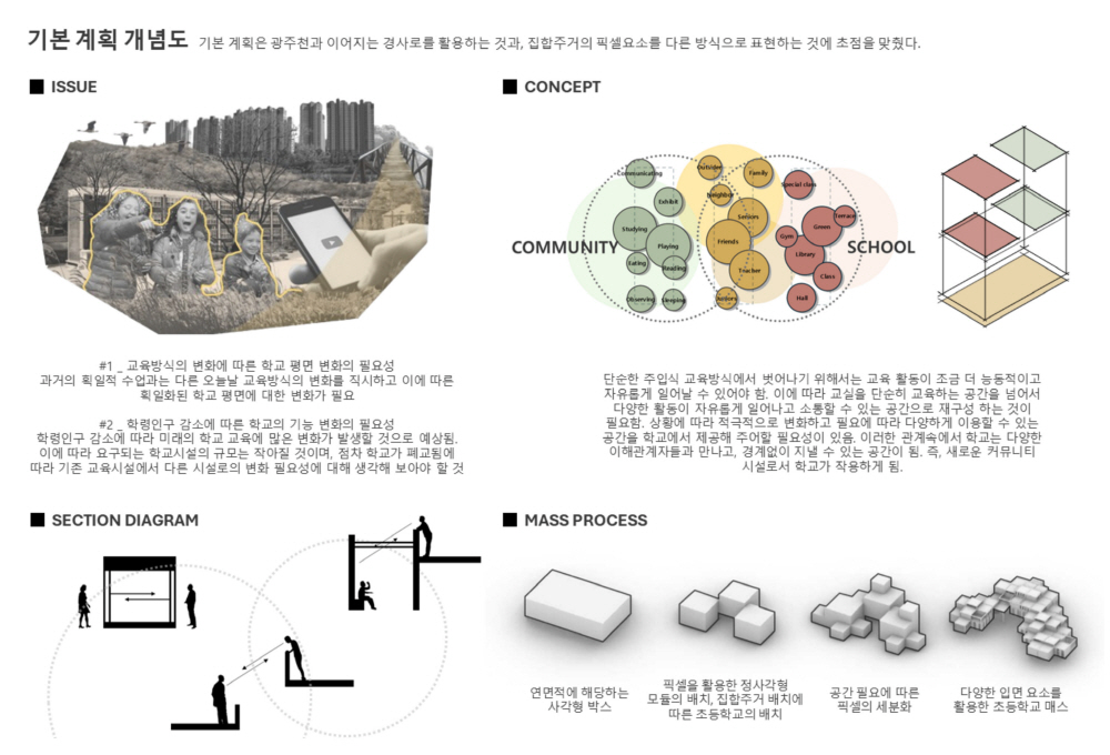 집합주거 단지 내에 위치한 초등학교는 광주천과의 연계를 위해 북쪽의 대지로 선정하였으며, 광주천을 자연스럽게 잇는 동선을 만들기 위해 스킵플로어를 활용하였습니다. 주거 단지와의 조화를 위해 픽셀 개념을 계속 활용하면서도, 학교 건물의 mm를 위해 주거 단지의 면적 요소와 대비되는 선적 요소를 디자인 요소로 활용하고자 하였습니다.