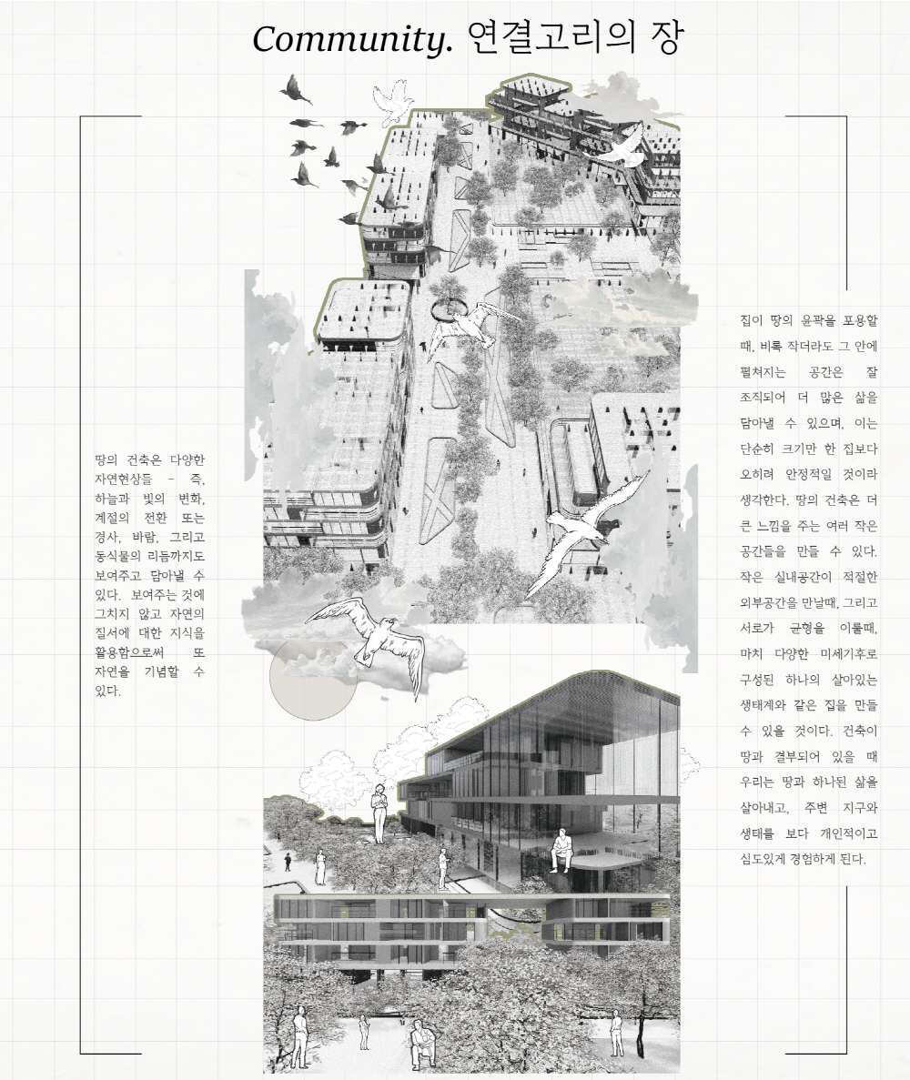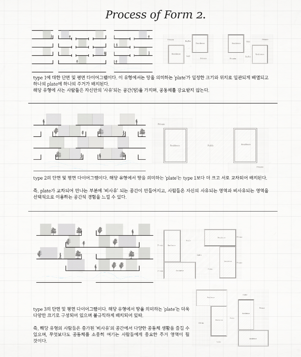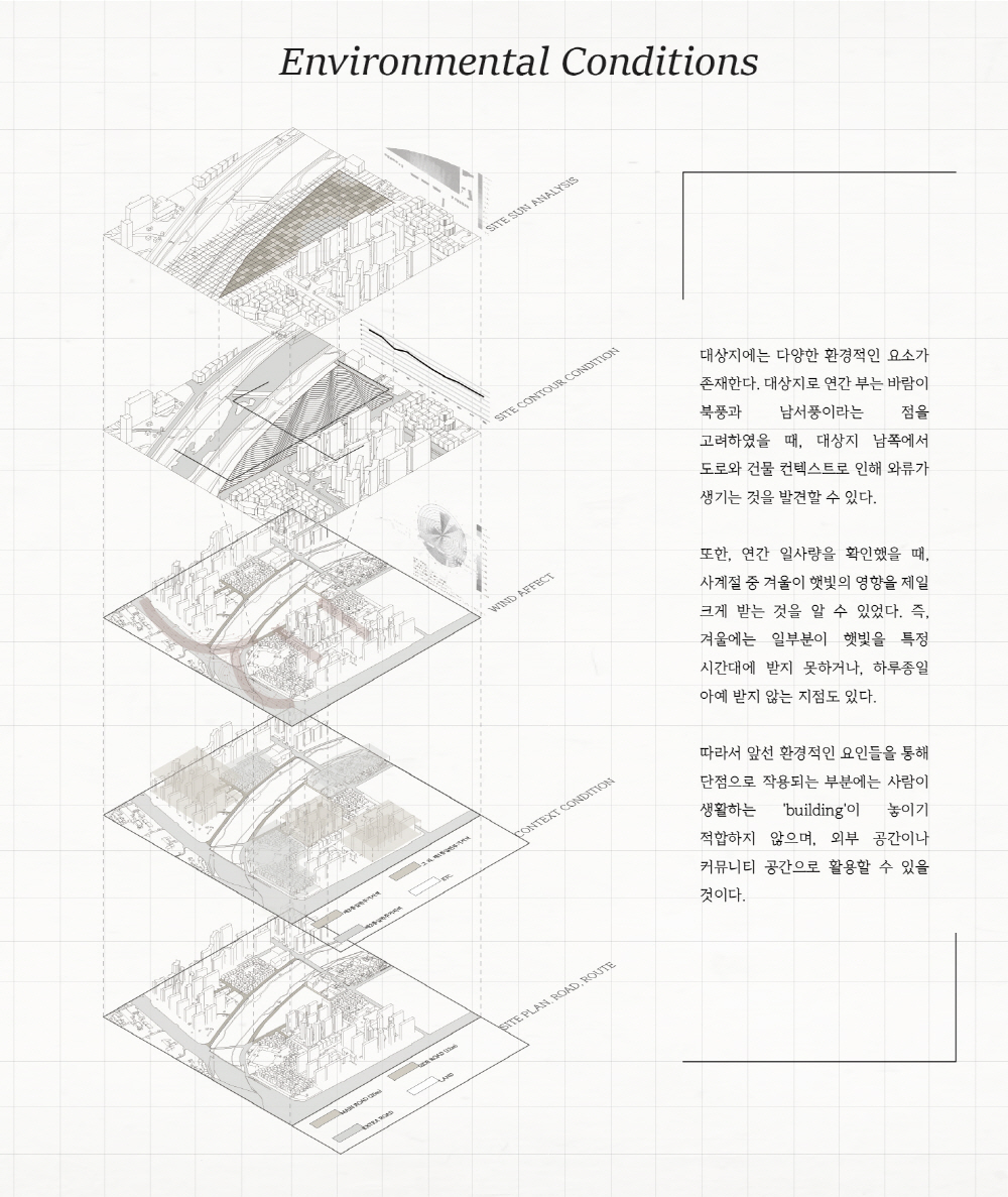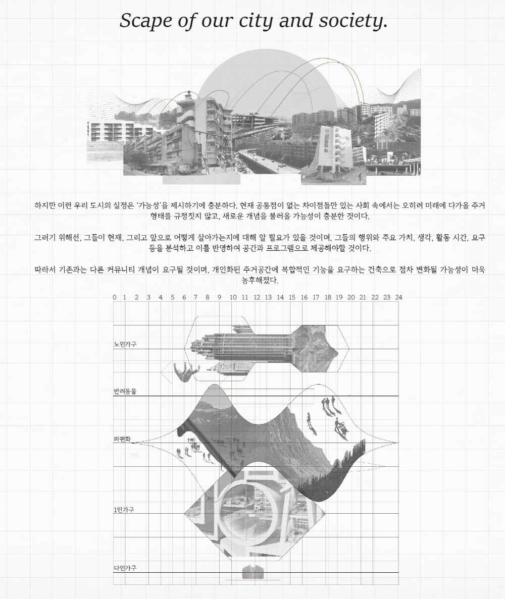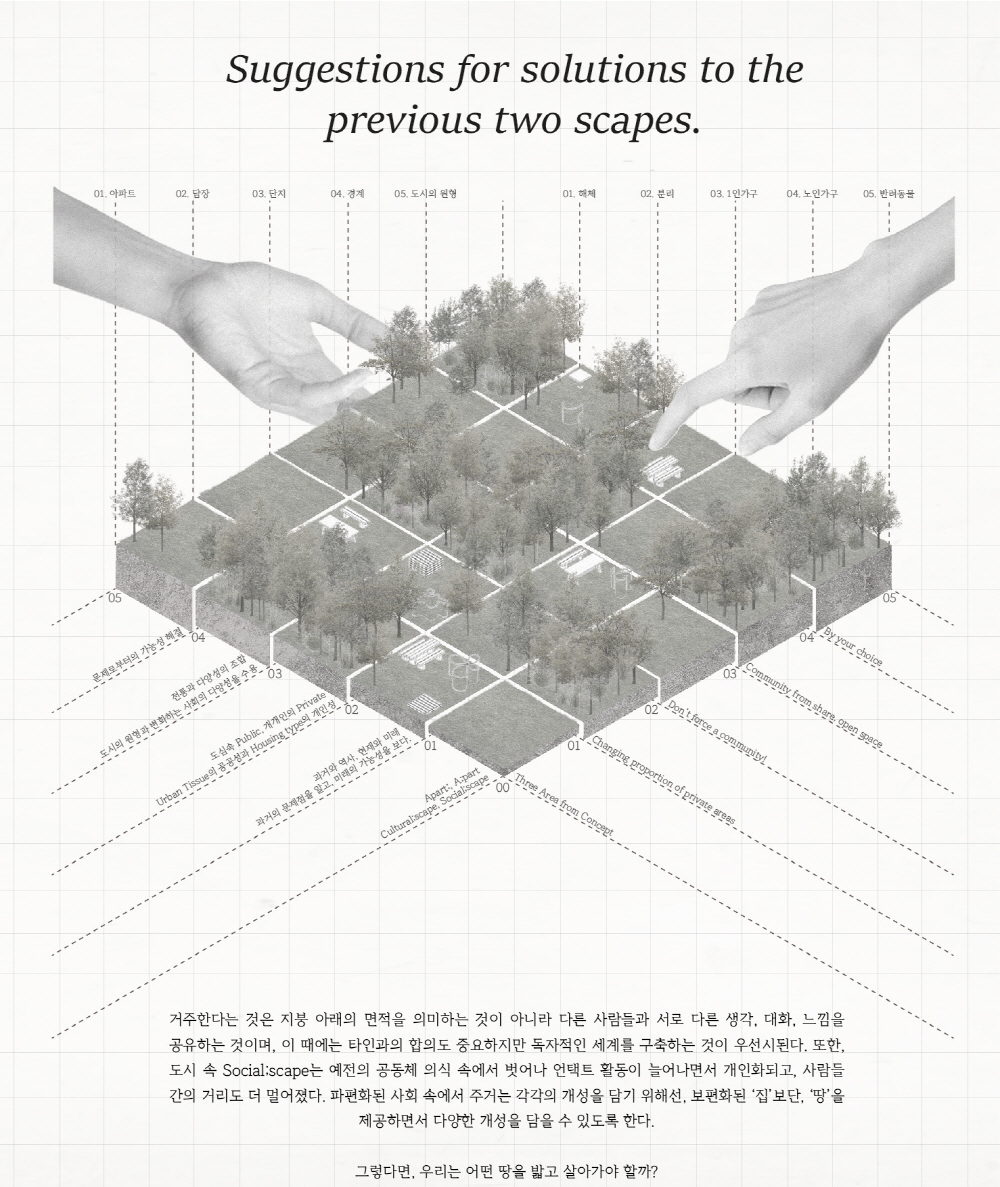 또한, 도시 속 Social;scape는 예전의 공동체 의식 속에서 벗어나 언택트 활동이 늘어나면서 개인화되고, 사람들 간의 거리도 더 멀어졌다. 파편화된 사회 속에서 주거는 각각의 개성을 담기 위해선, 보편화된 ‘집’ 보단, ‘땅’을 제공하면서 다양한 개성을 담을 수 있도록 한다.