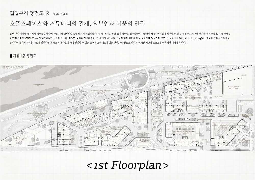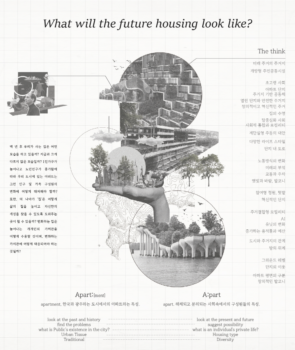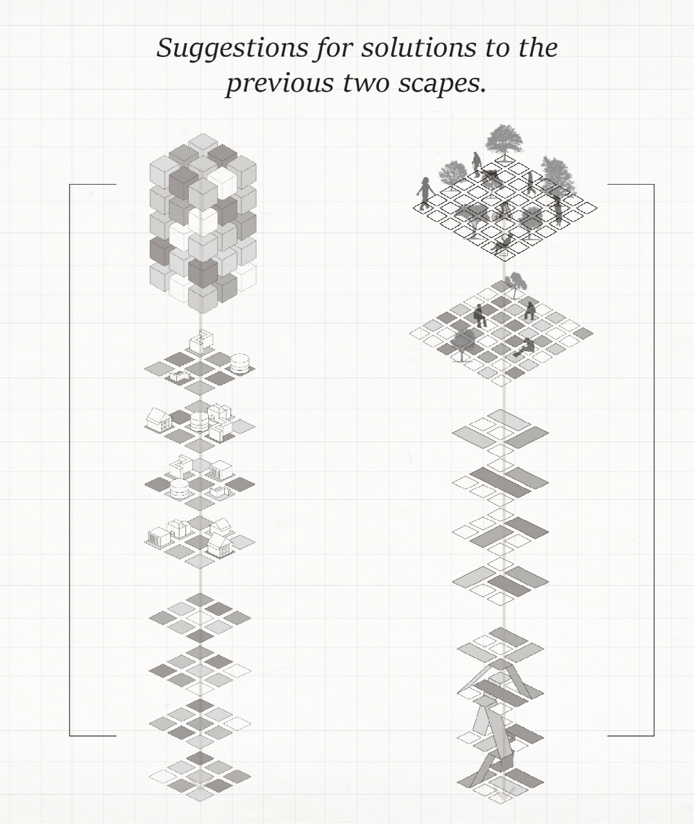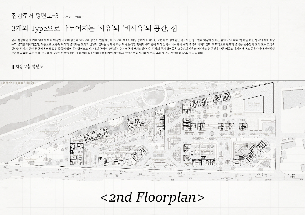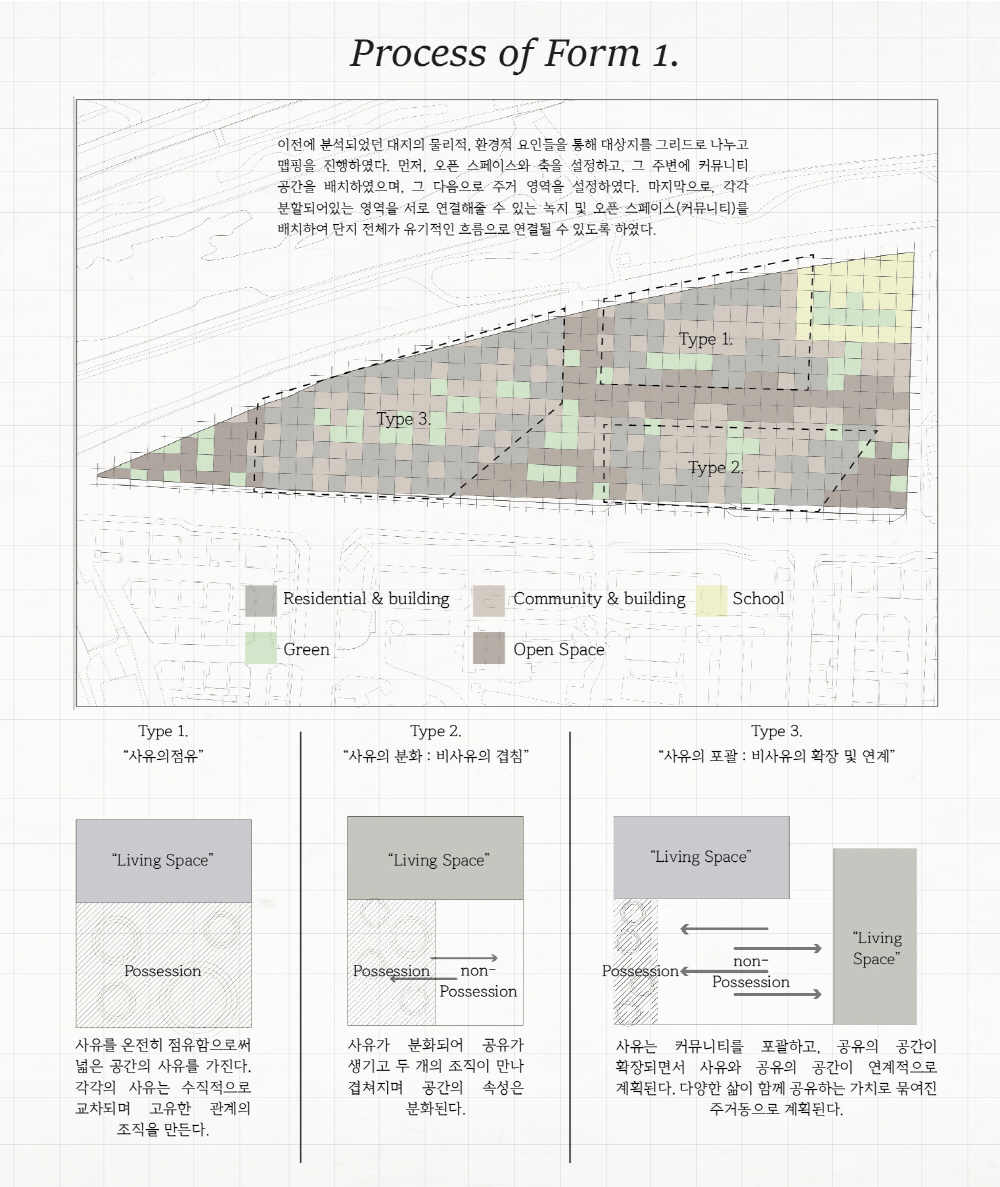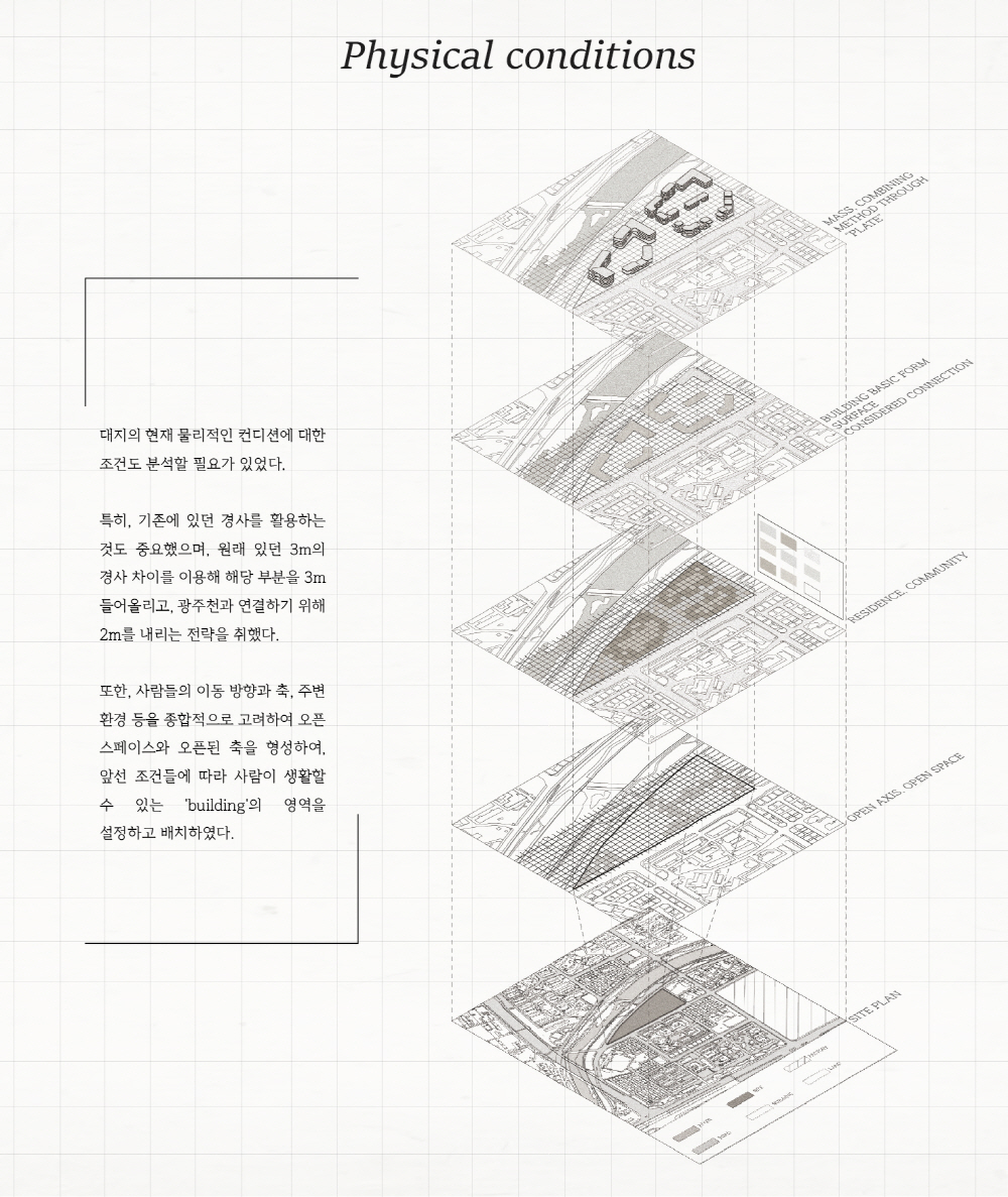 또한, 도시 속 Social;scape는 예전의 공동체 의식 속에서 벗어나 언택트 활동이 늘어나면서 개인화되고, 사람들 간의 거리도 더 멀어졌다. 파편화된 사회 속에서 주거는 각각의 개성을 담기 위해선, 보편화된 ‘집’ 보단, ‘땅’을 제공하면서 다양한 개성을 담을 수 있도록 한다.