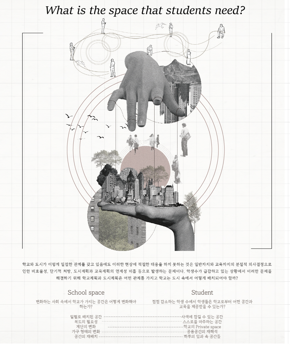 초등학교를 포함하여 학교에 대한 공간은 지난 과거 속에서 많이 변화해 왔다. 하지만, 여전히 동의 배치, 안전 등의 이유로 획일화 되어 있는 공간 구조에서 벗어나지 못하는 것이 현실이다.