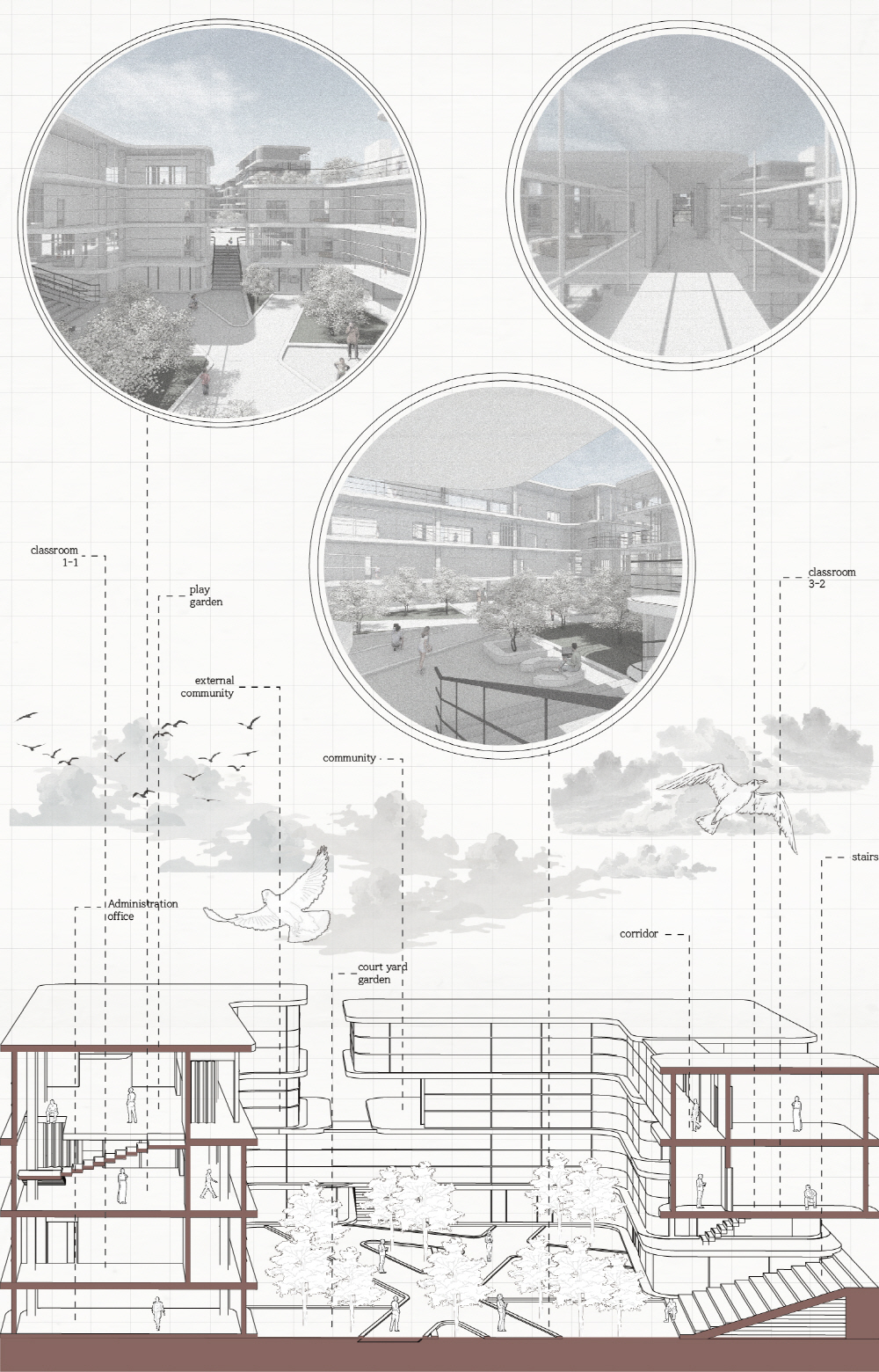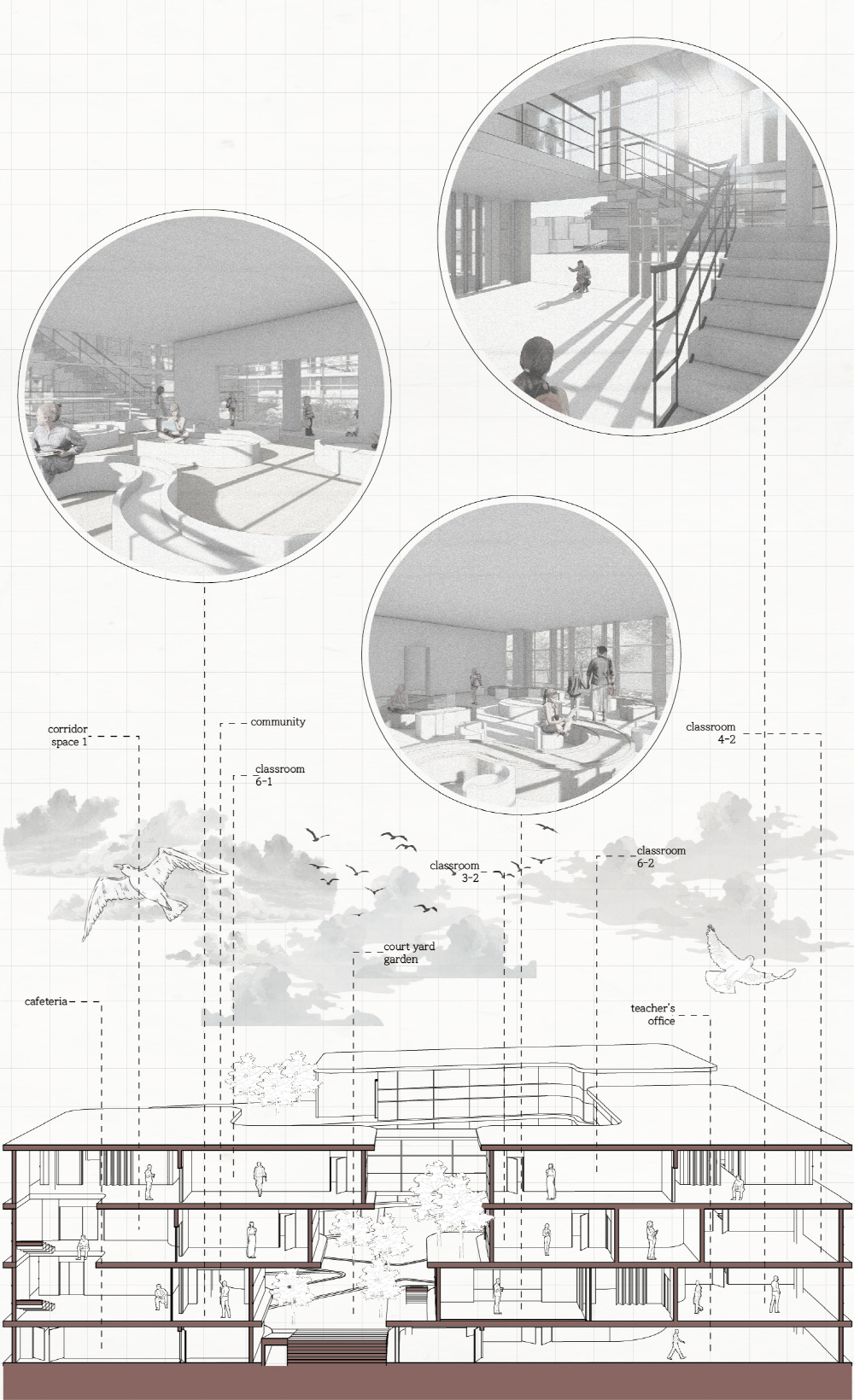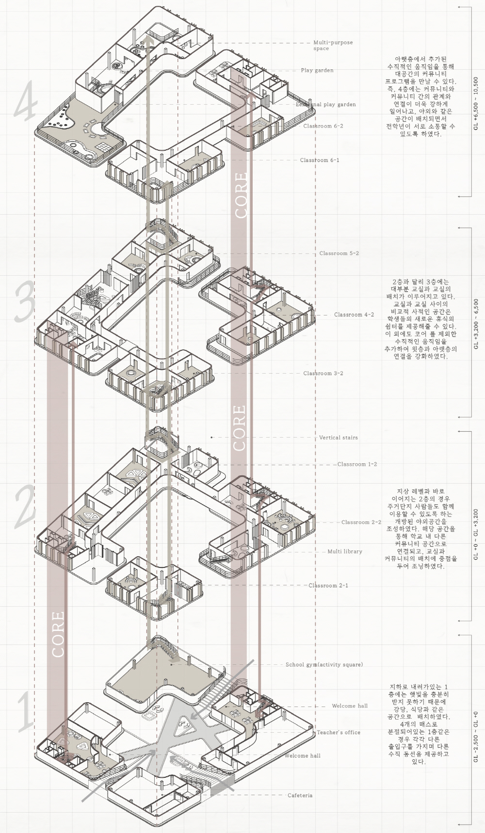 획일화 되어 있는 공간 속에서만 살아왔던 학생들은 수직적으로, 다양한 스케일로 재배치된 새로운 소통과 교류의 장에서 새로운 커뮤니티를 만든다.