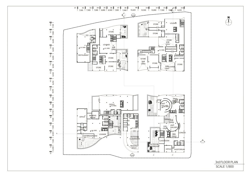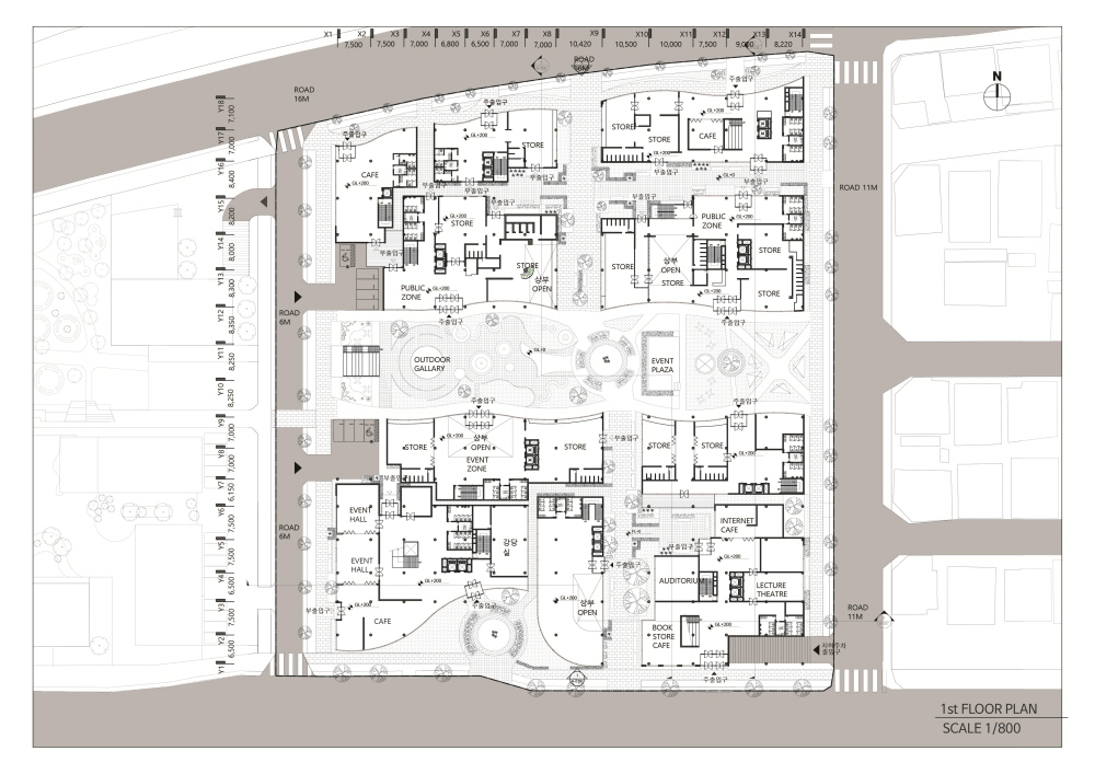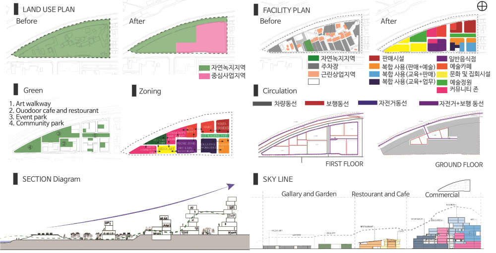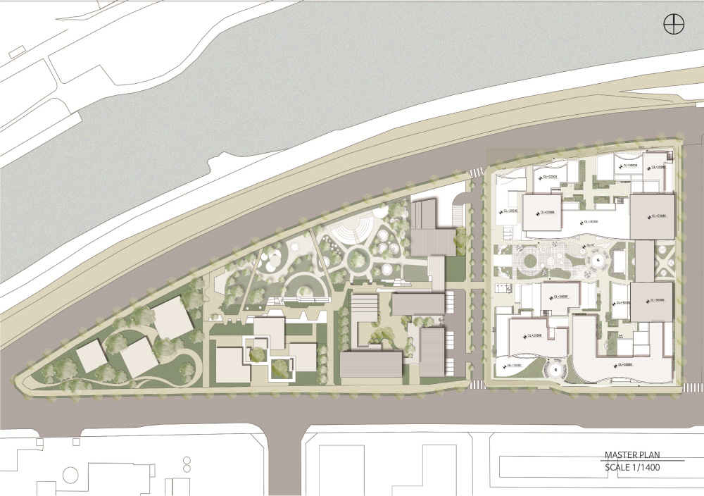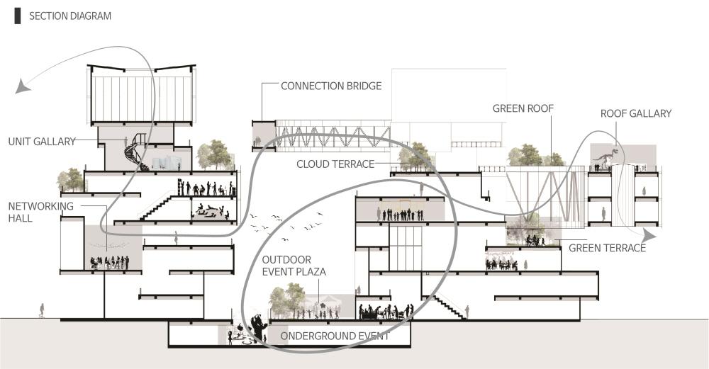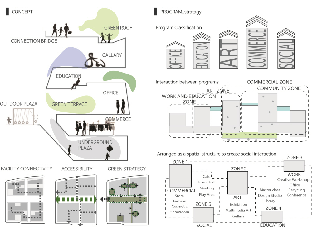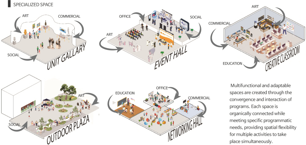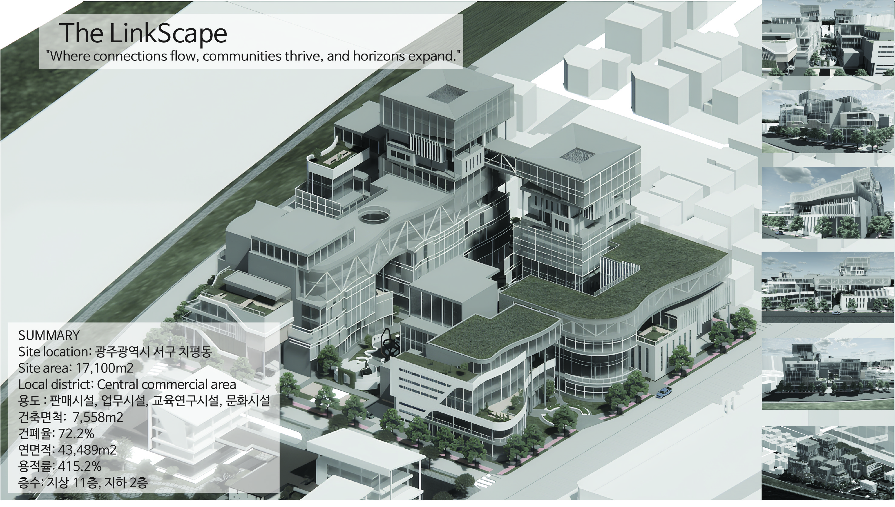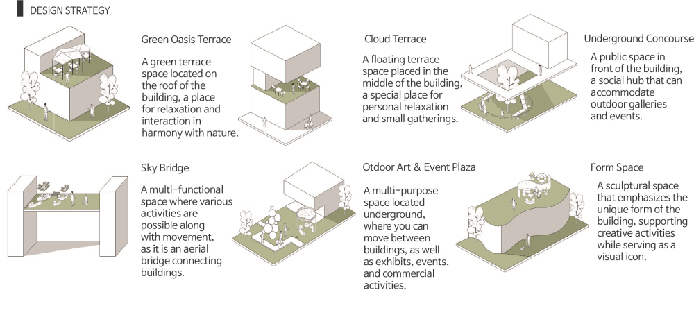 'The Linkscape' is a space composed of independent facilities that are organically connected as a dynamic fabric. Each space has its own function and identity, while providing a flow in which people move, communicate, and create new experiences. The concept does not stop at just physical connections, but also includes social connections between users and a harmonious relationship with the urban environment.