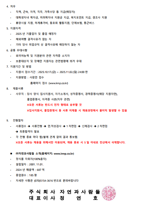 2025년 자연과사람들 신입/경력 채용(자재관리, 품질관리 직무)