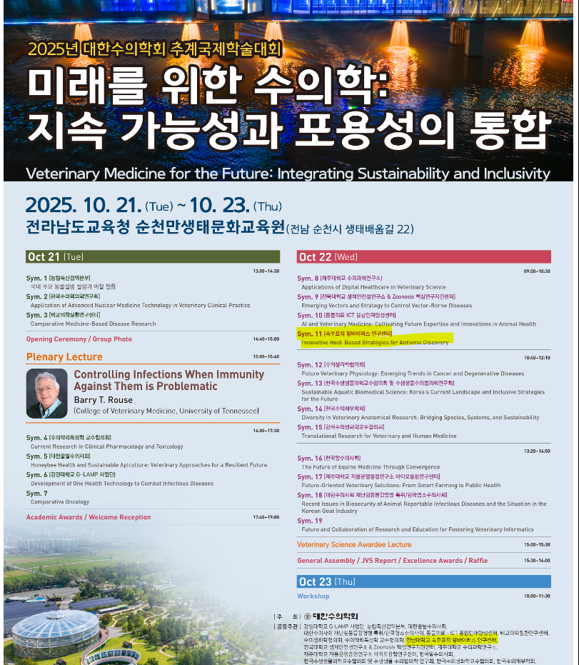 2025 숙주 표적 항바이러스 연구센터 국제심포지엄이 대한수의학회 추계국제학술대회의 일부 세션으로 참여합니다.