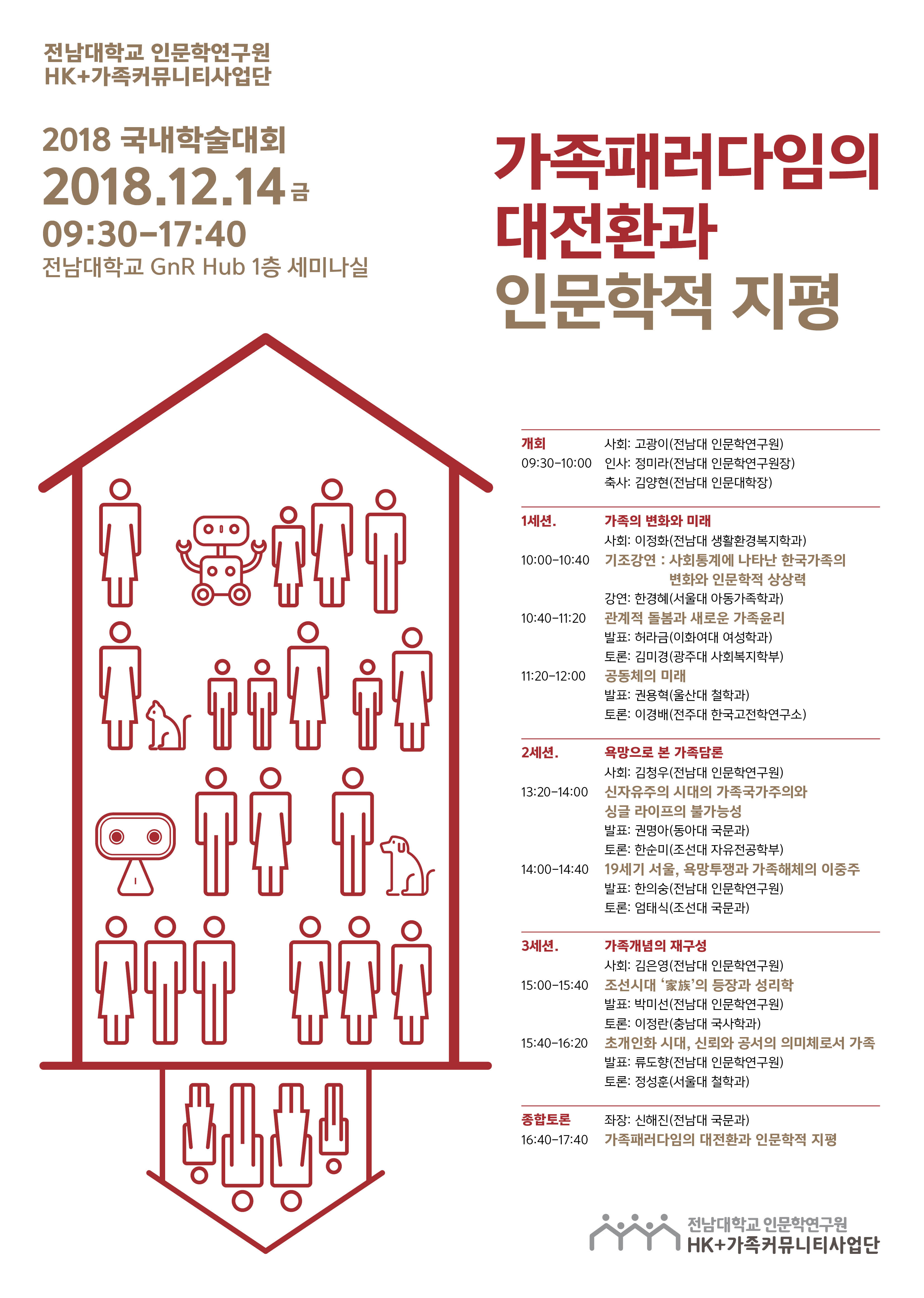 개최 개요 : 전남대학교 인문학연구원은 <초개인화 시대, 통합과 소통을 위한 가족커뮤니티인문학>이라는 아젠다로 2018년 인문한국플러스(HK+) 사업 국가전략 분야에 선정되어 2024년까지 총 7년에 걸쳐 가족과 공동체에 관한 인문기반 다학문‧융복합 연구를 수행한다. 본 학술대회는 7년의 여정을 시작하는 첫 번째 학술대회로서, 그동안 사회과학 분야에서 축적해온 가족연구의 성과를 바탕으로 인문학적 가족연구의 지평을 조망하는 데 목적이 있다.