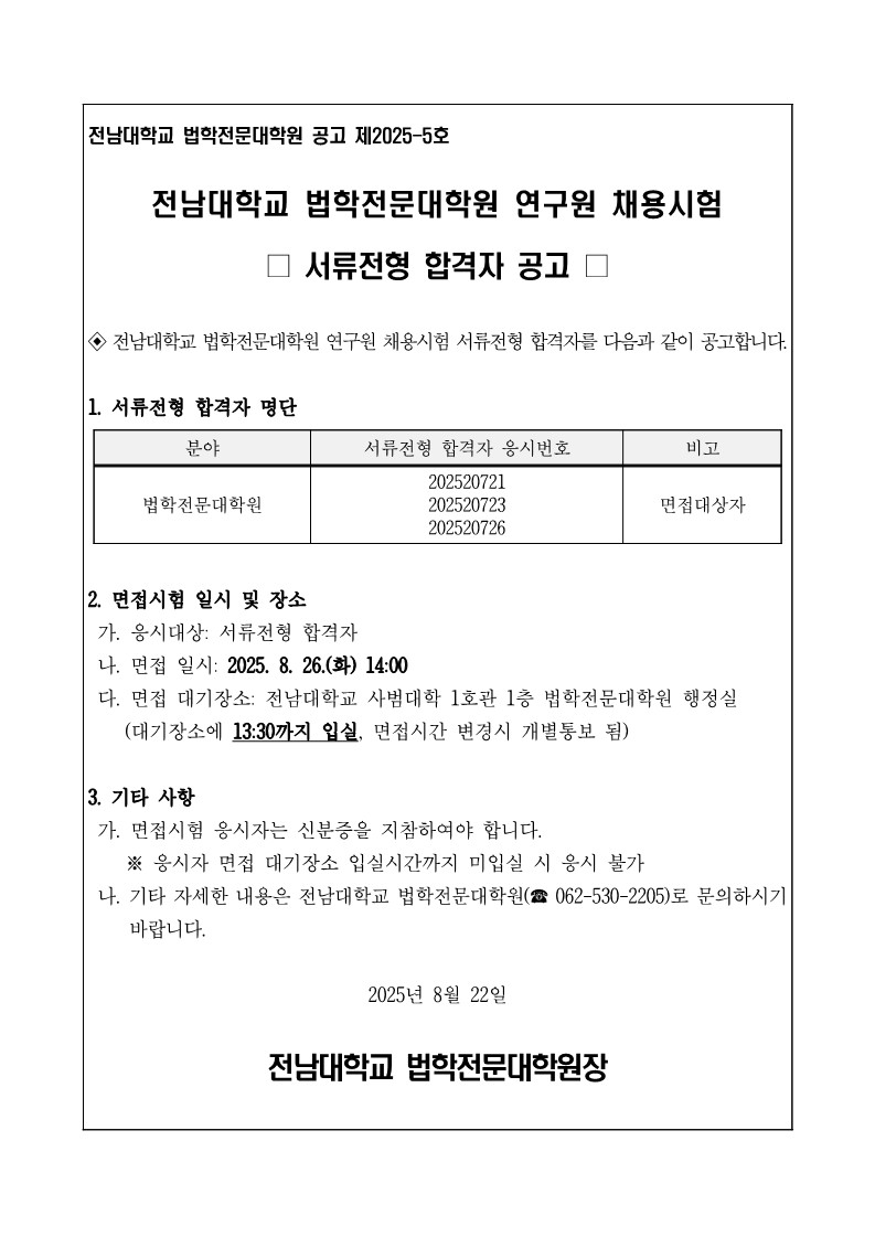 전남대학교 법학전문대학원 연구원 채용시험 서류전형 합격자 및 면접일정 공고