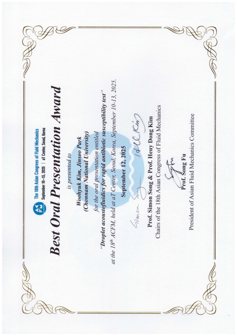 9일 전남대에 따르면, 기계공학과 김우혁 박사과정(지도교수 박진수)의 발표논문 ‘Droplet Acoustics for Rapid Antibiotic Susceptibility Test’가 지난 9월 서울 aT센터에서 열린 ‘The 18th Asian Congress of Fluid Mechanics (이하 ACFM 2025)’에서 ‘Best Oral Presentation Award’로 선정됐다.