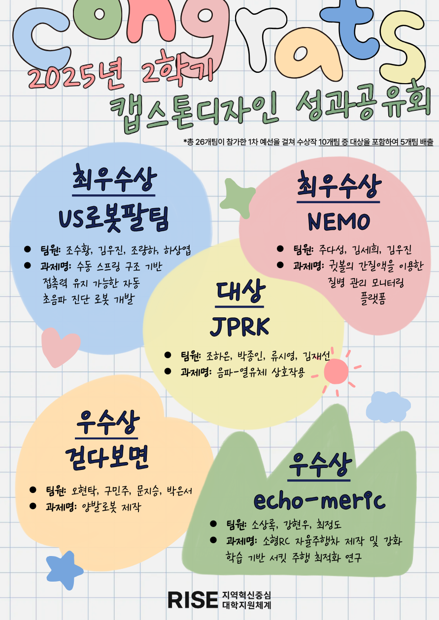 지난 12월 10일에 열린, 전남대학교RISE사업단이 주최한 「2025년 2학기 캡스톤디자인 성과공유회」에서 기계공학부 학생들이 뛰어난 성과를 거두며 학부의 교육 경쟁력을 다시 한 번 입증하였다.