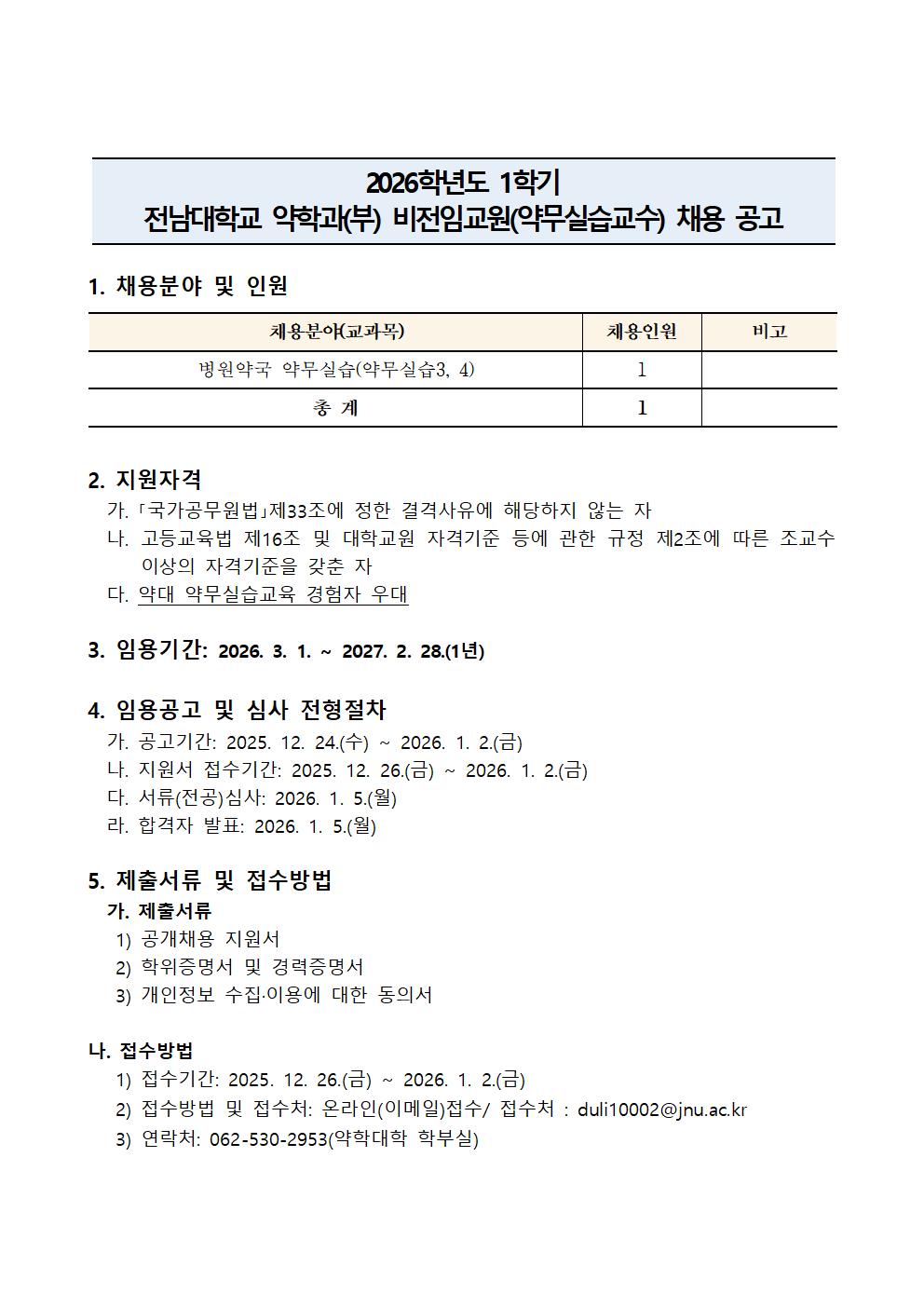 2026학년도 1학기 비전임교원(약무실습교수) 공개채용 공고( ~ 26년 1월 2일(금) 접수 마감)