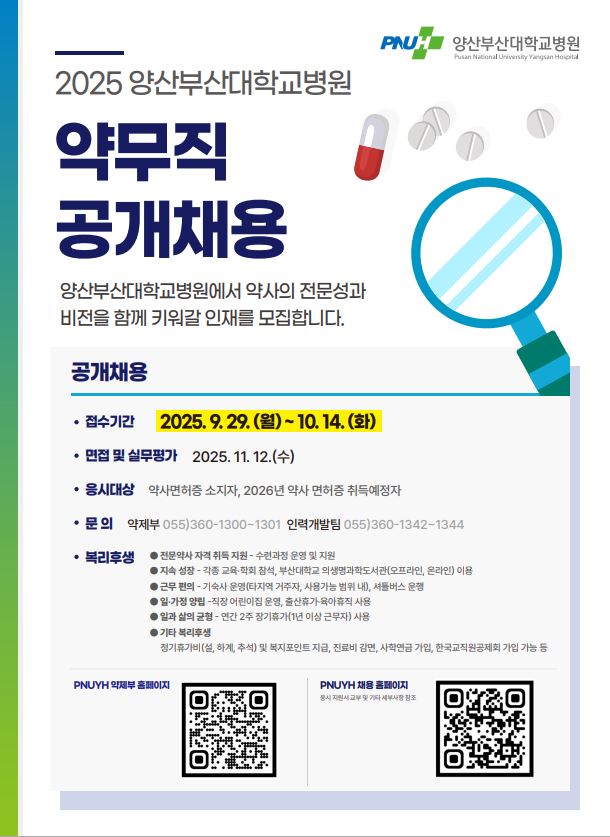 2025년 양산부산대병원 약무직 채용공고( ~ 10. 14 마감)