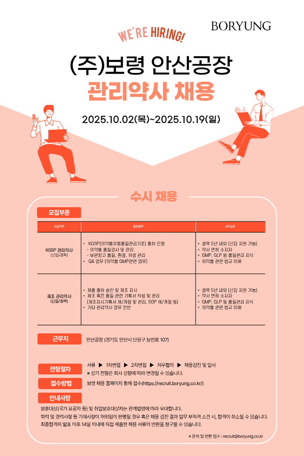 (주)보령 안산공장 관리약사 채용(~10.19.)