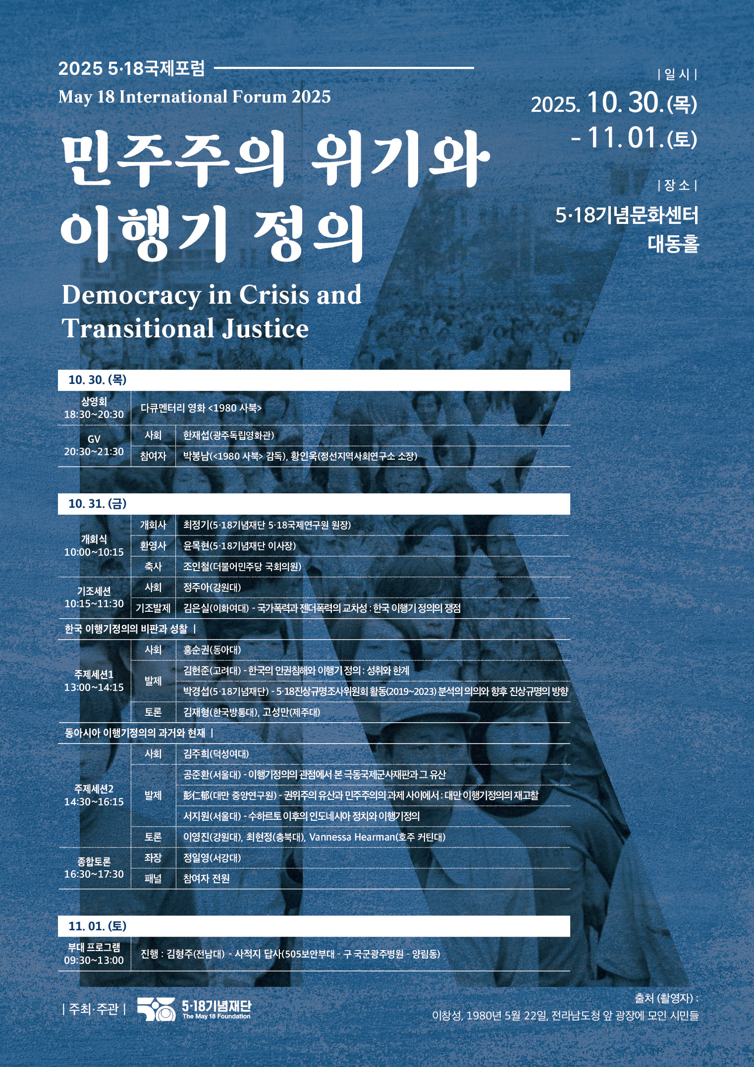 - 행사명 : 2025 5·18 국제포럼 '민주주의 위기와 이행기 정의'