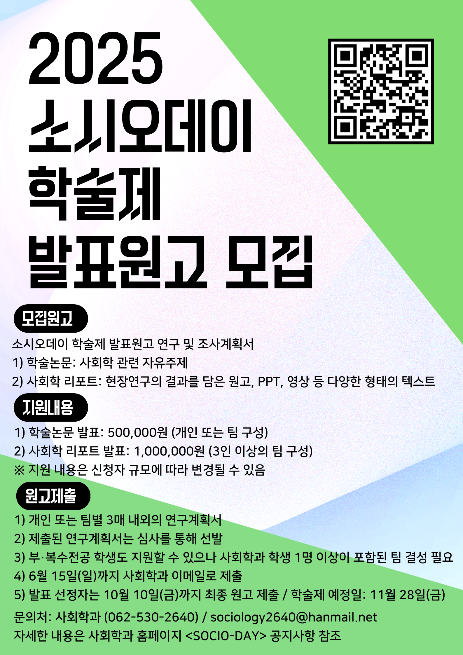 2025년 11월 28일 금요일로 예정되어 있는 사회학과 소시오데이 학술제 발표원고를 모집합니다.