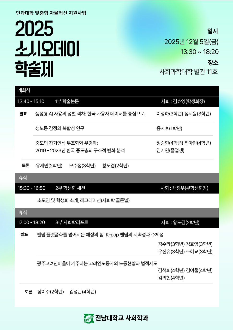 2025 사회학과 소시오데이 학술제 행사를 다음과 같이 안내드립니다.
