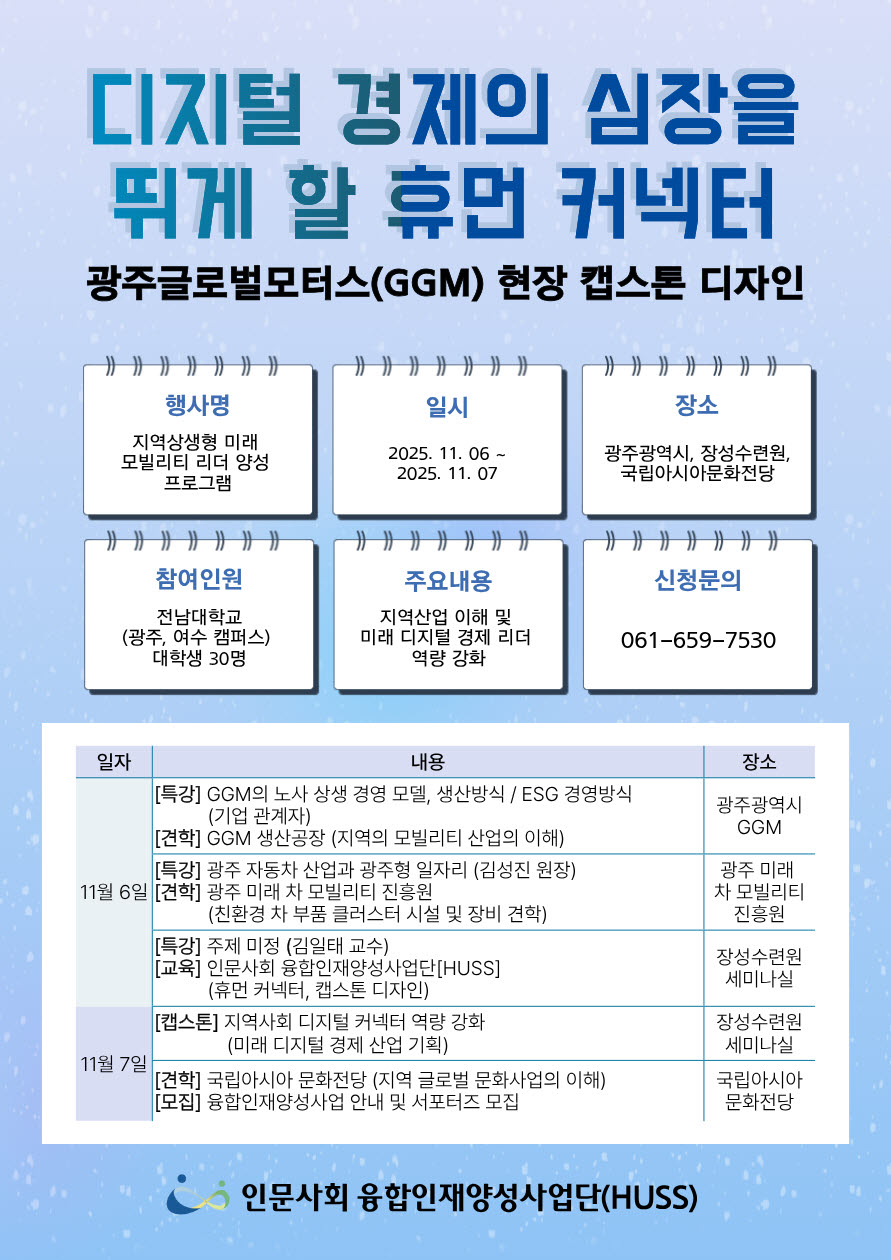 신청: 취업.진로포털- 취업프로그램 - 단과대학 프로그램 - [HUSS]지역상생형 미래모빌리티 리더 양성 프로그램 참여자 모집