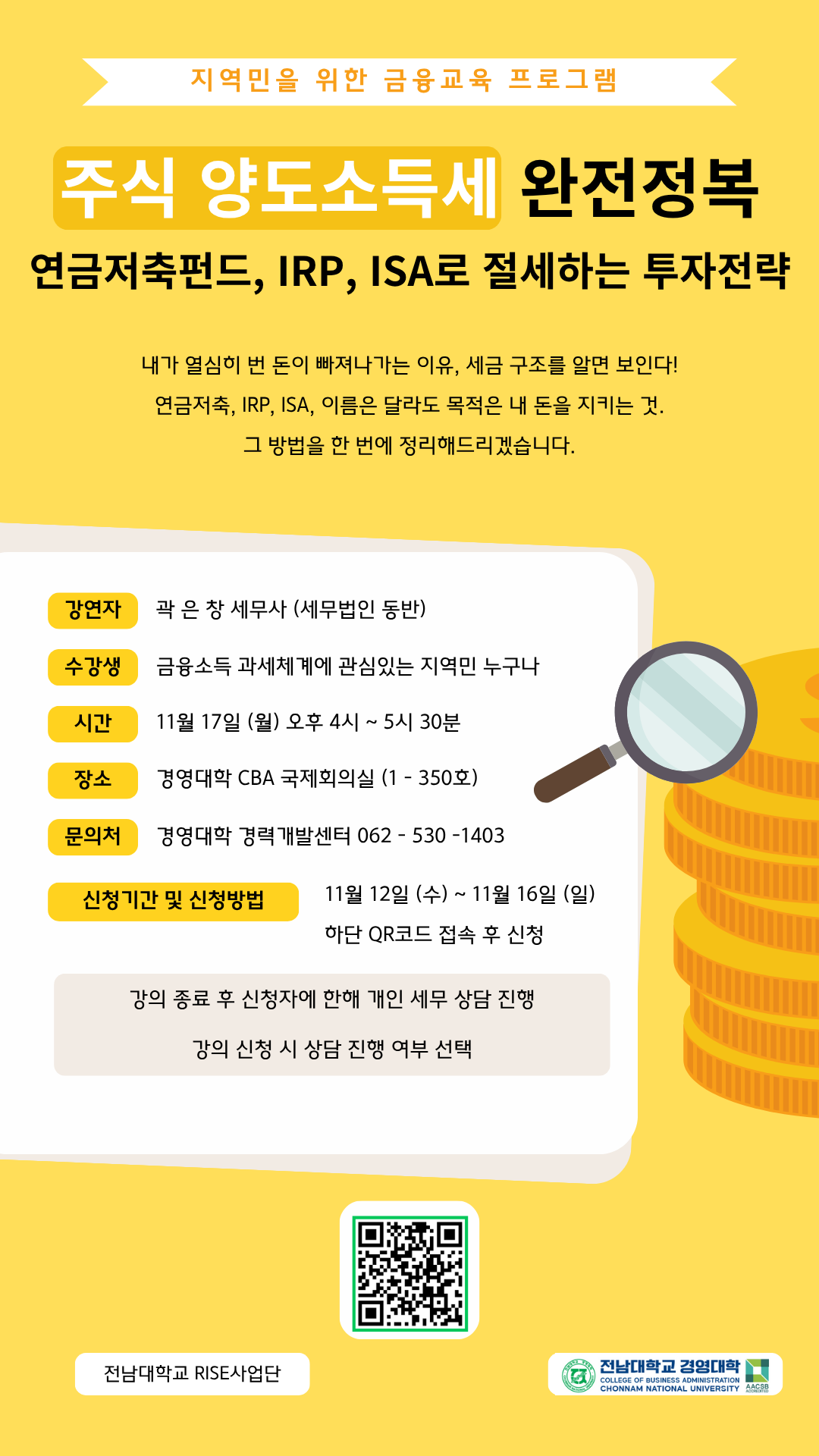 fnctId=bbs,fnctNo=1615 글번호 939663 [전남대학교 RISE 사업] 지역민을 위한 금융교육 프로그램 - 주식 양도소득세 완전정복(11월 17일) 작성일 2025.11.12 수정일 2025.11.14 작성자 관리자 조회수 829 첨부파일 첨부파일이(가) 없습니다.