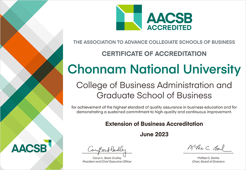 전남대학교 경영대학 및 경영전문대학원은 2012년 최초로 AACB인증을 획득했으며, 재인증 실사단의 방문 평가 과정을 거쳐 2018년 6월과 2023년 6월 3회 연속 인증이 확정되었다. 국내에서는 16개 대학이 인증을 받았으며, 지방소재 학교로는 전남대학교와 경북대학교 두 곳 뿐이고, 지방소재 경영전문대학원중 AACSB 인증을 받은 학교는 전남대학교가 유일하다.