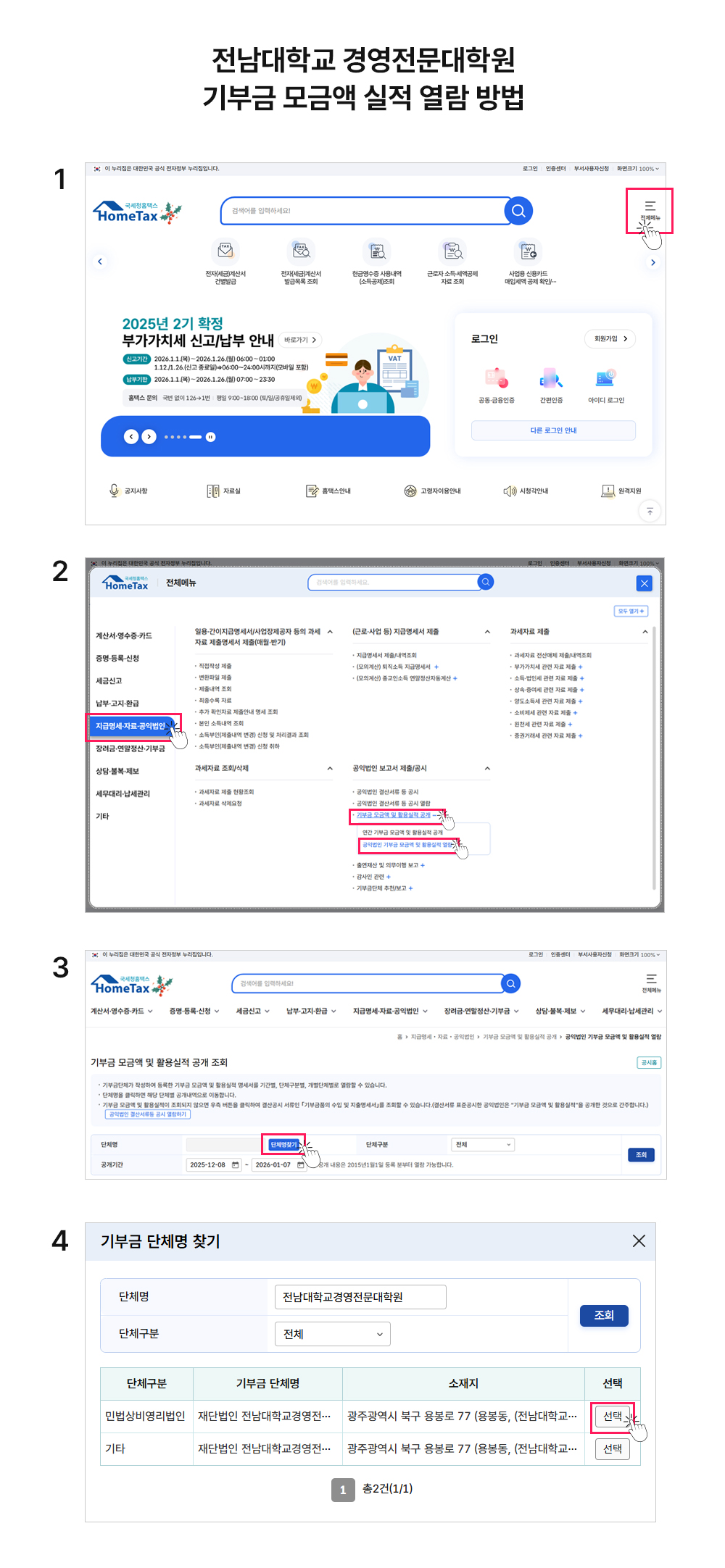 기부금 모금액 실적 열람 방법 국세청 홈택스 - 지급명세ㆍ자료ㆍ공익법인 > 기부금 모금액 및 활용실적 공개 > 공익법인 기부금 모금액 및 활용실적 열람 검색어 : 전남대학교경영대학 기부금 열람 방법 다운로드홈택스 바로가기 fnctId=bbs,fnctNo=3844 RSS 2.0 총 7 개의 게시물이 있습니다. 게시물 검색 제목 작성자 게시글 리스트 재단안내-연간모금액및활용실적 번호 제목 작성자 작성일 조회수 첨부파일 전체게시판공지 경영대학] AI 면접 스튜디오 공간 사용안내 괸리자 2022.07.13 6405 7 2025년도 사업실적 및 결산자료 관리자 2026.03.23 9 6 2024년도 사업실적 및 결산자료 관리자 2026.03.23 10 5 2023년도 사업실적 및 결산자료 관리자 2026.03.23 9 4 2022년도 사업실적 및 결산자료 관리자 2026.03.23 11 3 2021년도 사업실적 및 결산자료 관리자 2026.03.23 11 2 2020년도 사업실적 및 결산자료 관리자 2026.03.23 9 1 재단법인 전남대학교 경영대학 학술장학재단 정관 관리자 2026.03.23 9 처음 11 1 끝