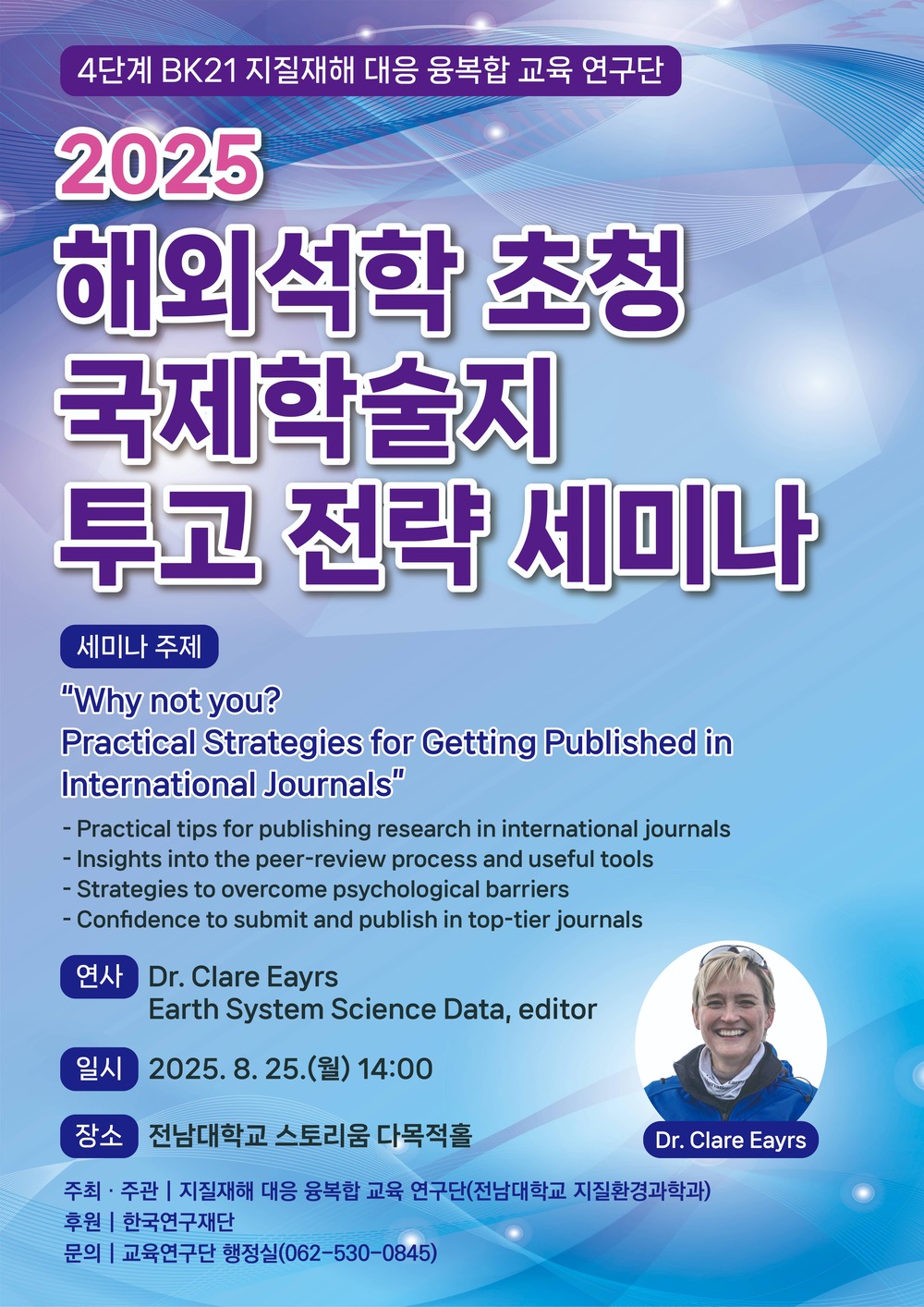 4단계 BK21 지질재해 대응 융복합 교육연구단(단장: 장태수)에서 주최·주관하는「2025 해외석학 초청 국제학술지 투고 전략 세미나」가 개최됩니다.