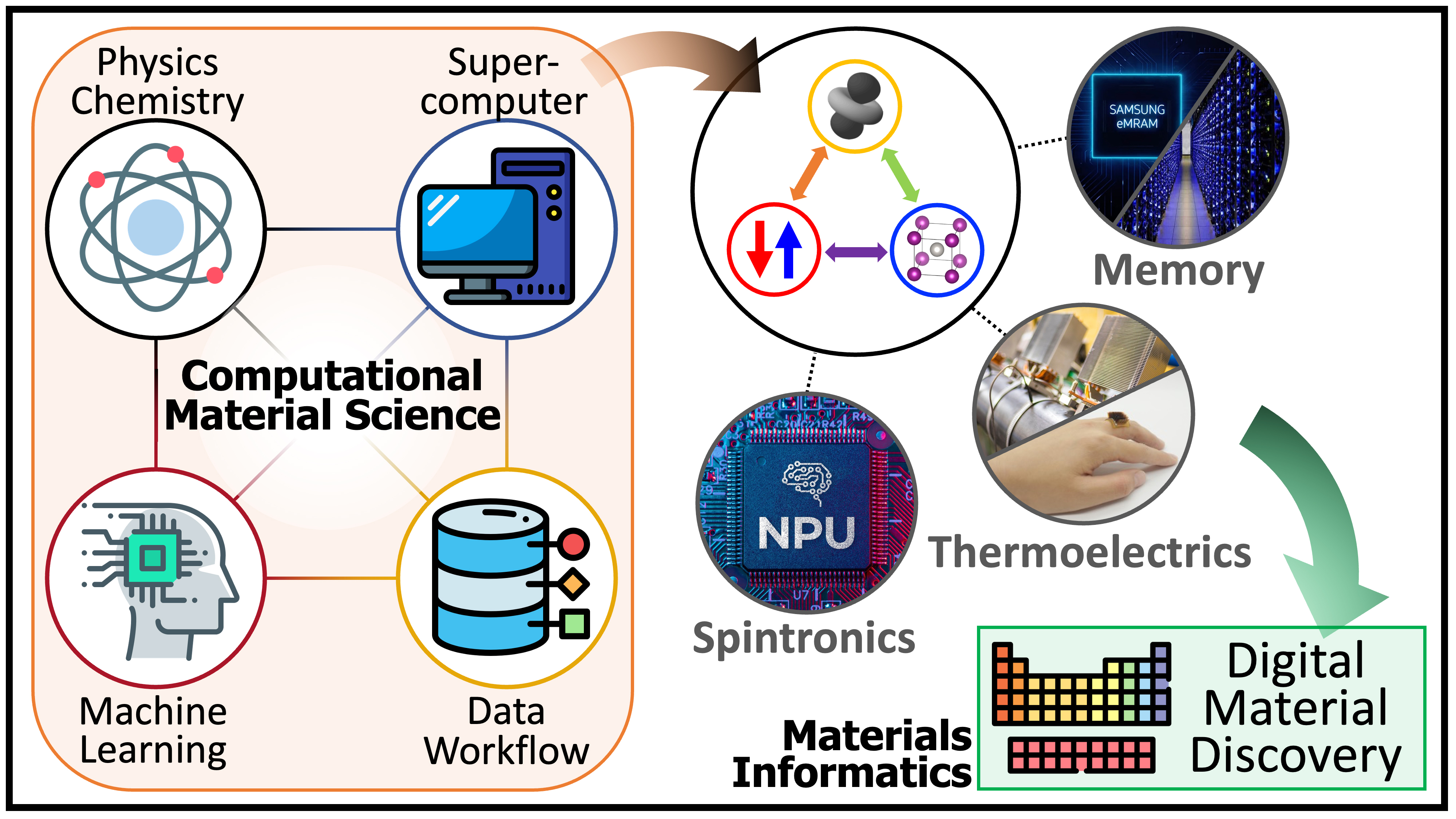 | 재료정보이론연구실은 물리학적/화학적 모델을 기반으로 슈퍼컴퓨터를 활용하여 다양한 소재의 물성을 예측하고 그 근원을 분석하는 연구를 중점적으로 수행합니다. 금속과 반도체의 전자적, 자기적, 광학적, 기계적, 열적 성질을 원자단위 시뮬레이션을 통해 탐사하여 미래형 메모리소자 및 열전소자 개발을 하고 있습니다. 또한, 금속과 반도체의 계면 연구를 통해 수송특성과 같은 산업적 한계 극복에 기여합니다. 더불어, 소재 데이터베이스 구축을 기반으로 기계학습 및 심층학습 도구를 활용한 신소재 개발을 추진하고, 실험과의 긴밀한 공동연구를 통해 신소재공학의 연구영역을 확장하고자 합니다. |